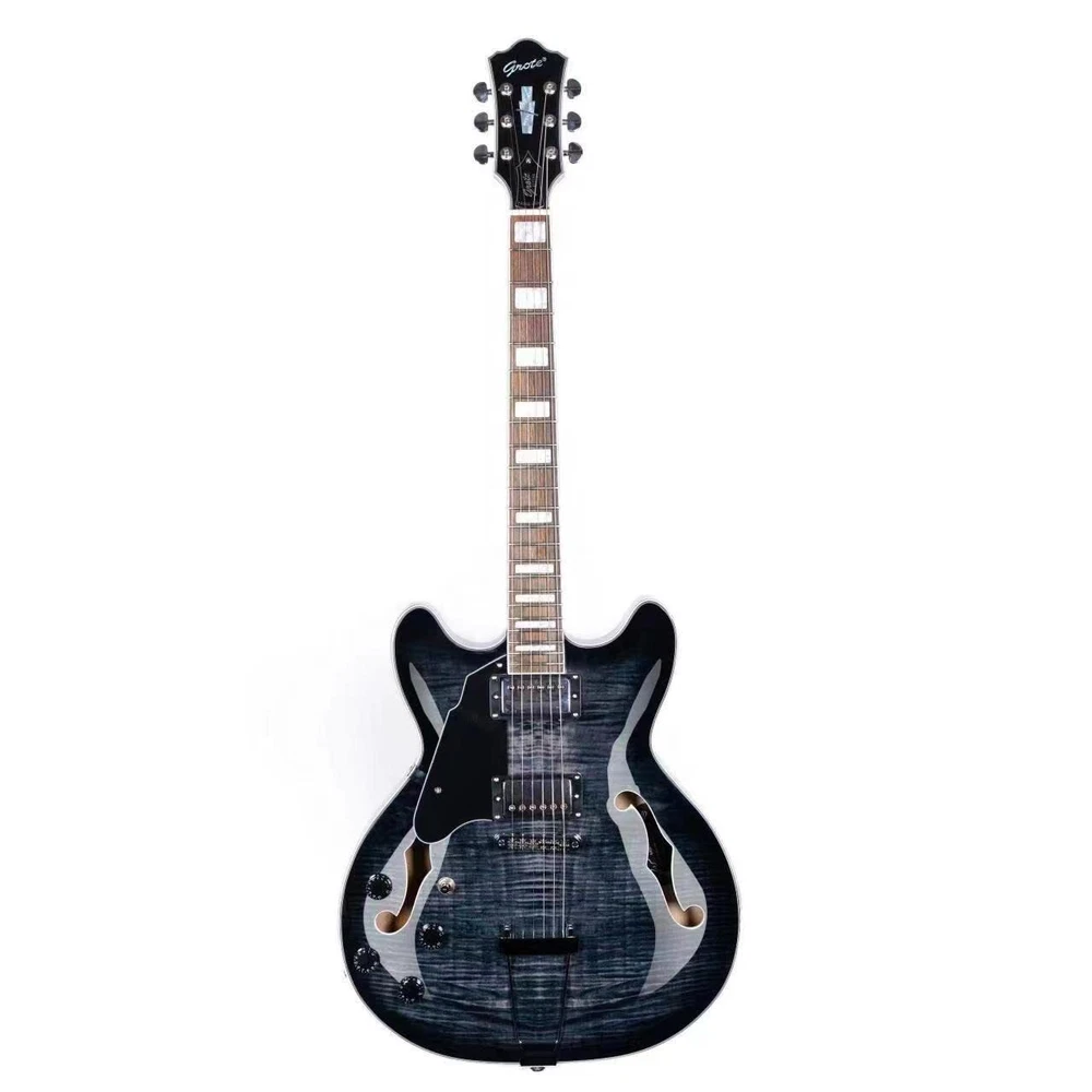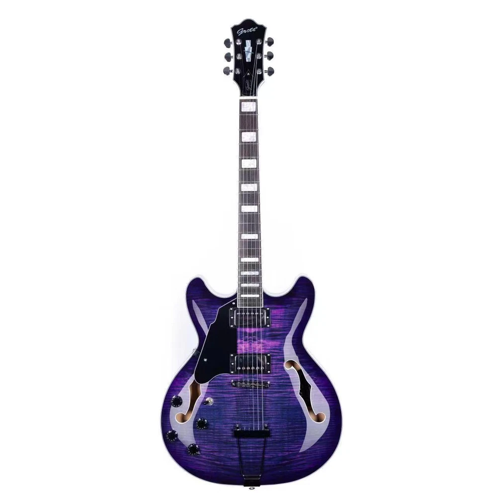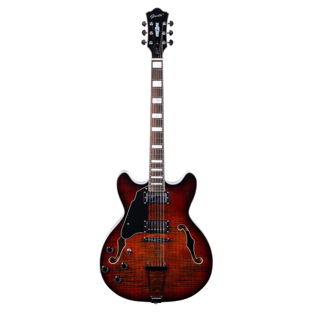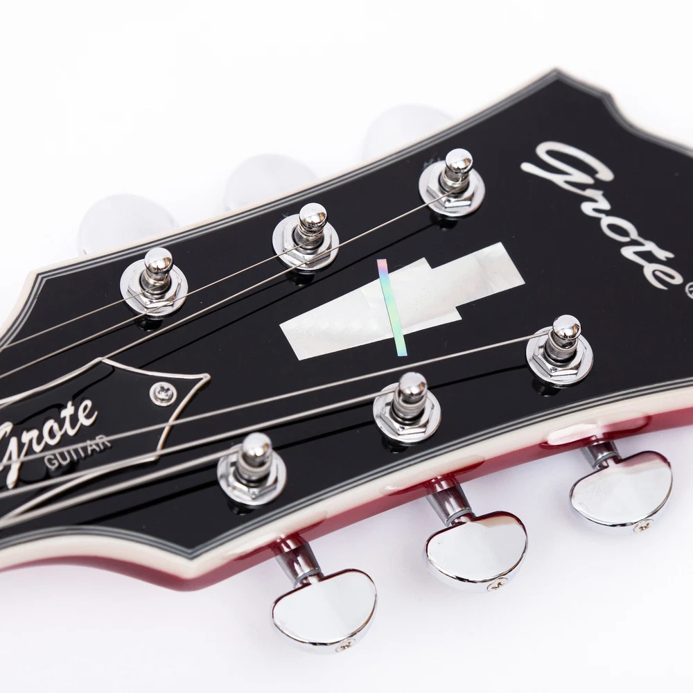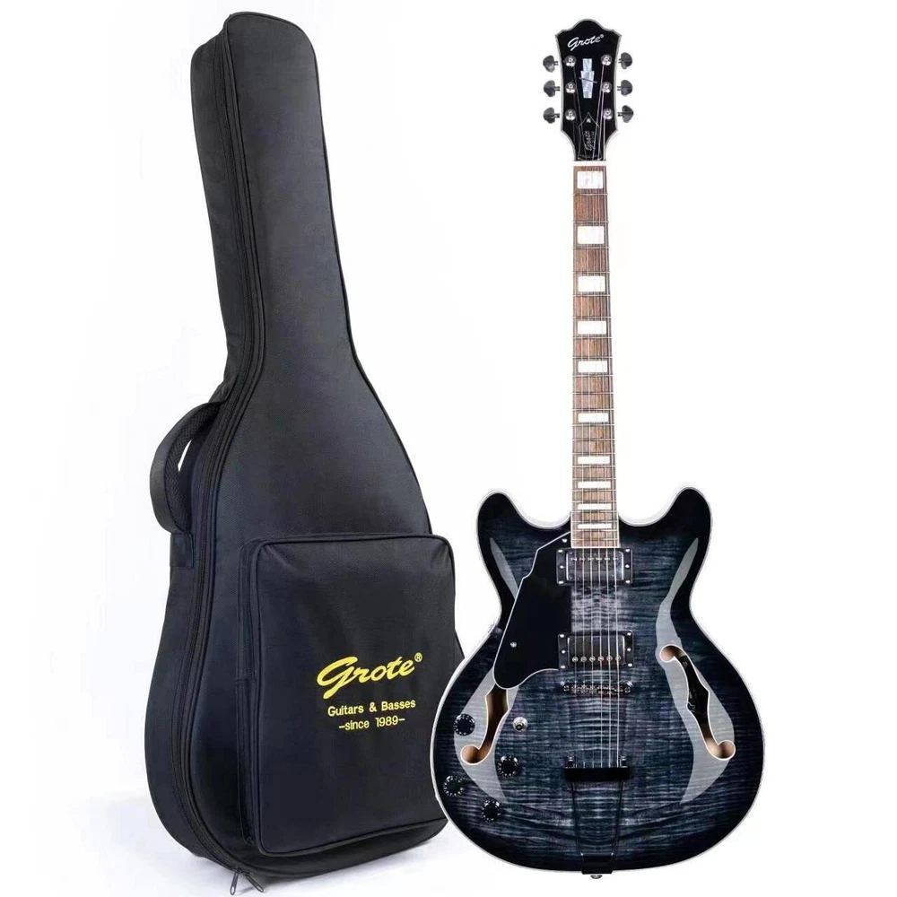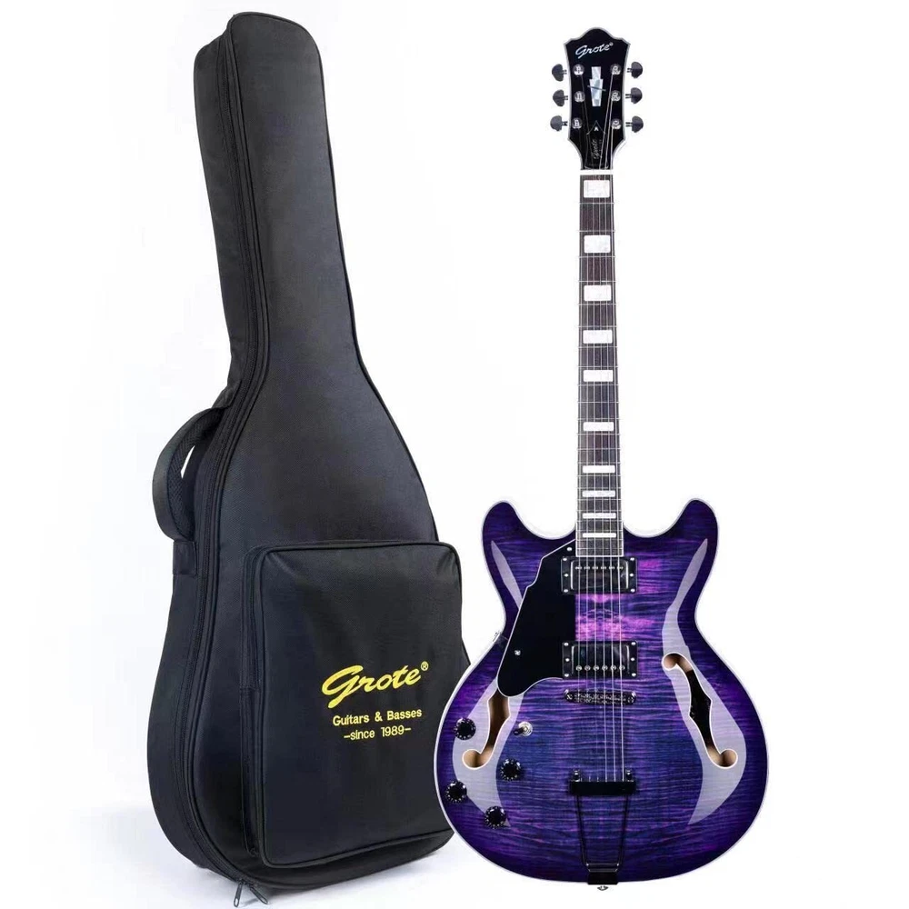 The perfect combination of unique style and left-handed design with our reverse electric guitar. The semi-hollow body made of high-quality basswood produces a warm and rich tone with excellent sustain, while the stunning maple printed design adds a touch of personality and style.Left-handed players can now enjoy a unique and inspiring playing experience with a guitar that is specifically designed for their needs. The Grote laser anti-counterfeiting label that you are getting an authentic and high-quality instrument, while the metal truss rod cover provides extra durability and protection. Designed for powerful, high-gain tones and a thicker, fuller sound, our humbucker pickups offer a level of versatility that can't be matched. Whether you're playing heavy metal, classic rock, or blues, our guitar will provide a dynamic range of sound that will have you shredding like a pro. The rosewood fingerboard on this electric guitar adds a touch of elegance and warmth to its already exceptional sound and playability. With its smooth surface and rich, resonant tone.