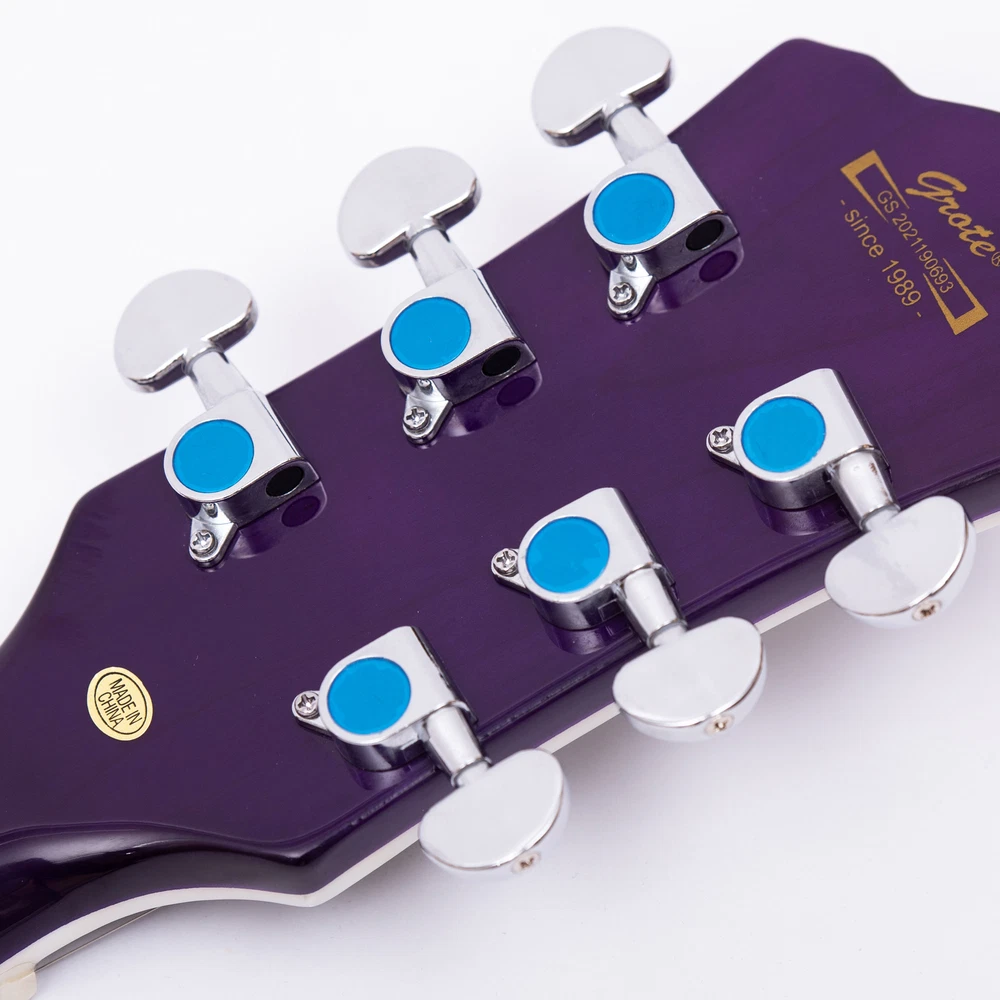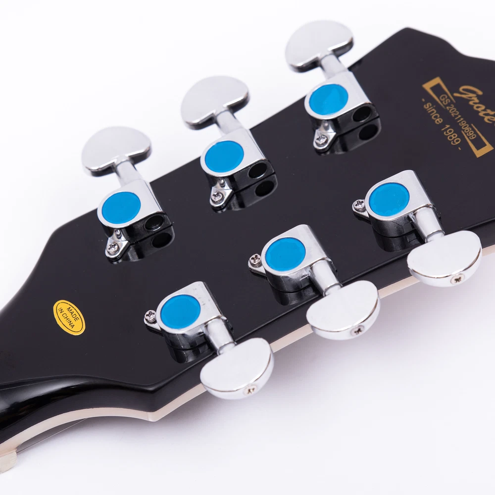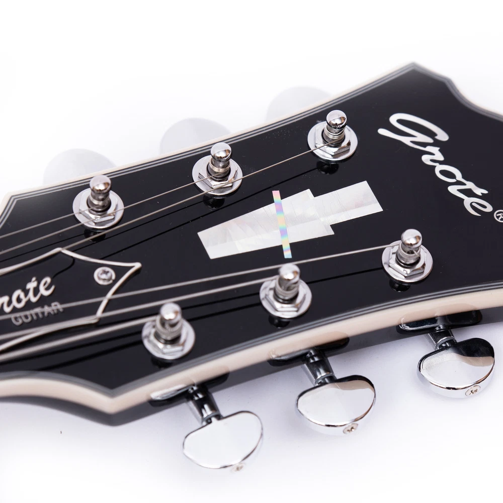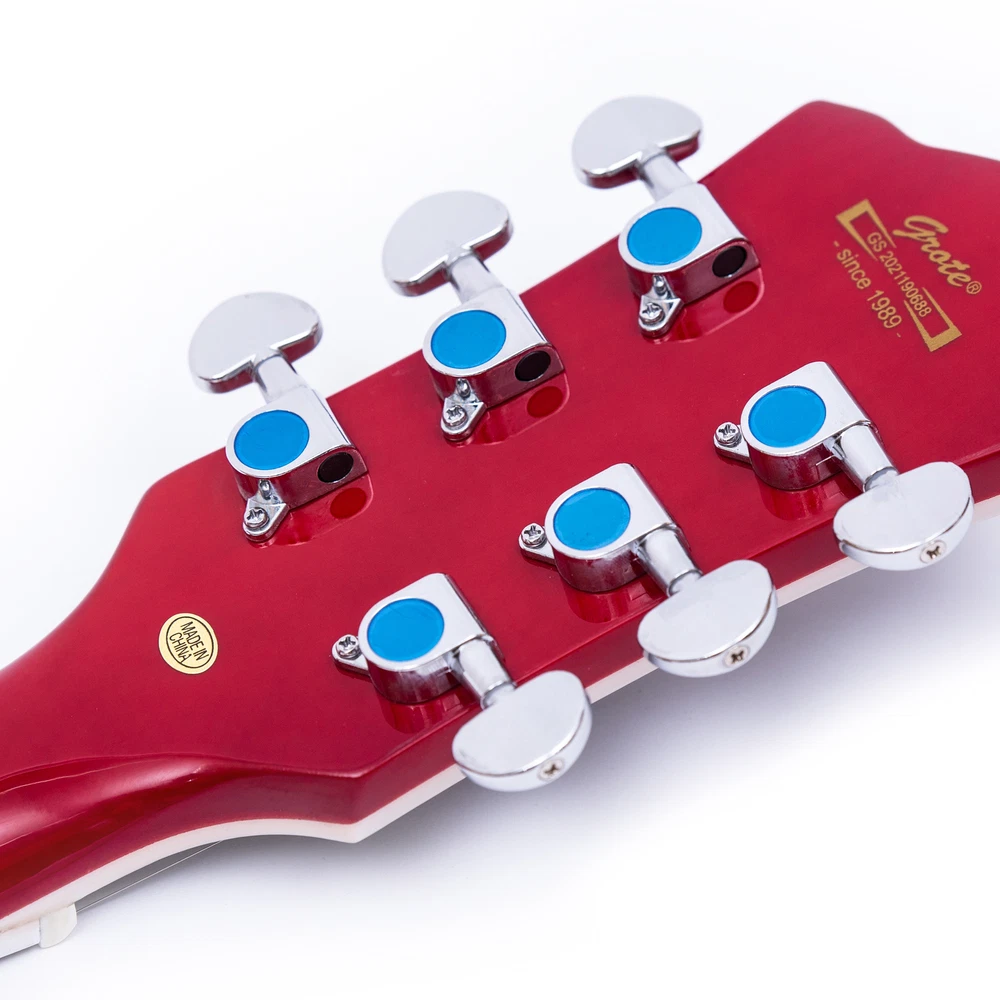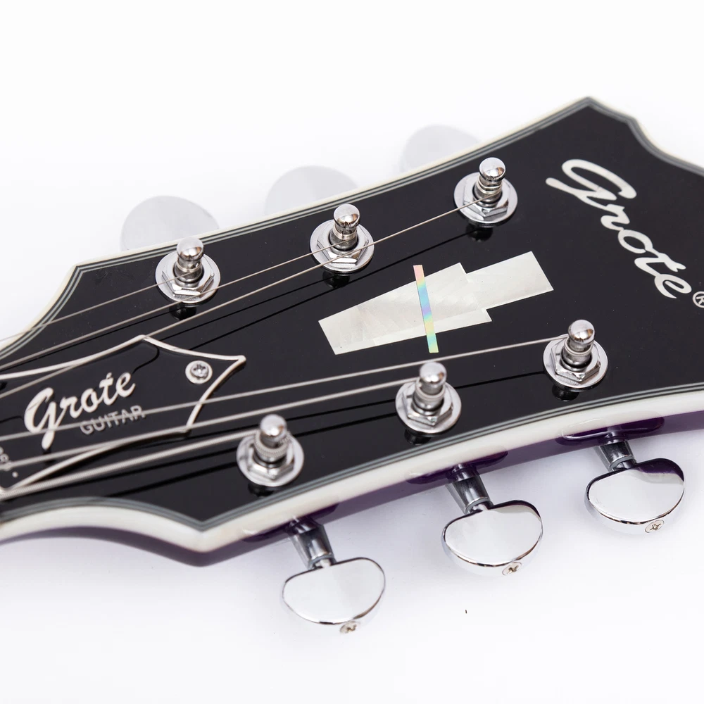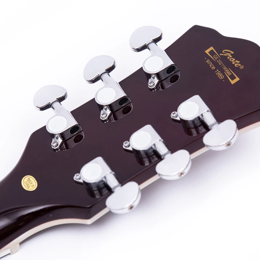 The perfect combination of unique style and left-handed design with our reverse electric guitar. The semi-hollow body made of high-quality basswood produces a warm and rich tone with excellent sustain, while the stunning maple printed design adds a touch of personality and style.Left-handed players can now enjoy a unique and inspiring playing experience with a guitar that is specifically designed for their needs. The Grote laser anti-counterfeiting label that you are getting an authentic and high-quality instrument, while the metal truss rod cover provides extra durability and protection. Designed for powerful, high-gain tones and a thicker, fuller sound, our humbucker pickups offer a level of versatility that can't be matched. Whether you're playing heavy metal, classic rock, or blues, our guitar will provide a dynamic range of sound that will have you shredding like a pro. The rosewood fingerboard on this electric guitar adds a touch of elegance and warmth to its already exceptional sound and playability. With its smooth surface and rich, resonant tone.