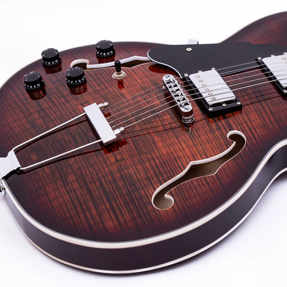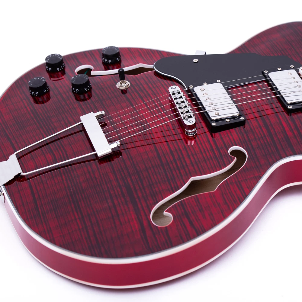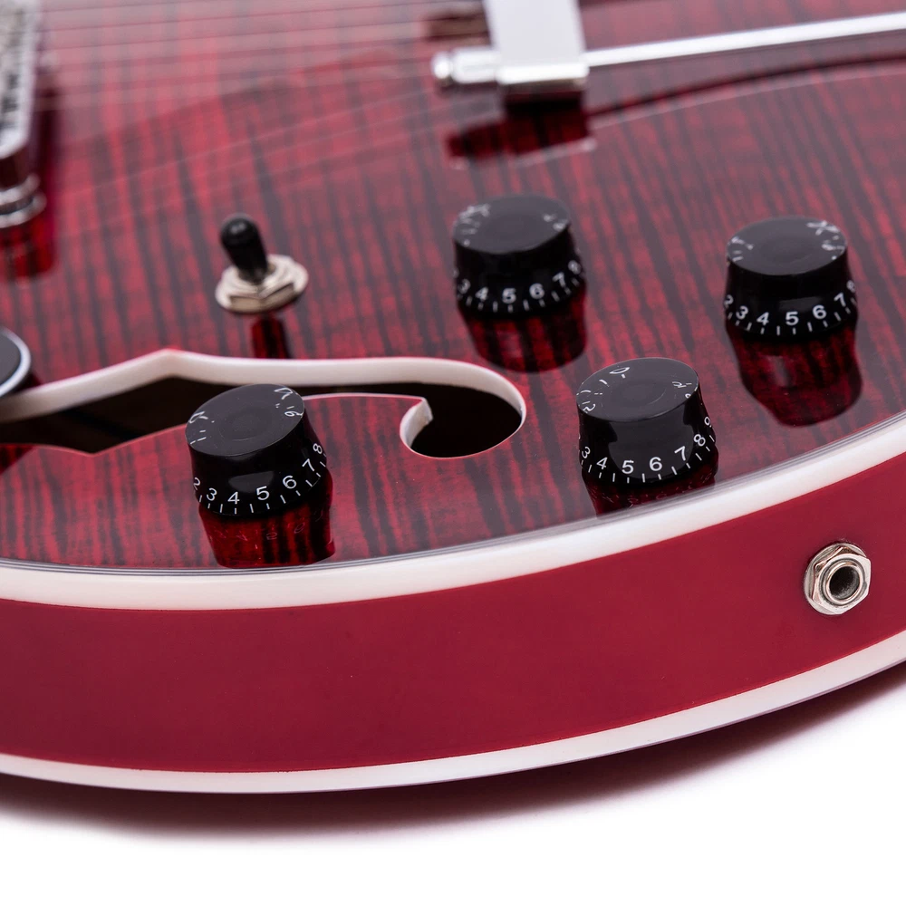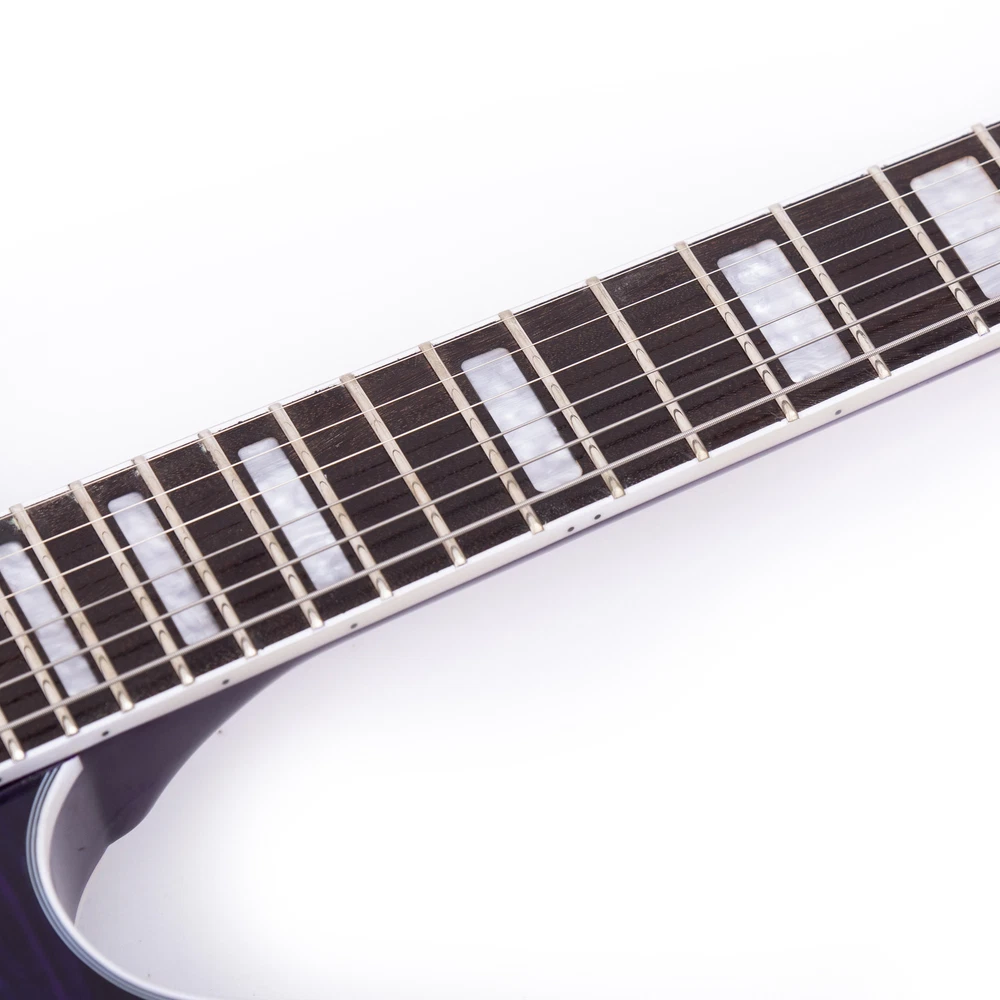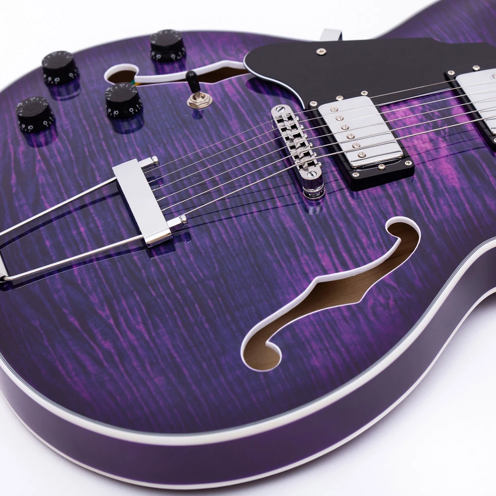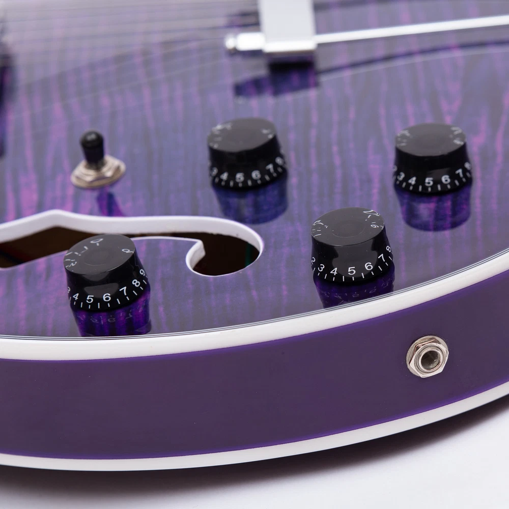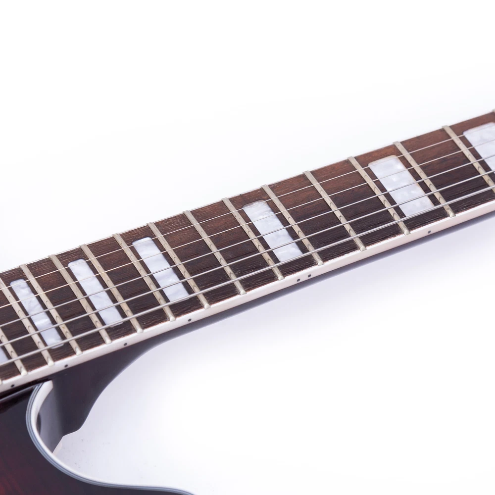 The perfect combination of unique style and left-handed design with our reverse electric guitar. The semi-hollow body made of high-quality basswood produces a warm and rich tone with excellent sustain, while the stunning maple printed design adds a touch of personality and style.Left-handed players can now enjoy a unique and inspiring playing experience with a guitar that is specifically designed for their needs. The Grote laser anti-counterfeiting label that you are getting an authentic and high-quality instrument, while the metal truss rod cover provides extra durability and protection. Designed for powerful, high-gain tones and a thicker, fuller sound, our humbucker pickups offer a level of versatility that can't be matched. Whether you're playing heavy metal, classic rock, or blues, our guitar will provide a dynamic range of sound that will have you shredding like a pro. The rosewood fingerboard on this electric guitar adds a touch of elegance and warmth to its already exceptional sound and playability. With its smooth surface and rich, resonant tone.