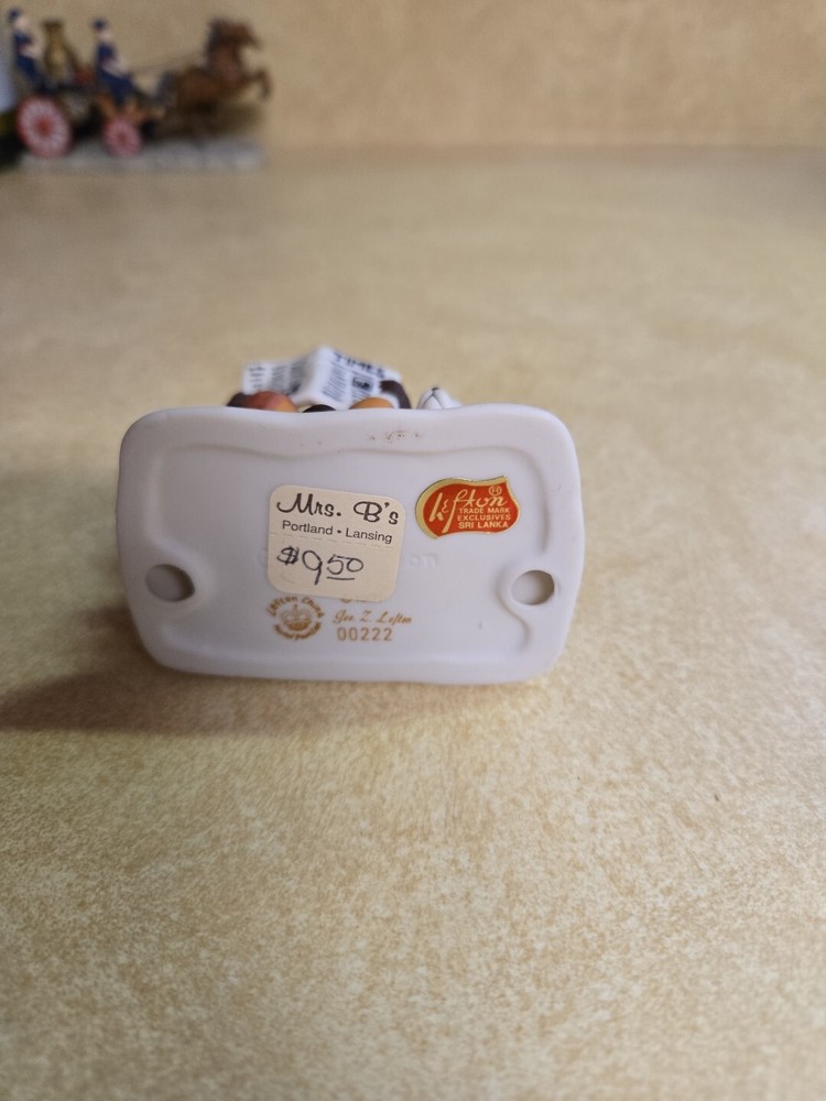 This is a Lefton Colonial Village Figurine 00222 from 1991. The figurine features a man in a Colonial style outfit, made of Bone China. It is a Christmas-themed seasonal collectible. Perfectcondition