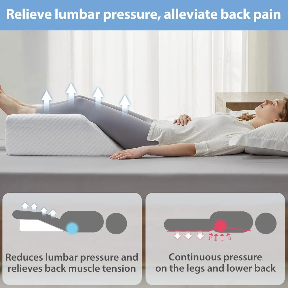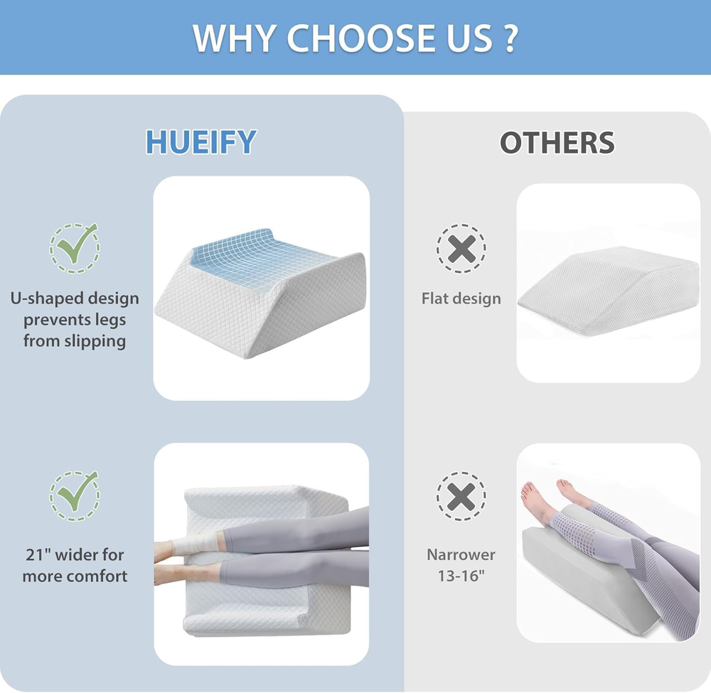 Leg Elevation Pillow for Blood Circulation after Surgery Swelling, Wedge Pillow for Legs Pain Relief, Foot & Ankle Injury, Rest & Sleeping, 8" Memory Foam Leg Pillow Soft but supportive leg elevation pillow : The top layer of the leg pillow is made of gel memory foam for softness and comfort. The bottom layer of the leg elevating pillow is made of high-density foam, which foot pillow provides effective support without deformation over time. Reduce swelling and quick recovery leg wedge pillow: leg pillow Elevating the legs above heart level promotes optimal blood circulation, leg elevation pillow reducing swelling and expediting recovery by up to 30%. This leg pillow elevation blood circulation is an perfect choice for pregnant women, the elderly and individuals recovering from knee, hip, or femur surgeries, as well as those managing leg injuries. Ease discomfort leg elevation pillows for after surgery: Backaches, knee soreness, and varicose veins frequently disrupt your sleep. Our knee surgery pillow offers relief by raising your legs, alleviating pain for a more comfortable and restful sleep. foot pillows for elevation while sleeping prepare you for a comfortable night's sleep! Made for maximum comfort leg elevating pillow: our knee pillow post surgery are precisely angled at 45º to optimize leg height for maximum fit and comfort. The bottom non-slip fabric of leg elevation pillow and U-shaped grooves of the leg wedges for elevation for swelling ensure that your legs stay firmly planted on the foot elevation pillow throughout the night, preventing any unwanted sliding and allowing you to sleep soundly throughout the night. leg elevation pillows for after surgery: All of us have suffered from back pain, leg, knee, ankle injuries, and surgery. The wedge pillow for knee pain is a unique item for those recovering from surgery to help ease their pain and give them the care they need most! In addition, the leg pillow for back pain can be used for daily living such as sleeping, reading, relaxing, and working to bring comfort to life. Product Description Legs don't Slip anymore ! The U-shaped grooves prevent your legs from preventing any unwanted sliding, allowing you to sleep soundly throughout the night. Soft & Breathable Fabric Choose luxury bamboo fiber fabric, breathable, comfortable, even in the hot summer will not swe. Non-slip Bottom The bottom is made of non-slip fabric, so you won't slide while you sleep. Easy to Clean Comes with a deluxe removable pillowcase that is easy to remove and wash for a comfortable night's sleep every time. 1 Sleeping 2 Reading 3 Relaxing 21.0 "w x 24.0 "w. Weight: 4.02 lb Item model number HUTXZBS2421 Unit Count 1.0 Count Color White Pattern Solid Product Dimensions 24"L x 21"W Material Memory Foam Use for Ankle, Knee, Back, Body, Feet Item Weight 4.02 pounds Shape Wedge Fill Material Memory Foam Maximum Tilt Angle 45 Degrees Age Range (Description) All age Recommended Uses For Product Reading, Nursing, Sleeping, Resting, Recovery Size 24*21*8.5 Inch Special Feature Machine Washable Cover, Ergonomic Support, Skin-Friendly, Removable Cover, Breathable Item Firmness Description Medium Soft Product Care Instructions Machine Wash Number of Pieces 1
