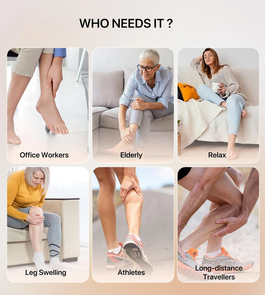 LEG MASSAGER GIFTS FOR DAD MOM: On Mother's Day, Father's Day, birthdays, Valentine's Day or any special occasion, surprise your beloved ones—Mom, Dad, or that special man or woman—with this thoughtfully prepared leg massager. Designed specifically for the feet up to the calves, it combines advanced air compression massage with heat therapy to effectively alleviate varicose veins, muscle fatigue, cramps, swelling, and edema. With this considerate and caring gift, bring them an unprecedented relaxation experience and enhance their quality of life 2 HEAT LEVELS 4 MASSAGE MODES 4 PRESSURE INTENSITIES: Heat, massage mode and massage intensity can be freely selected to meet the relaxation needs of different parts of your muscles and to adapt to the strength capacity of your leg muscles. Precisely designed airbags allow you to enjoy a 360-degree wrap-around pressing experience, and the 2 heating function (42℃/52℃) combined with the appropriate pressing intensity can effectively relieve leg edema and muscle soreness while helping to recover after exercise 2 EXTENDERS - ONE SIZE FITS MOST: This foot and leg massager can wraps nicely around your calves [up to 29.5“] and feet [up to 13.8”]. Comes with 2 extenders, the size is very inclusive and can fit a wide range of leg sizes, making it ideal for home use and ensuring a comfortable fit for everyone in the family WHO NEED THIS AIR COMPRESSION LEG MASSAGER: For doctors, nurses, teachers, and salespersons, prolonged standing often leads to leg fatigue and varicose veins. For athletes and fitness enthusiasts, after training/competitions, leg muscles tend to become tense or muscle damage. For our elderly loved ones, as they age, their blood circulation and muscle strength gradually diminish. Leg massagers can help them accelerate blood circulation, alleviate leg pain and enhance training outcomes LCD DISPLAY, MEMORY FUNCTION, 20MINS AUTO OFF: User-friendly design makes this air compression massager exceptionally easy for our elderly loved ones to use. Equipped with a handheld controller and an intuitive, easy-to-read LCD screen, it allows for clear visualization of the current function settings. The incorporated memory function defaults to the last used mode upon startup, providing convenience. Additionally, the 20-minute automatic shut-off feature ensures safety during each use