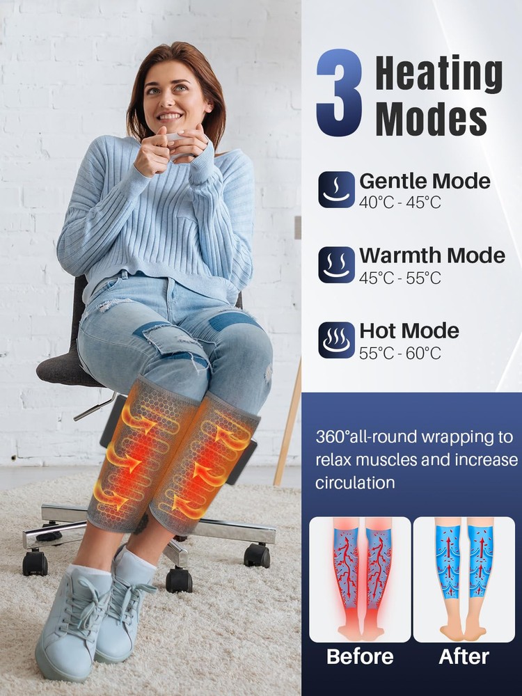 【Three Adjustable Heat Settings for Personalized Comfort】 Customize your heating experience with three heat levels—Low (40-45°C), Medium (45-55°C), and High (55-60°C). The warmth not only provides cozy relief but also enhances relaxation, making this leg massager perfect for cold days and post-workout relaxation. 【3 Vibration Massage Levels with Auto-off】 This calf massager features three adjustable vibration levels that effectively help relieve tired calves while letting you enjoy soothing warmth. Perfect for relaxing tired muscles after exercise, this portable leg massager also includes a smart 30-minute auto-off feature. 【Portable Cordless Leg Massager for Anytime, Anywhere Use】 Enjoy the freedom of relaxation on the go! This Wireless calf massager is designed with a built-in rechargeable 2500mAh battery for cordless convenience. With no external controllers or tubes required, it’s easy to take wherever you need it. The Type-C charging port is compatible with most USB outlets, making it simple to recharge at home, in the office, or while traveling. 【Adjustable Fit, Comfortable and Breathable Material】 This rechargeable leg massager is designed with Velcro straps and four extension straps to ensure a secure fit. The flexible design provides comfort for most users and can be easily shared with family and friends. Made of soft and breathable material, it remains comfortable even for long periods of use. When wearing it, place it on your calf with the indicator screen facing up and adjust the fit as needed. 【Thoughtful Gift for Someone You Love and Care About】 Wondering what gift to give to your loved ones? This leg massager is perfect for relieving muscle soreness and enhancing relaxation with customizable settings and a portable design. It is a meaningful gift for anyone seeking comfort and relief, and is perfect for giving to friends, family, and loved ones on birthdays, holidays, or any special occasion.