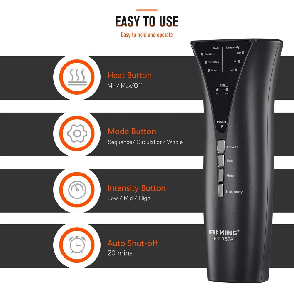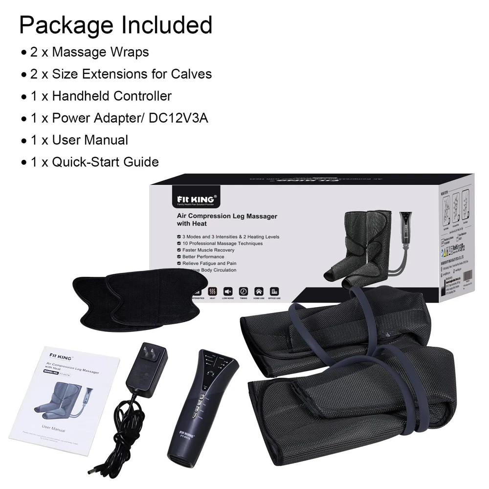 [ EFFECTIVE FOR FATIGUE & PAIN ] - This Leg Massager with Heat comes with 2+2 larger air bags, achieves different sequential compression experience via the controller to squeeze and massage your feet and legs. It can help release tight muscles and stress, eliminate muscle spasms, effectively help with RLS, swelling and pain in the feet and legs. [ UPGRADED WITH HEAT THERAPY ]- This leg and foot massager is upgraded with a feature of optional heating function, 2 heating levels available, providing soothing heat to warm you feet and legs up, combined with sequential compression massage, to improve circulation and bring further relaxation. The heating function can be turn on/off anytime per need. [ 3 MASSAGE MODES & INTENSITIES ]- This leg massager for circulation has 3 professional massage modes: sequence/circulation/whole mode, each mode has different massage techniques. Minimum intensity helps for daily feet and legs care and muscle relaxation, Medium helps to relieve muscle stiffness, soreness and pain, Maximum is helpful with recovery after intense physical training or exercise. Very easy and convenient to use. [ ADJUSTABLE VELCROS & SIZE EXTENDERS ]- This leg massager has larger and adjustable size via Velcros, your whole family can use it. Besides, there are a pair of size extenders included, which can extend the calf size up to 28.5 inches. A portable storage bag inside, very easy to carry. [ BREATHABLE COVER & WASHABLE INNER LAYER ]- leg and foot massager uses breathable leg wraps with a pair of the removable and washable inner layers. It's very easy to maintain and keep it clean between uses. This leg and foot massager can be used at home or in the office, would be an excellent gift for people of all ages on birthday, Mother's day, Father's day, Thanksgiving day and Christmas.