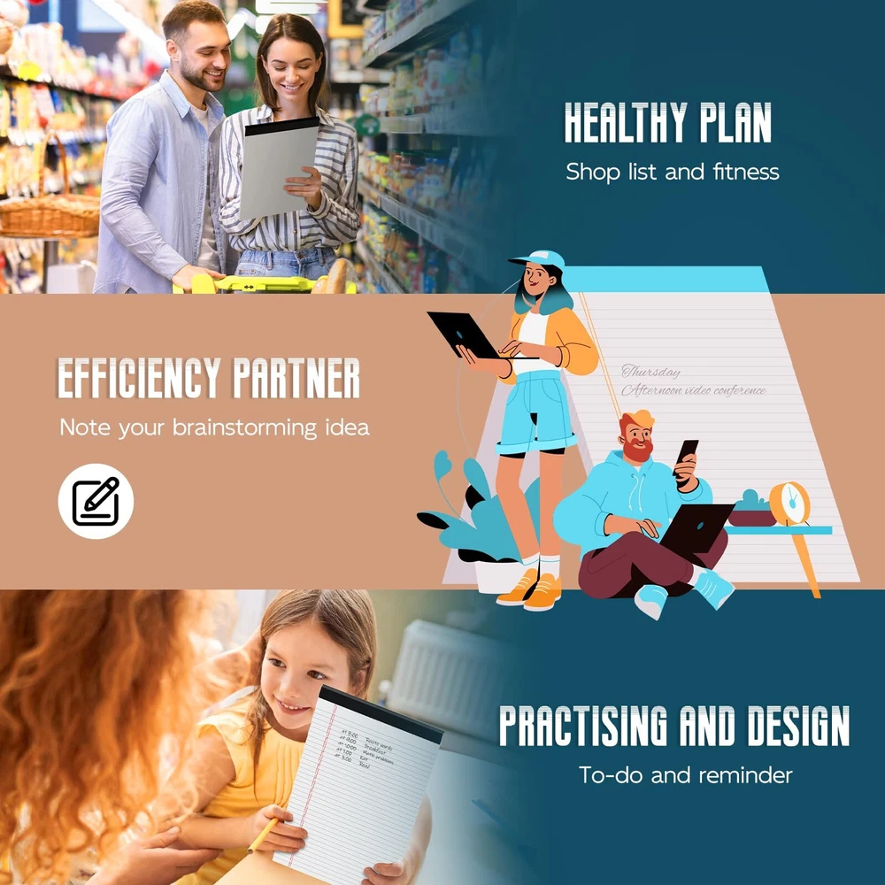 【High Quality Legal Pads】The legal pads 8.5 x 14 made of 70g paper material, thicker than average writing pads. Note pads 8.5x 14 wide ruled lined paper pads has the sturdy cardboard back allows the pen to slide smoothly, enjoy a smooth writing experience in everyday paper use and prevent ink from being left on the back or indented writing on the next sheet of paper. Suitable for a variety of pens. 【Quantity & Size】Each package of white legal pads 8.5 x 14 comes with 6pcs white paper pads. Wide ruled (11/32 inches) 9mm line writing pads 8.5 x 14 provides plenty space for your notes, spacing makes it easy to write more notes on each sheet. Each lined paper pads 8.5 x 14 contains 30 sheets of 60 pages, totaling 360 pages. Legal note pads 8.5 x 11 giving you plenty of space to record your thoughts and ideas. 【Perforated Note Pads】The paper pads 8.5 x 14 perforated top edge allows for easy and neat removal of individual sheets. Also, there will not be ripping in irregular neither. Each white lined paper 8.5 x 14 has black top binding, the headings at the top are wider, provide extra spacing for writing priorities. Organizing your notes/ list/ reminder in neatly and clearly. Perfect for daily professional notes, to-do. 【Enjoy Writing】The 8.5" x 14" writing pad is designed with double-sided printing, providing you with twice the writing space without wasting any paper. The legal pads 8.5 x 14 white with smooth paper, clear lines and colors, free of fibers without letting the nib bleed through to the back of the paper, helping record your unconstrained thinking and special moments, you don't need to worry about the inspiration being forgotten. 【Wide Range of Applications】This white ruled notepad could be used in a variety of settings including home and office and being 30 sheets per pad. You can create reminders and record important bills, phone calls, notes and more with the lined pads of paper 8.5 x 14, ideal for students, teachers, waiters, home, school or office, business, and more.
