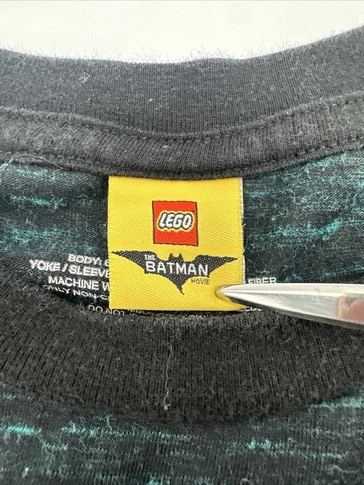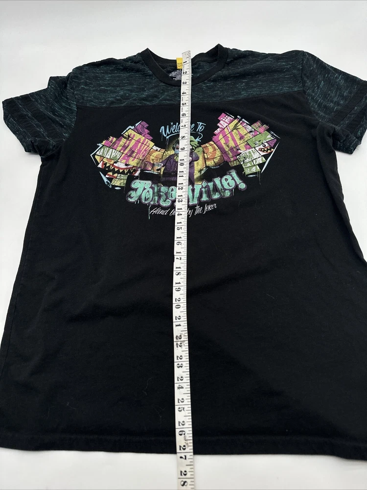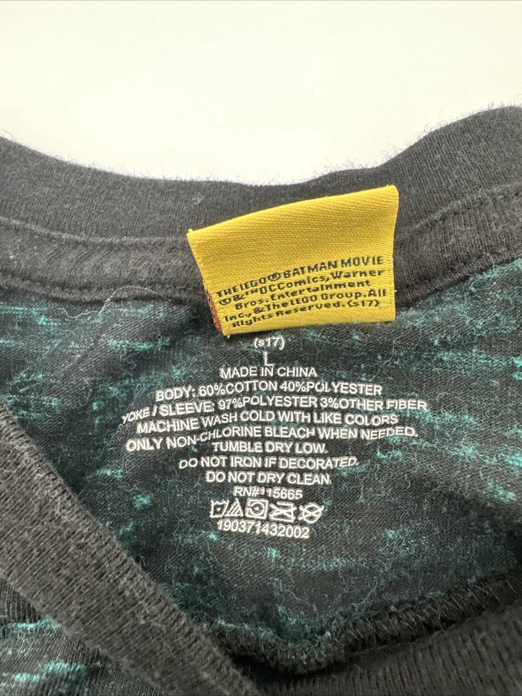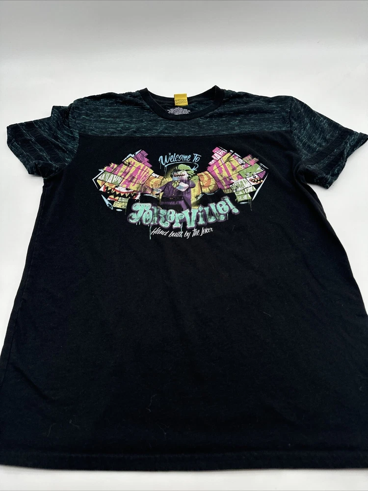 Show off your love for the Joker with this Lego Batman Movie Jokerville T-Shirt. This black graphic tee features the iconic Joker character in bold white letters, with the Lego Batman logo accenting the design. Made of a comfortable blend of polyester and cotton, this regular fit shirt is perfect for any Batman fan. The short sleeve crew neck shirt is available in size L, and is suitable for men. It is a great addition to any movie-themed wardrobe, and is perfect for casual wear. Made in China, this Lego Batman Movie Jokerville T-Shirt is a must-have for any Batman fan who wants to show off their sense of style. Check pictures for flaws and measurements