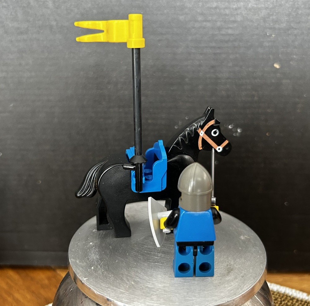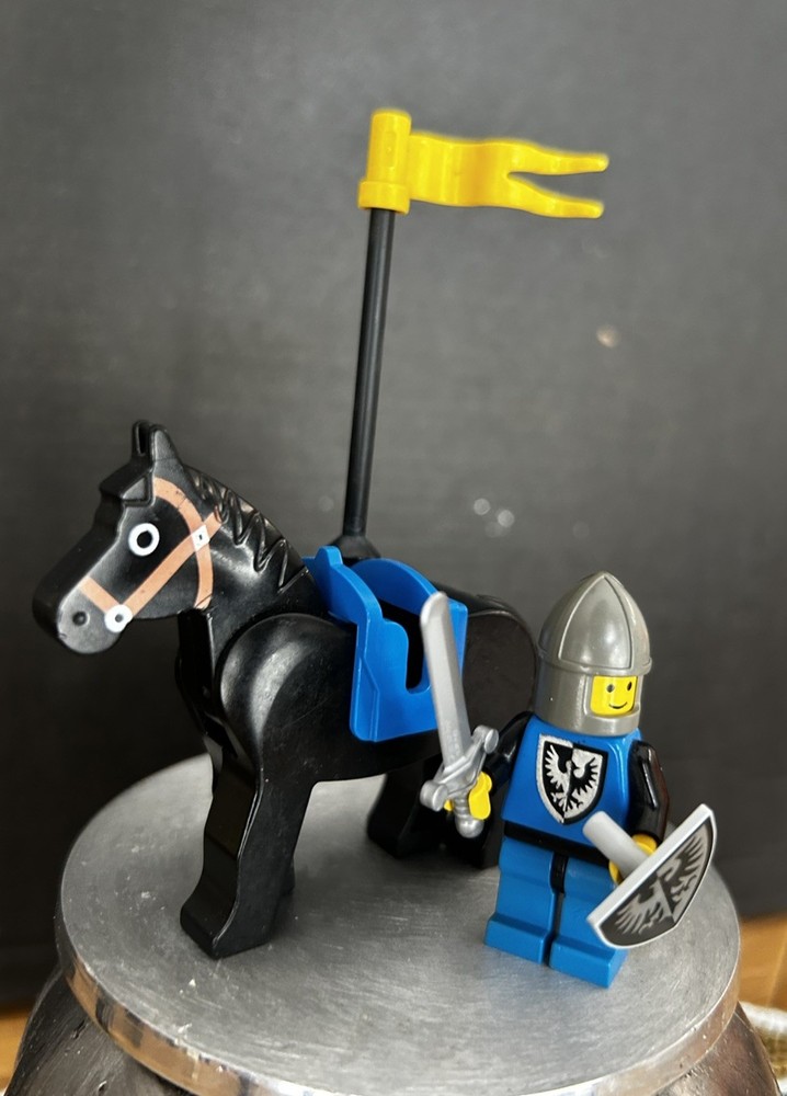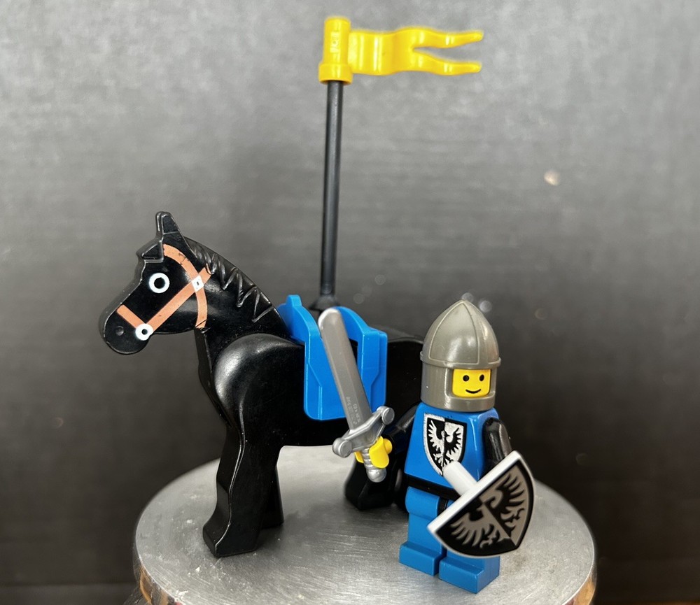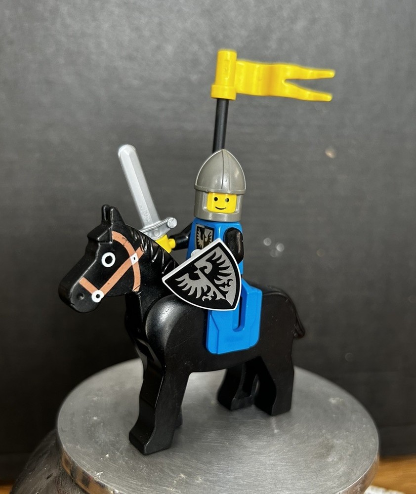The product is a vintage Lego Castle Black Falcon Knight minifigure, featuring a knight, horse, and falcon. Made of plastic in Denmark, this retired Lego character is part of the Castle theme. Perfect for collectors or fans of fantasy-themed Lego sets, this minifigure is a rare find for those looking to add unique pieces to their collection.