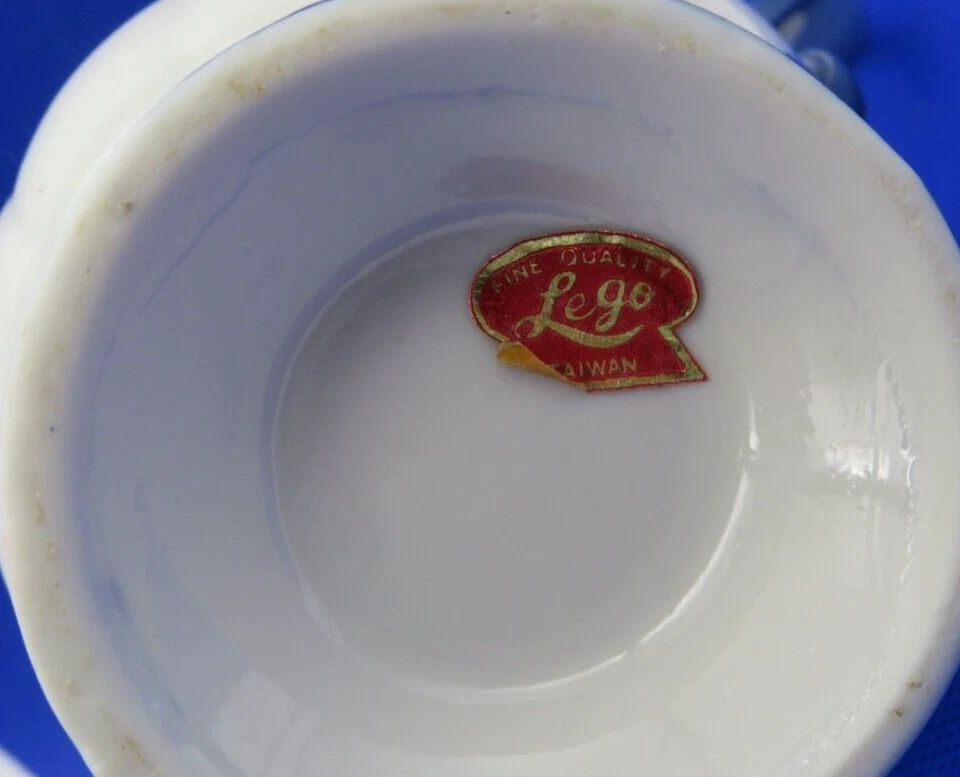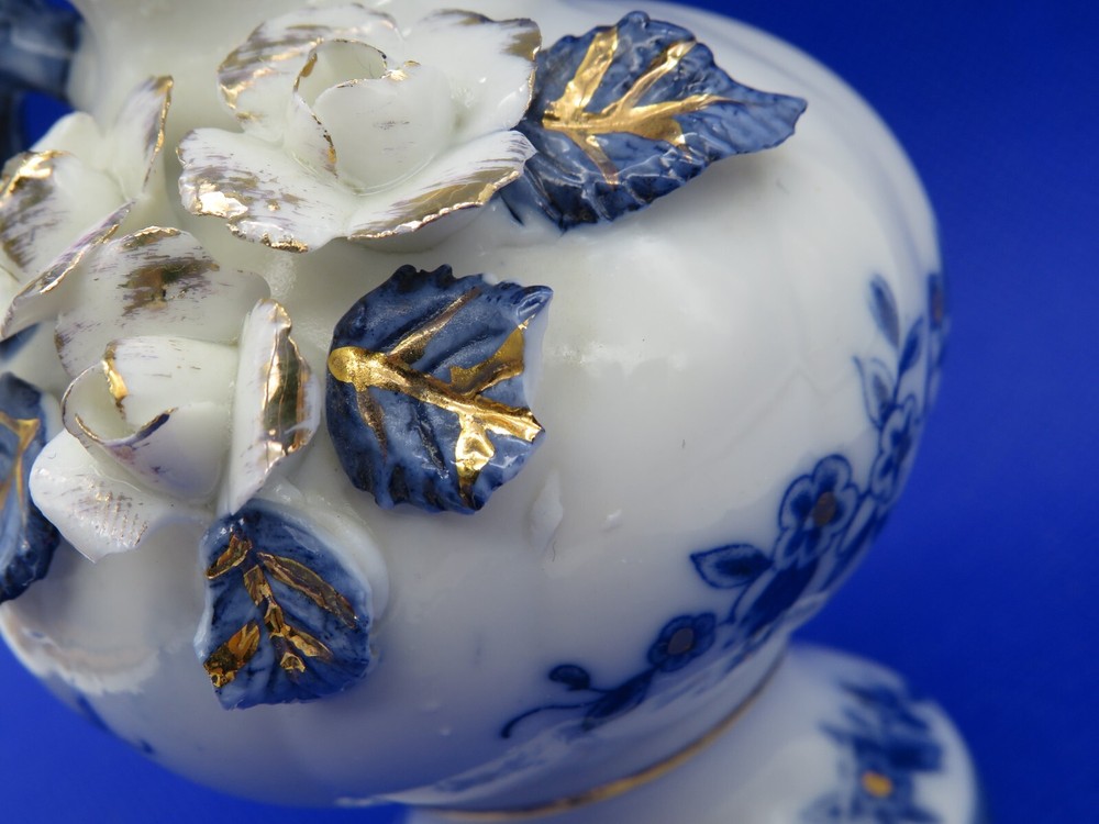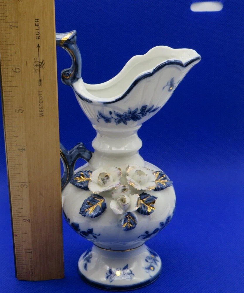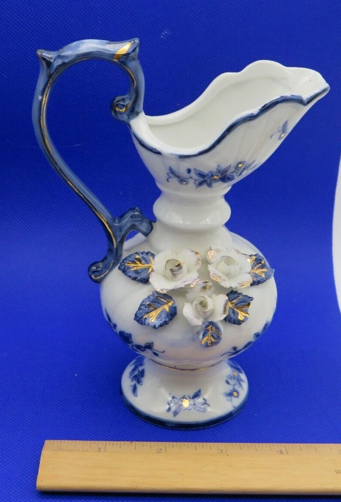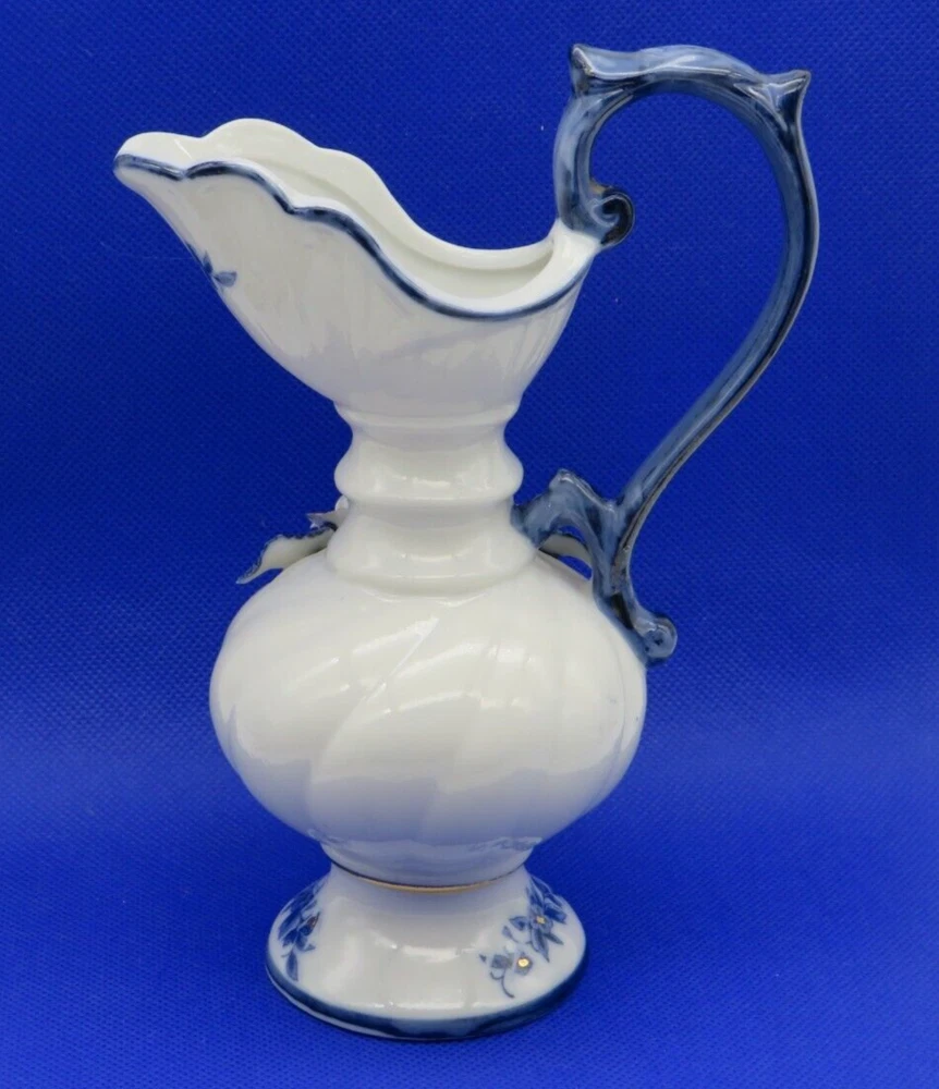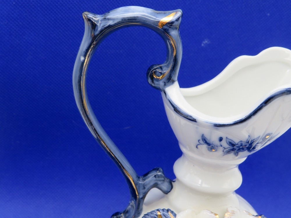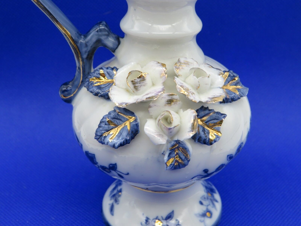 Lego Fine China Ewer Cobalt Blue White Porcelain Pitcher 3D Flowers Gold Trim Thanks for looking.. Please review photos closely. Message me for any questions you have.