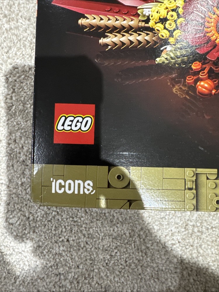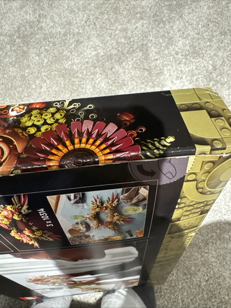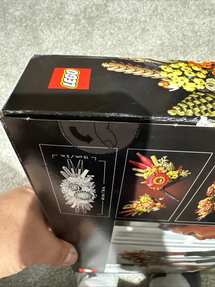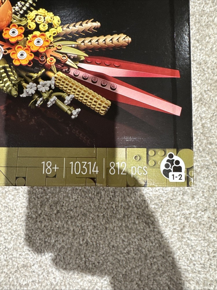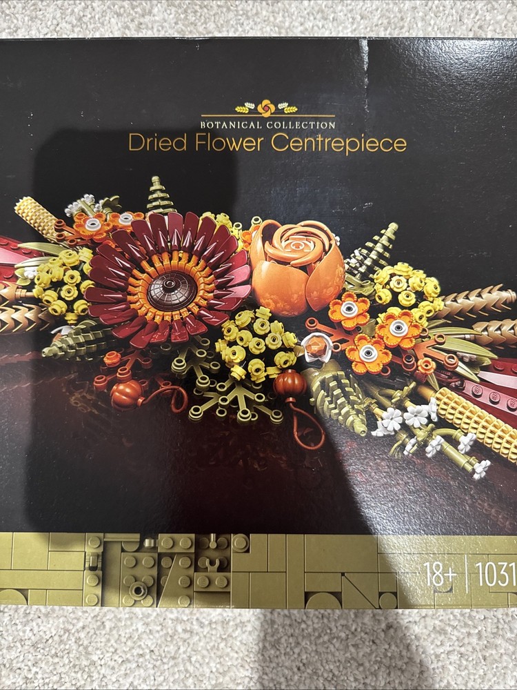 The Lego Icons "Dried Floral Centerpiece" set (10314) features 812 pieces, suitable for ages 8-12. This table top set, part of the Icons subtheme, is designed for creative play and building. Made by LEGO in Denmark, the set comes in a Papphülse (paper sleeve) and is still sealed, ensuring a fresh building experience for fans of LEGO building toys.