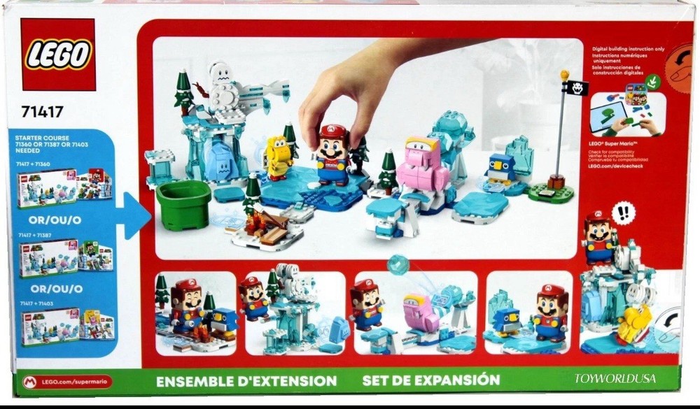 The Lego #71417 Super Mario Fliprus Snow Adventure Expansion Set is a new complete set released in 2023. This expansion set includes the character Freezie and is part of the Super Mario LEGO theme. Designed for children aged 7 and above, this plastic set appeals to both boys and girls who enjoy building and playing with LEGO bricks. Packaged in a box, this retired set offers a fun and creative adventure in the snow-filled world of Super Mario. Lego Mario not included.