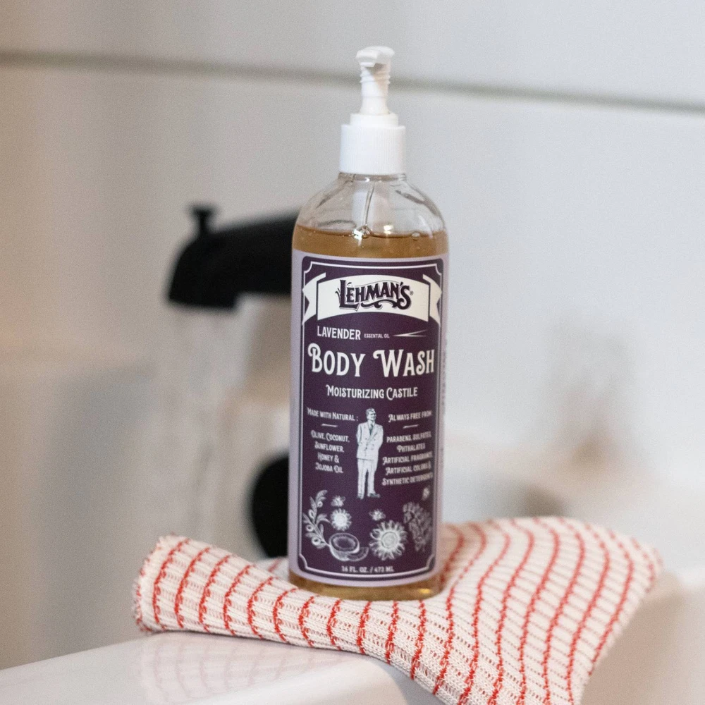 Castile Body Wash: Moisturizing and Natural! Clean and moisturize with our 100% natural and gentle castile soap. This body wash is perfect for hands, body and hair with plant-based ingredients, like olive and jojoba oil, and smells great with the added essential oils. No animal fats or oils and no synthetic detergents or preservatives to irritate your skin! Natural Formula - Made with pure honey and natural oils, including olive, coconut, sunflower and jojoba. Scented with refreshing essential oils.. Gentle on Skin - NO parabens, sulfates, artificial fragrance, artificial colors or synthetic detergents. Responsibly Made - Cruelty free. Renewable and biodegradable ingredients, plastic bottle is recyclable; 16 fl oz pump bottle. USA Made! - Made for us in Ohio Visit Our Store Contact Us Lehman's Castile Moisturizing Body Wash - 16 fl oz - Lavender Castile Body Wash: Moisturizing and Natural! Clean and moisturize with our 100% natural and gentle castile soap. This body wash is perfect for hands, body and hair with plant-based ingredients, like olive and jojoba oil, and smells great with the added essential oils. No animal fats or oils and no synthetic detergents or preservatives to irritate your skin! Natural Formula - Made with pure honey and natural oils, including olive, coconut, sunflower and jojoba. Scented with refreshing essential oils. Gentle on Skin - NO parabens, sulfates, artificial fragrance, artificial colors or synthetic detergents Responsibly Made - Cruelty free. Renewable and biodegradable ingredients, plastic bottle is recyclable; 16 fl oz pump bottle USA Made! - Made for us in Ohio Helpful Hint: Natural products may be affected by cold and humidity. Body wash can get cloudy and/or separate. Just shake it and use as normally directed. Not recommended for washing color-treated hair. Directions: Our Castile Body Soaps are great for washing hands, body and hair. Shake well and pump liberally onto a wet cloth applying to body or work into wet hair and agitating into a rich, creamy lather. Feel free to repeat as you like. Ingredients: Purified Water, Olea Europaea (Olive) Fruit Oil Cocos Nucifera (Coconut) Oil, Cocamidopropyl Hydroxysultaine, Potassium Hydroxide (Used in the saponification process to turn oil into soap; none remains in the finished product), Caprylyl/Capryl Glucoside, Tetrasodium Glutamate Diacetate, Helianthus Annuus (Sunflower) Seed Oil, Simmondsia Chinensis (Jojoba) Seed Oil, Honey, Lavandula Angustifolia (Lavender) Oil, Natural Fragrance, Glycerin, Rosmarinus Officinalis (Rosemary) Leaf Extract, Sea Salt, Citric Acid, Lauryl Glucoside.