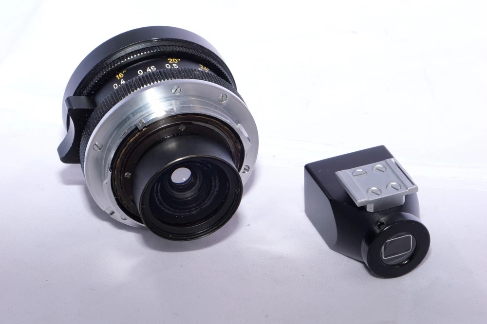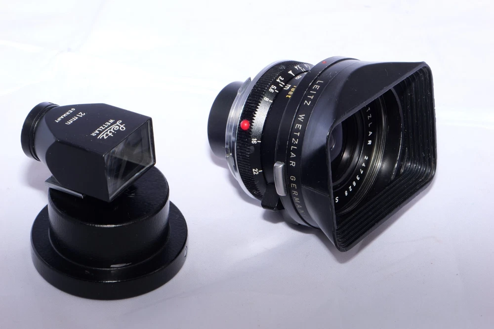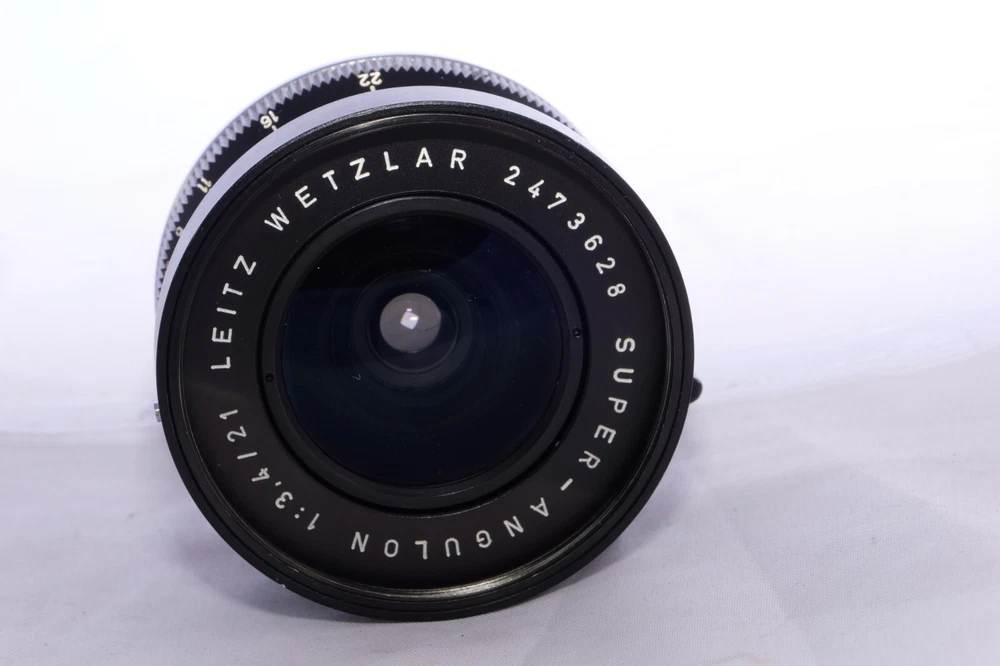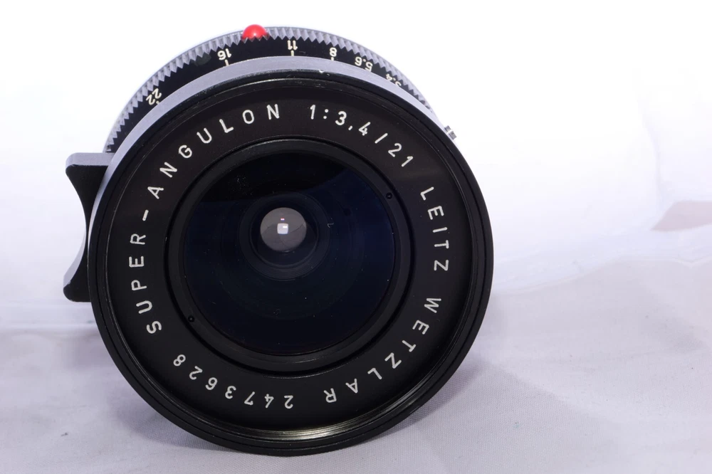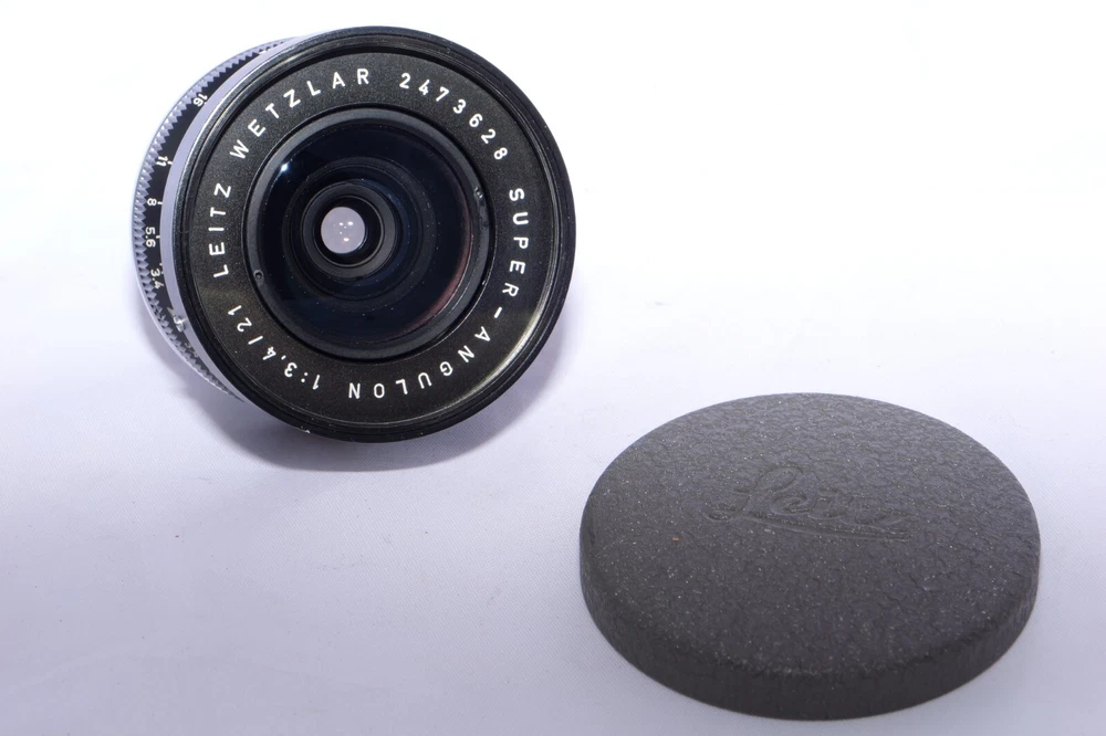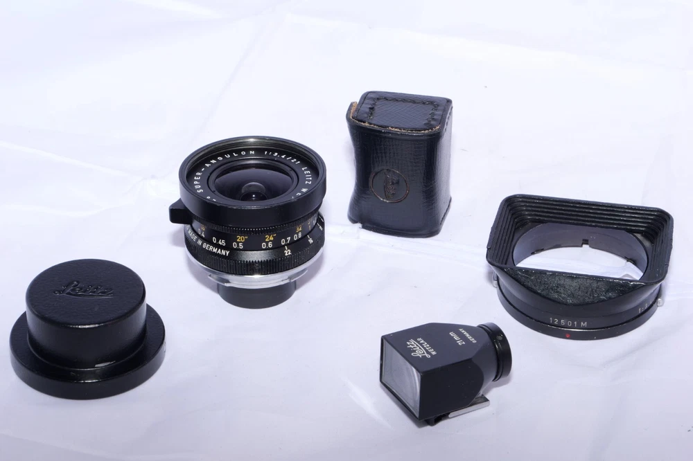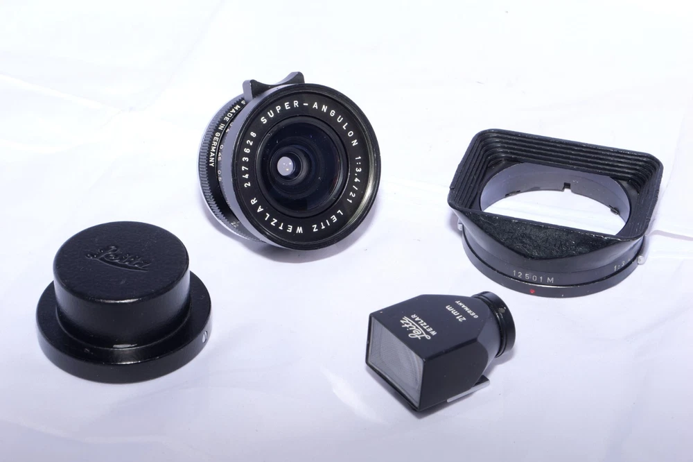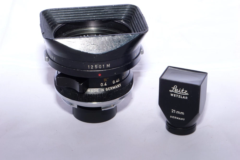 Leica Super Angulon- M 21mm f / 3. 4 black Leica M mount vintage rangefinder lens. Serial #2473628. Made in Germany. Circa 1971. Cat. #11103. Perfect fit for the Leica M1, M2, M3, M4, MDa, M5, M6, M7 and Leica MP. Comes with original Leitz 21mm black Viewfinder. Eight (8) lens optical elements. Filter size is E48. Close focusing from .4m or 16 in. Aperture range from F/ 3 . 4 to F/ 22 . Weight is 10.7 oz. Lens is in Ex/Ex+ or 8.5/9 of 10 cosmetic condition. No DENTS. Overall nice condition. Fairly Clean glass. Optics have recently been CLA'd and has NO haze which is quite typical for Super-Angulon lenses. Nice coating. Front element is very clean, with nice lens coating. Smooth focusing. Good working aperture. Clean and smooth aperture blades. Leitz 21mm Finder . Catalog #12002. Finder is in Ex++ or 9 of 10 cosmetic condition. No DENTS or dings. Clean optics. Leitz 12501 lens Hood. Hood is in Ex- / User or 6 of 10 cosmetic condition. Visible marks, but works fine.. Comes with original Leica 12501 Hood, Leitz rear cap, Leitz projector front cap, C lassic extreme wide angle lens for your lovely Leica M camera. Sells with NO RESERVE at price of $1425 . I have many other Leica M and TM lenses, Leica Film and Digital cameras, Leica Copies, 35mm Rangefinder and Vintage and Collectibles. There are always unique & unusual items on my other Auctions, eBay Store and Web Page.