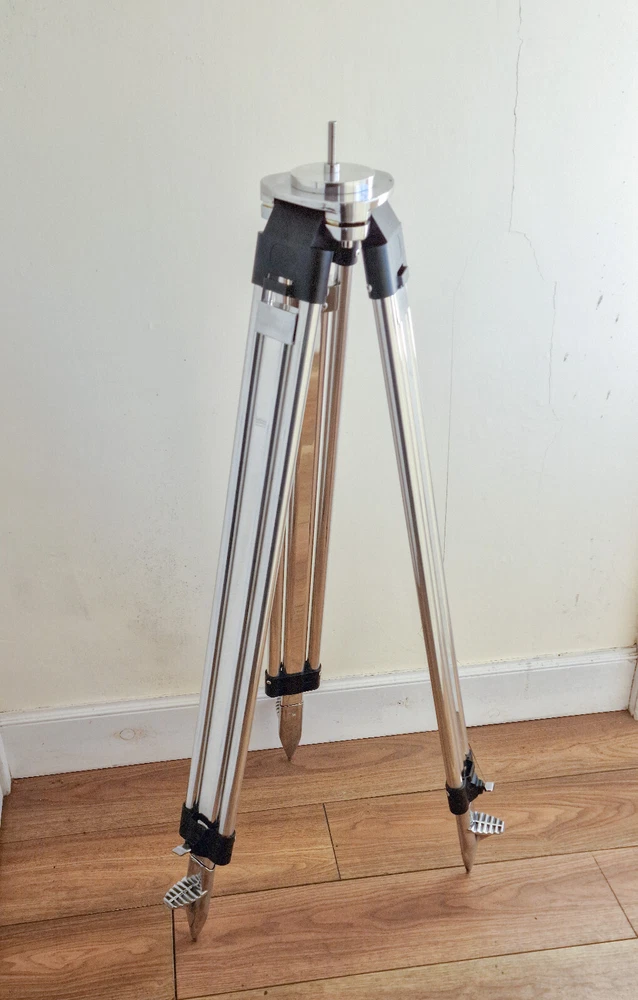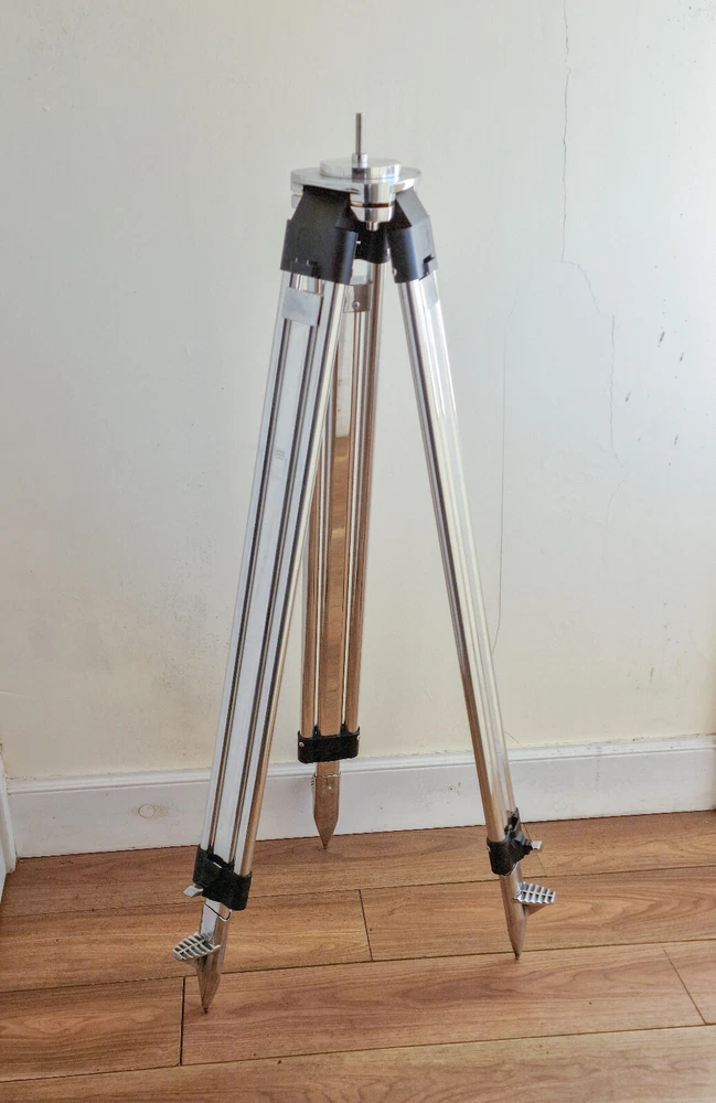 Leica polished surveyors tripod All aluminum parts have been polished The plastic fittings have been painted Matt black The top has been fitted with an m10 threaded bolt This has been used in the field prior to repurposing so will have some small scrapes and bashes which cant be removed during polishing