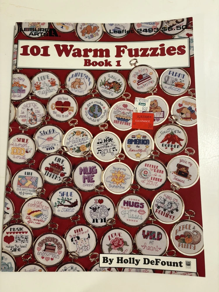 This is a cross stitch pattern booklet titled "101 Warm Fuzzies Book 1" by Leisure Arts. It features designs by Holly DeFount and is model number 2493. The booklet contains various cross stitch patterns of cozy, warm-themed designs. Smoke free/pet friendly home.