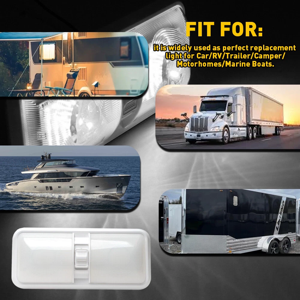 Specification: Material:PC LED: 48 LEDs(left+right) LED type:2835 SMD LED Voltage:11-18V Color temperature:4000-4500K Lumen:600LM Waterproof IP: IP67 Service life:50000h+ Features: *High-brightness and Comfortable Light Source The LED lighting lamp with three gears switch to control has built-in 48 high-quality LED chips, you can easily perform indoor work at night. *Simple installation Easy installation, Low power consumption. *IP67 waterproof Prevent from water, snow, moisture, rusting and dust, don't worry about leak inside problem. *Gears Control Leisure LED RV Interior Led Ceiling Light Boat Camper Trailer double Dome 3x Specification: Material:PC LED: 48 LEDs(left+right) LED type:2835 SMD LED Voltage:11-18V Color temperature:4000-4500K Lumen:600LM Waterproof IP: IP67 Service life:50000h+ Features: *High-brightness and Comfortable Light Source The LED lighting lamp with three gears switch to control has built-in 48 high-quality LED chips, you can easily perform indoor work at night. *Simple installation Easy installation, Low power consumption. *IP67 waterproof Prevent from water, snow, moisture, rusting and dust, don't worry about leak inside problem. *Gears Control Independent switch control can make it easy to open and close at any time. Gears description: Built in 3-way switch (to use one or both sides of light fixture) Gear 1:One side on Gear 2:light off Gear 3:Two sides on *Application It is widely used as perfect replacement light for Car/RV/Trailer/Camper/Motorhomes/Marine Boats. Packaging include: Dome light *1 Item Specifics Brand Unbranded Manufacturer Part Number Frosted DOUBLE DOME MPN Does Not Apply Weight 300g Color White Unit 1PC Material PVC Led OE Reference Number roof interior dome reading ceiling Cabin Strip Light Interchange Part Number Trailer Truck Lorry Boat Lorry Caravan Motorhome RV Voltage 12-24V LED QTY 48LEDs Power 10W Part Type Accessories Manufacturer Warranty 2 Year Custom Bundle Yes Bundle Description Camper Trailer RV Marine Modification Description RV 12v Interior light w/switch Custom Bundle Yes Bundle Description Camper Trailer RV Marine Modification Description RV 12v Interior light w/switch FAQ ♥ If you have a decoding problem or any other problems, please contact us first, we will help you with it. We will reply you within 24 hours in working days. I'm a new seller, thanks a lot for your trust and convince! I will serve you with all my heart. ♥ Q1: Will this bulb fit my vehicle? A: We can match almost any vehicle to one of our bulb sizes. eBay only lets us include some vehicle fitments per listing, but if your vehicle does not show up on the compatibility table at the top of our listings, welcome you to contact us for free consulation before purchasing a product. Q2: My item has not arrived, what's taking so long? A: Sometimes items take longer than expected, especially if it’s going far or to rural area. Check with your post office to see if your item has been held up. Sometimes Royal Mail will not update a tracking number until it has arrived at its destination. If your item still don't arrive after a few days, let us know so we can double check for you and help solve it asap. Q3: My bulbs won't fit, help! A: Special bulb holder may be required. See if you can take the holder from the stock bulb. If not, let us know. The bulb size may be wrong, double check the item you received with the item you ordered. Do you have an aftermarket lighting housing? These may not be perfectly fitted for aftermarket bulbs and will require some manual modifications. Q4: Neither side lighting up? Both sides flicker, hyper flash, or work inconsistantly. A:Check the light fuses, and then check the ballast plugs to insure correct installation. If this doesn't work, there may be a voltage problem with the vehicle. You probably just need a relay or capacitor. Even though some bulbs are builtin resistors, they may still need a decoder. Pay & Ship (1). We gladly accepts payment via PayPal, We will ship your item(s) within 24 hours. (2). Before payment, please keep the consistency of Paypal address and ebay address. (3). Quantity orders are welcome! Returns (1). We offer 60 days free return policy. Please contact us within 60 days from the date you receive your order if you have any issues with the product or want return. Refund will be send after we got your resend package. (2). All returned items should be in the original packaging , return tracking information should be provided . Contact Us (1).Negative feedback will not help resolve any problems you have, please contact us via eBay messages before leaving negative feedback , our customer service will make best effort to help you with the issues. (2).We maintain high standards of excellenceand strive for 100% customer satisfaction! Feedback is very important to us. We request that you contact us immediately before you give us neutral or negative feedback, so that we can satisfactorily address your concerns. About us We're professional in car and motorcycle accessories, especially in LED bulbs. We have our own factory and R&D team. Our belief is to sell top quality items that fit your car and serve you with our heart. Anything please feel free to contact us! Our customer service is very responsibility. Come and follow us! DESCRIPTION NEW ARRIVED HOT SALE CONTACT US SAVE US Store Category Store Home Other Hot Item AUXITO Super Bright LED Backup Reverse Light 921 912 T15 Bulbs Lamp 6500K CANBUS USD 20.69 4 Pieces 4Inch Trailer Marker LED Truck Side Light Clearance Lights Yellow Amber USD 12.34 9005 9006 LED Headlights Kit Combo Bulbs 6500K High Low Beam Super White Bright USD 34.19 54LED Emergency Light Bar Rooftop Double Side Strobe Warning Light Amber + White USD 69.99 Smoked Cab Roof Amber Marker LED Lights Kit For 1980-1997 Ford F150 F250 F350 USD 26.99 New List Item AUXITO 1157 LED Turn Signal Light Bulbs DRL Amber White Anti Hyper Flash Pair US USD 19.99 AUXITO H11 H8 H9 LED Headlight Kit Low Beam Bulb Sup