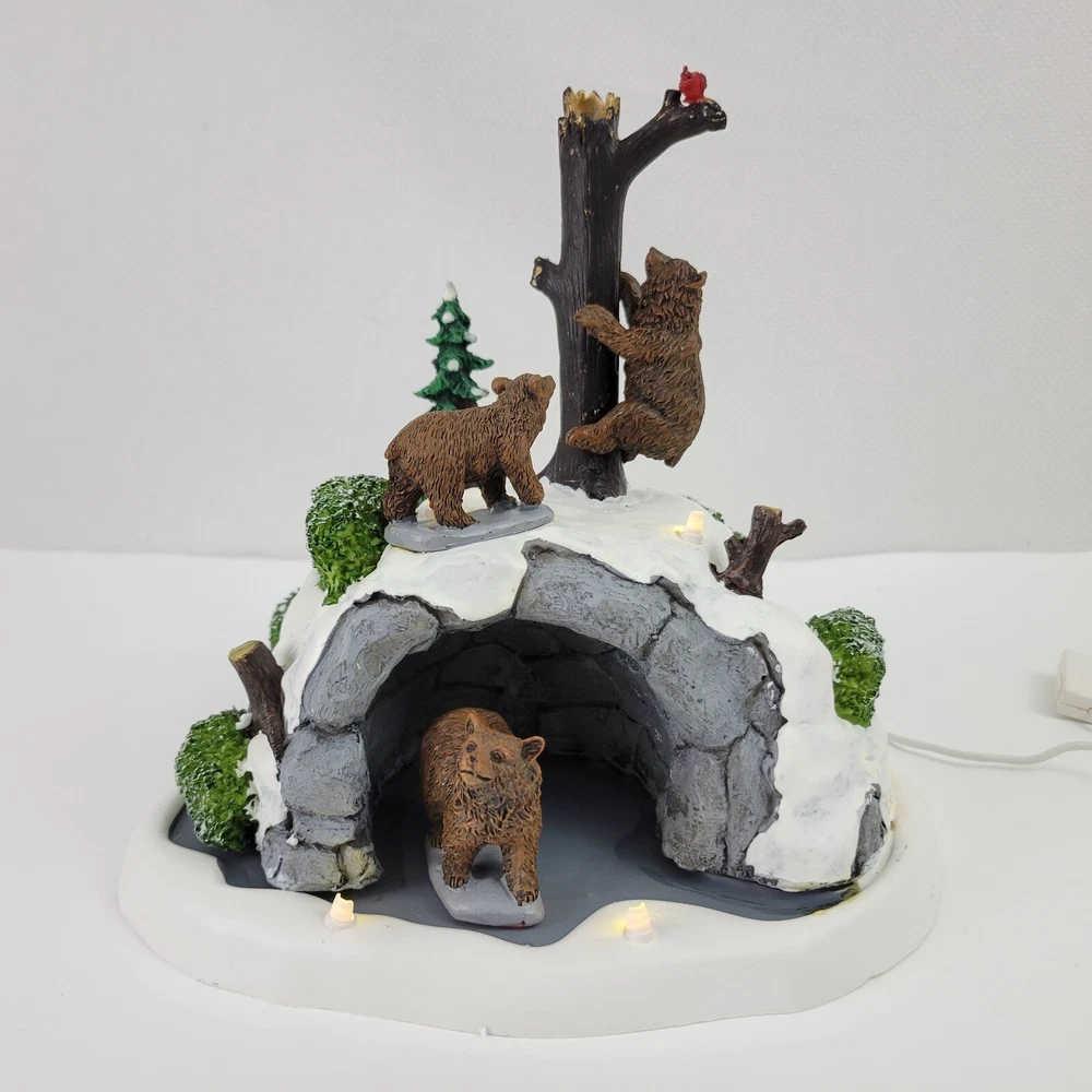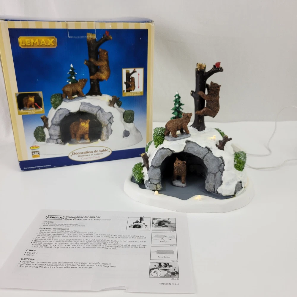 This is a very hard to find retired Lemax lighted and animated Bear Cave. The lights and the two bears move as expected. There do appear to be some missing branches on the pine tree in the background, but otherwise there don't appear to be any chips. There is some discoloration around the base, so please take a close look at the pictures for details. The cave comes in the original foam insert (with strap) and the box. The box has a fair amount of edging and dents so please take a look at those pictures. Included in the box is a battery power box to run the lights and animation. It requires 3 AA batteries (not included.)