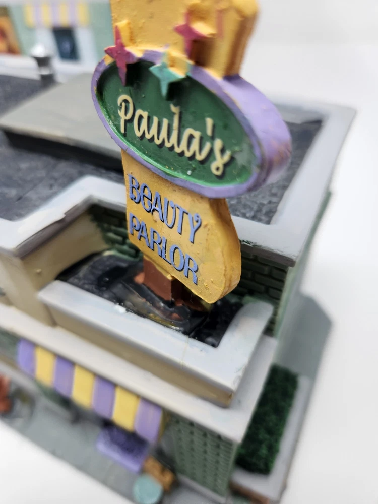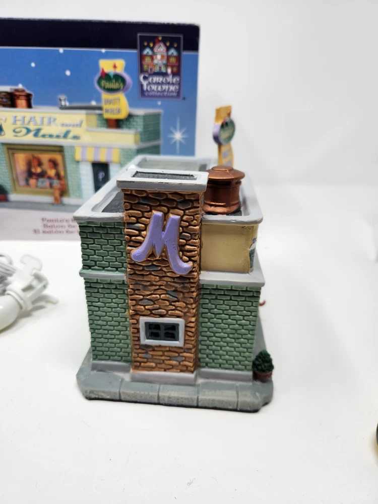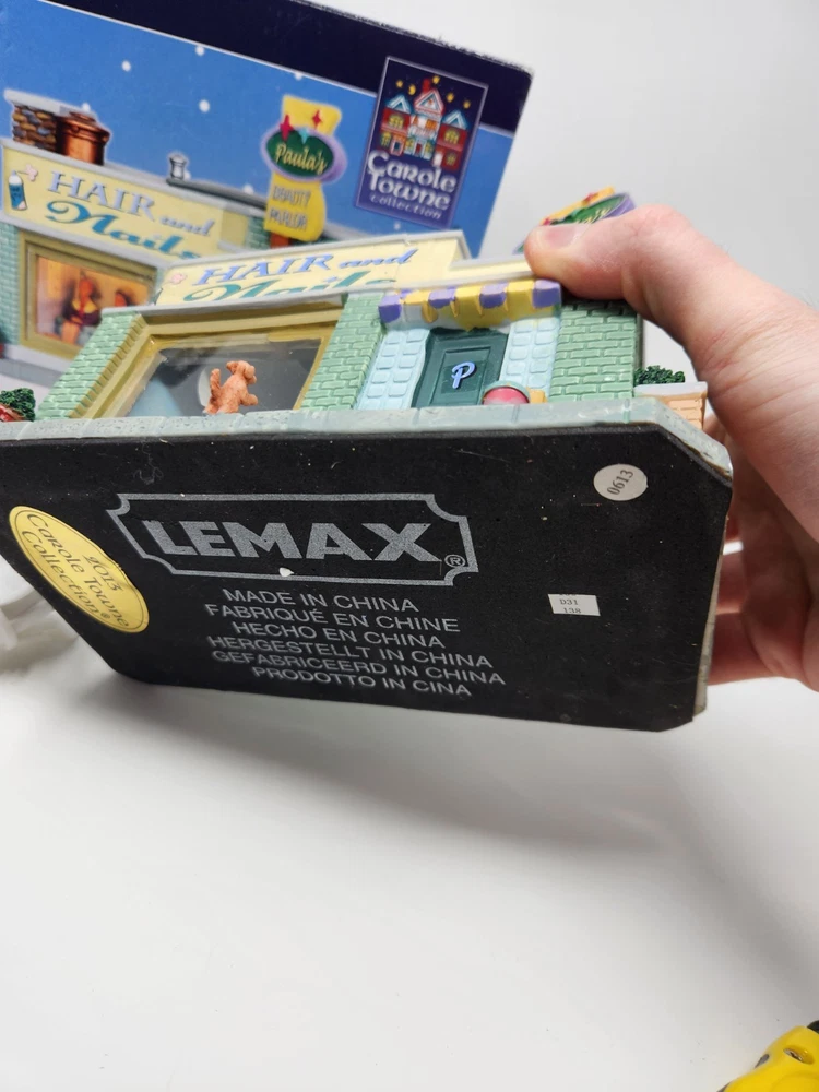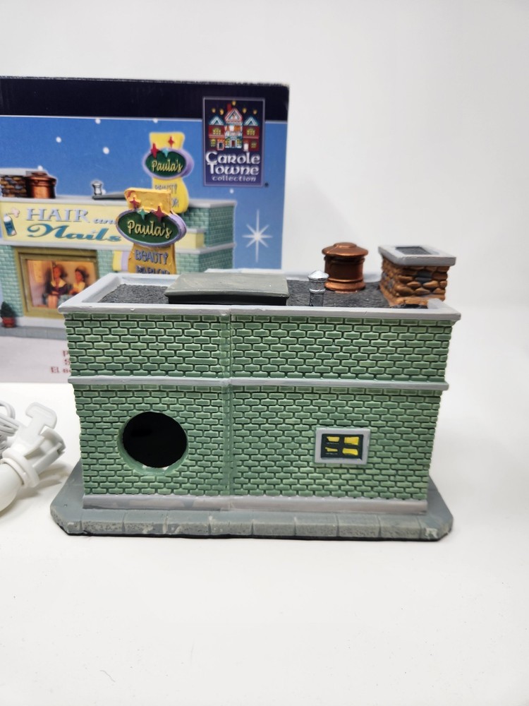 The product is a Lemax Carole Towne Paulas Beauty Parlor figurine from 2013, featuring a rectangular shape and multicolor design. This ceramic and porcelain Christmas village piece depicts a beauty parlor setting with illuminated features, suitable for display in any room. It comes in its original box, although the piece has some damage. The item is perfect for teens, adults, and kids alike to add to their seasonal decorations. Missing bush on corner. Sign is loose dog is loose and bucket is loose. Box in good condition with some damage