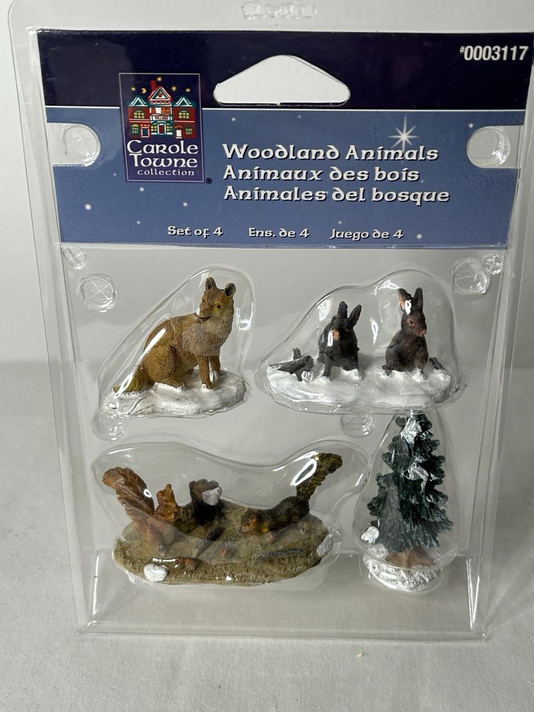 This set of three Carole Towne Collection by Lemax offers a charming, whimsical woodland animals, a father and fawn figurines, and a street clock that brings a touch of animation to any seasonal display. Each piece is meticulously crafted with attention to detail, showcasing a delightful blend of animals, trees, and clock motifs that embody the spirit of the outdoors.Ideal for collectors and holiday enthusiasts alike, these figurines and clock are sure to enhance your festive decorations with their quaint charm and timeless design. Whether displayed on a mantel, in a village setting, or as part of a train collection, these pieces from the Lemax Carole Towne Collection add a touch of magic to any setting. All New-In-Package - all packages in mint condition.