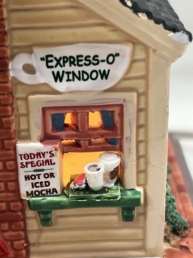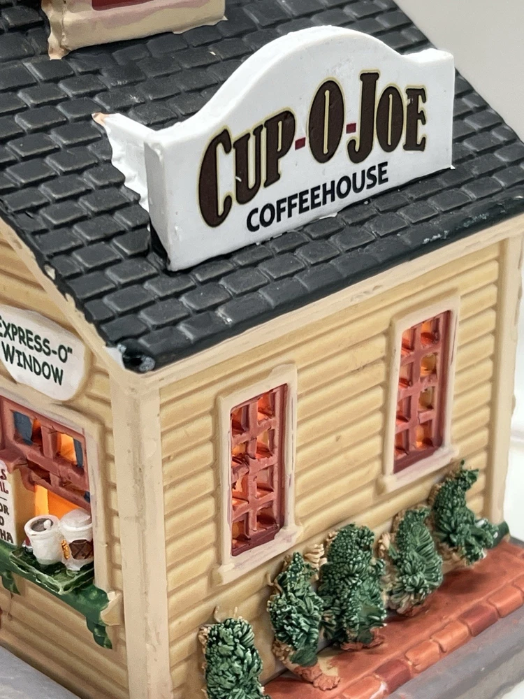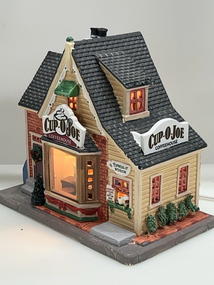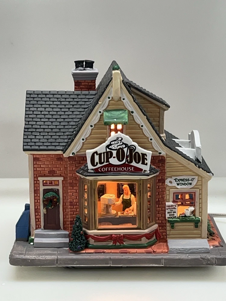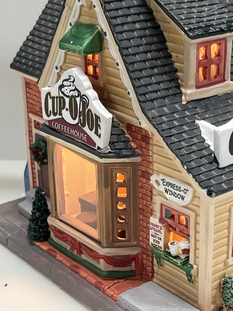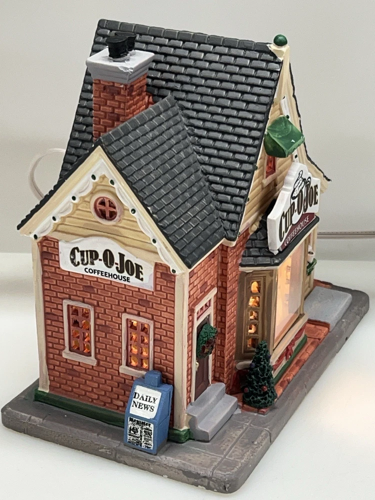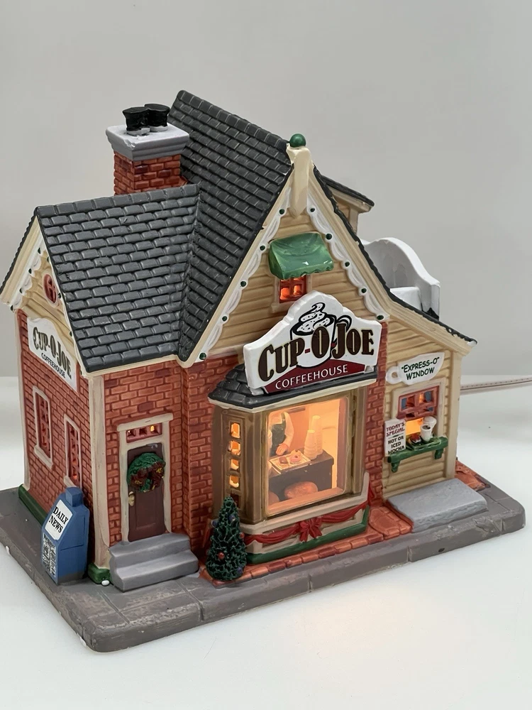 Add a cozy and vibrant touch to your Christmas decor with the Lemax Cup O Joe Porcelain Lighted Coffee House. This charming piece from the 2013 Seasons Collection paints a quaint picture of a beloved coffeehouse, complete with intricate hand-painted details and a warm, inviting glow. The asymmetrical structure, standing at 7 inches in height and measuring 8 inches in length with a width of 4.75 inches, is meticulously crafted from porcelain, showcasing a delightful multicolored finish that captures the essence of festive spirit. Designed to be a standout addition to any room, the Coffee House is fully functional with a lighted feature that creates a captivating ambiance. It comes in its original packaging, ensuring it's a retired collectible that's ready to display. With no additional parts required, this traditional-style piece makes a delightful gift or a cherished collectible for those who appreciate the whimsical charm of seasonal villages. Perfect pristine condition! Looks like new ! Includes all clean original packaging including cord & light .