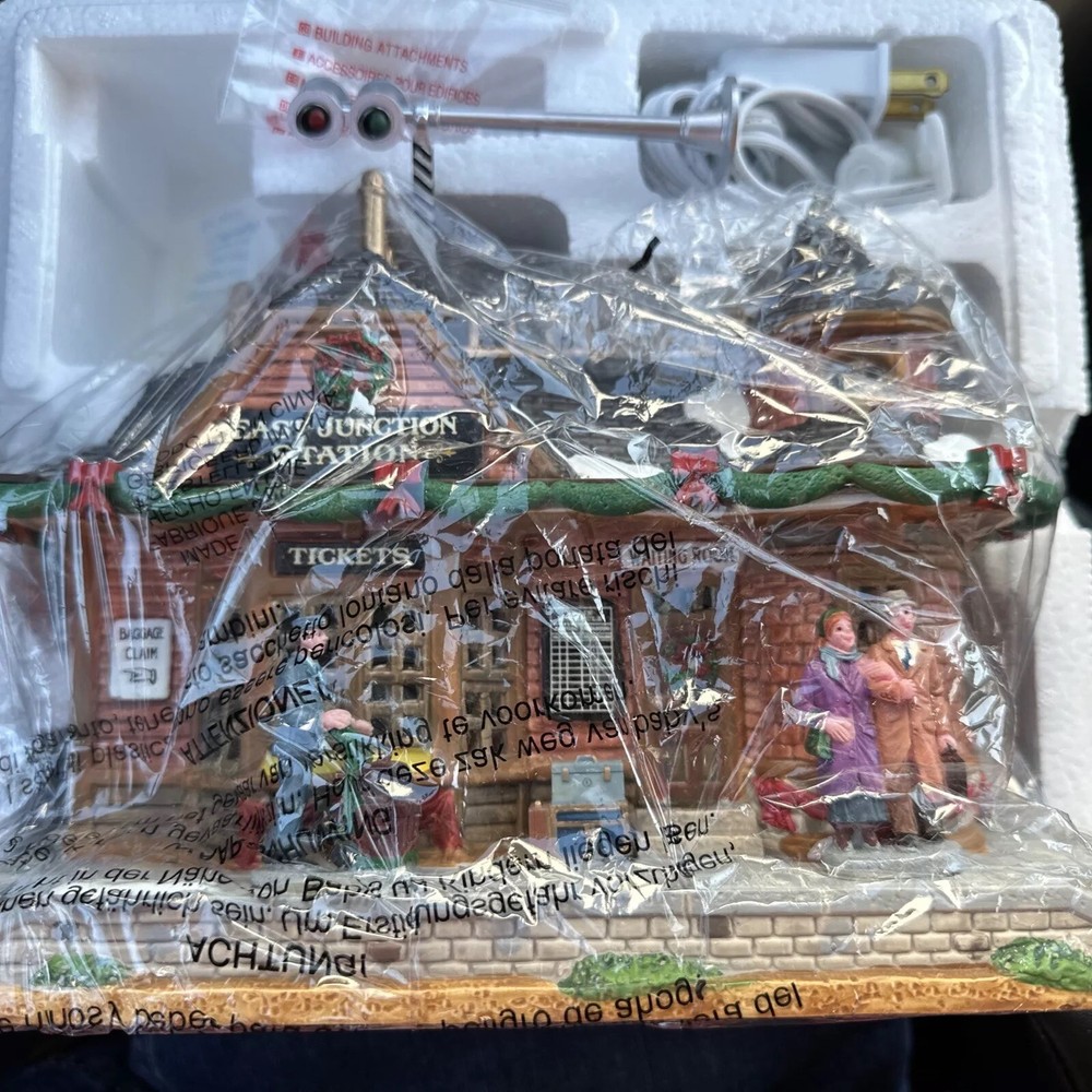 The Lemax East Junction Station #75256 is a collectible village building part of the Lemax brand. This holiday and seasonal piece depicts a charming train station scene, perfect for creating a festive village display.