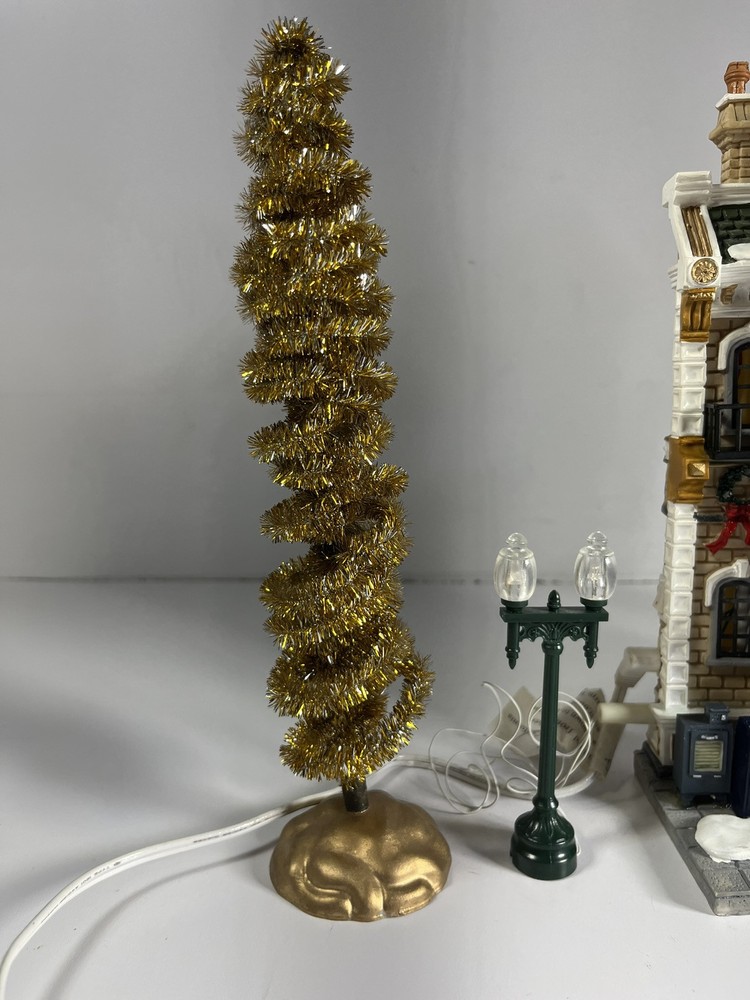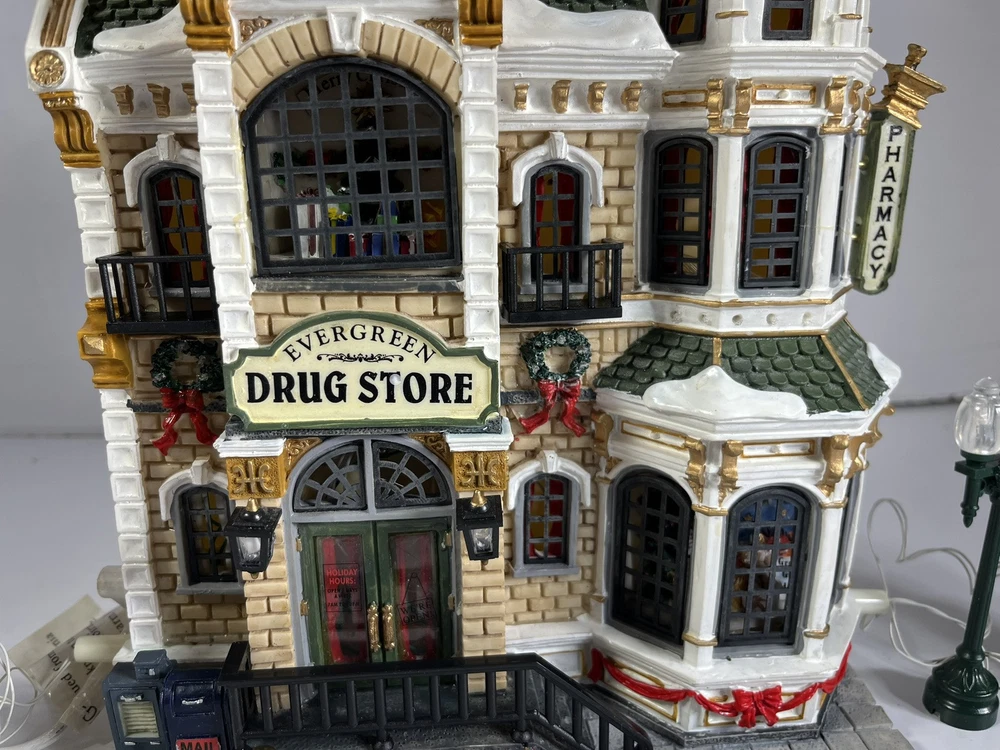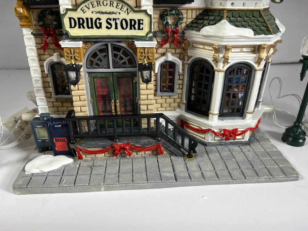 Lemax Essex Street Facade Evergreen Drug Store Fiber Optic BONUS Trees/lightpost NOTE: one lightpost is missing the wreath and a bo All is broken off and missing from the roof peak, see closeup photo. Comes in original box, lights work great and it does come with an AC adapter