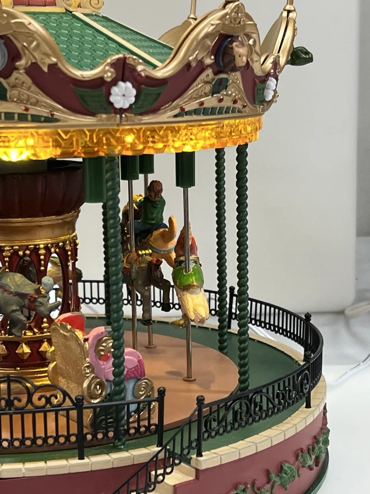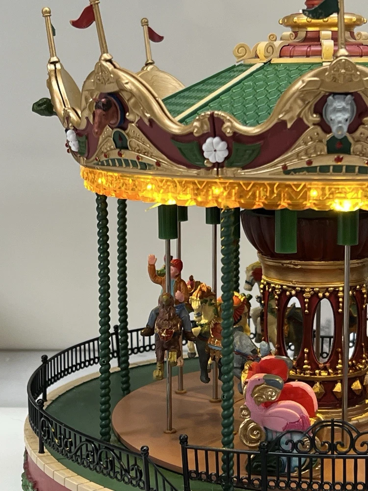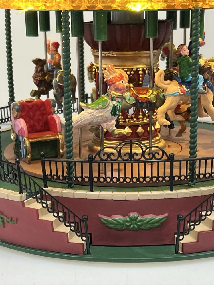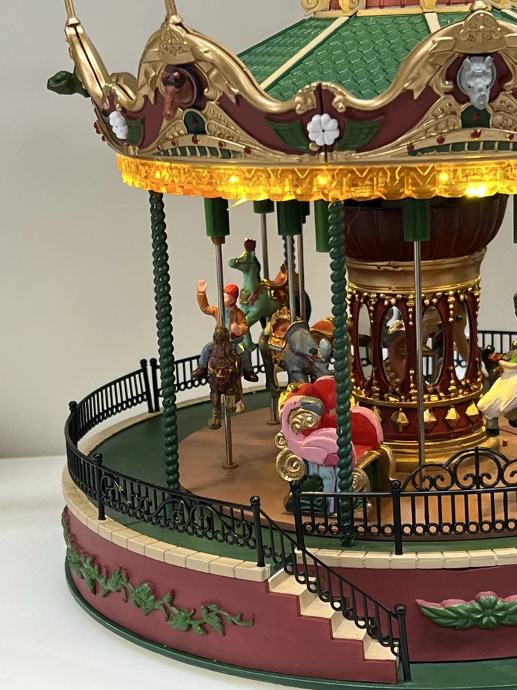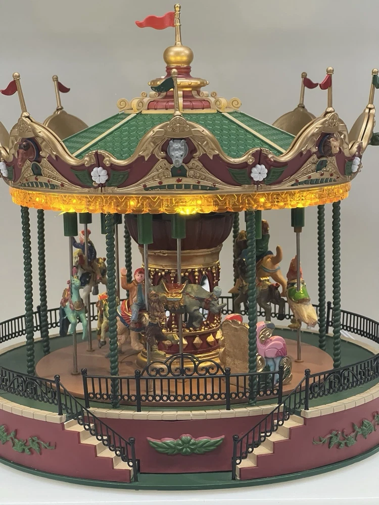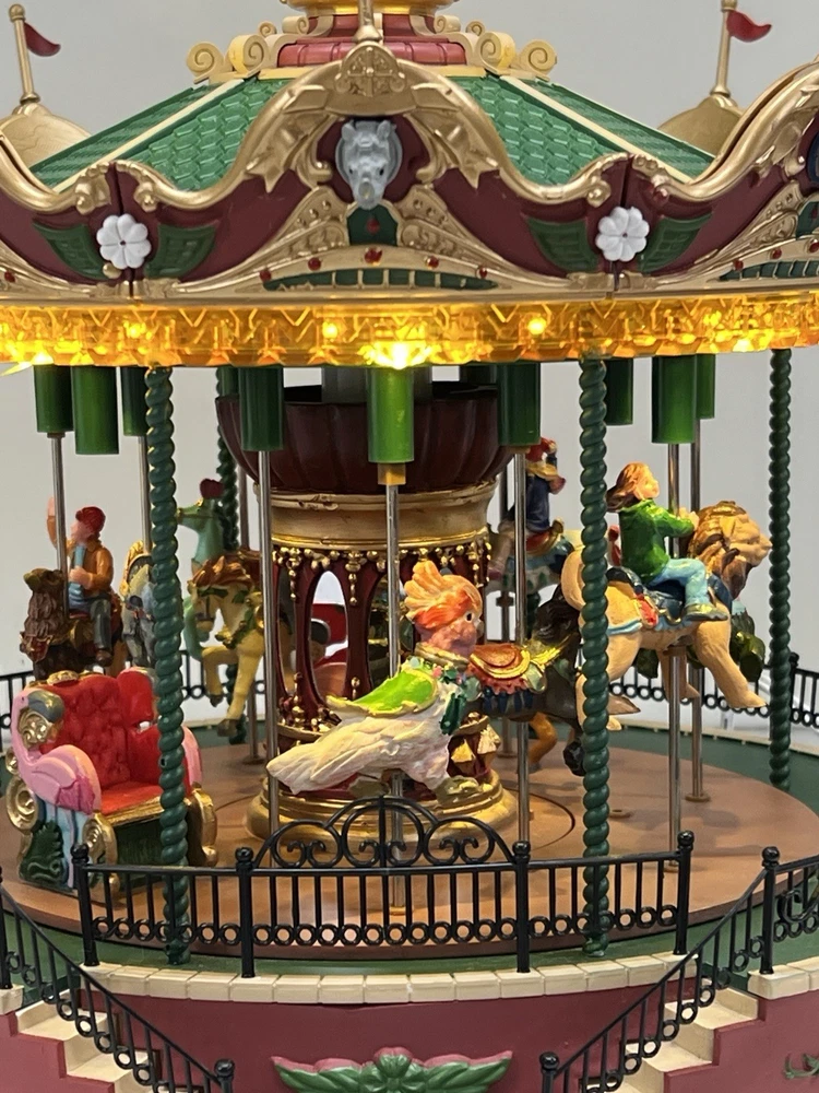 The Lemax Jungle Carousel Animated Action with Lights, Carnival Music, and a Whimsical Carnival Carousel design is a large, beautifully hand-painted Christmas Village display piece. This American-themed illuminated carousel features a 3D effect and comes boxed with a musical feature, making it an ideal addition to any room for adults who enjoy collecting holiday decor. With its bright red and multicolored whimsical design, this 2016 release from Lemax captures the enchantment of carnival rides in a charming and nostalgic way. Absolutely incredible detail and color ! Pristine condition & works perfectly. You can adjust the music from off to loud while all the lights stay on ! Just a beautiful piece! Comes with all original packaging including ac adapter .