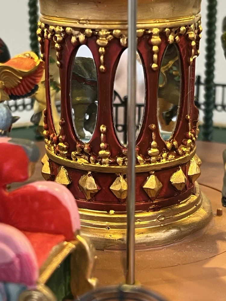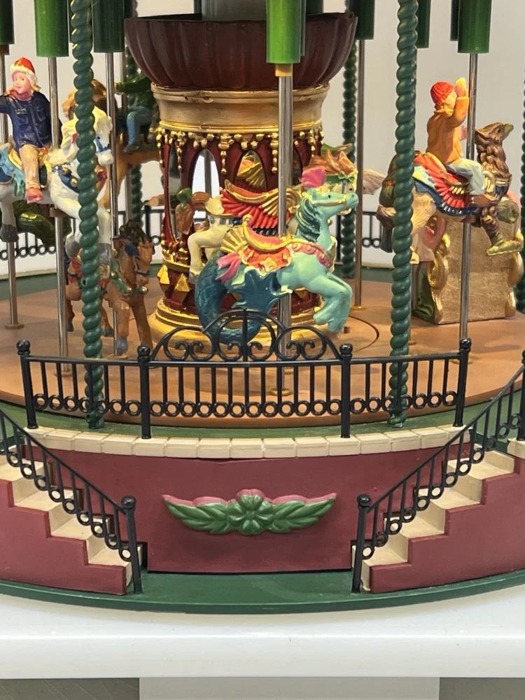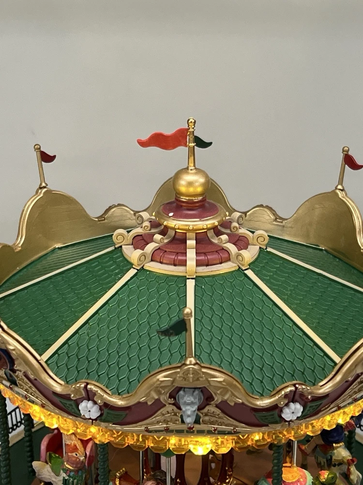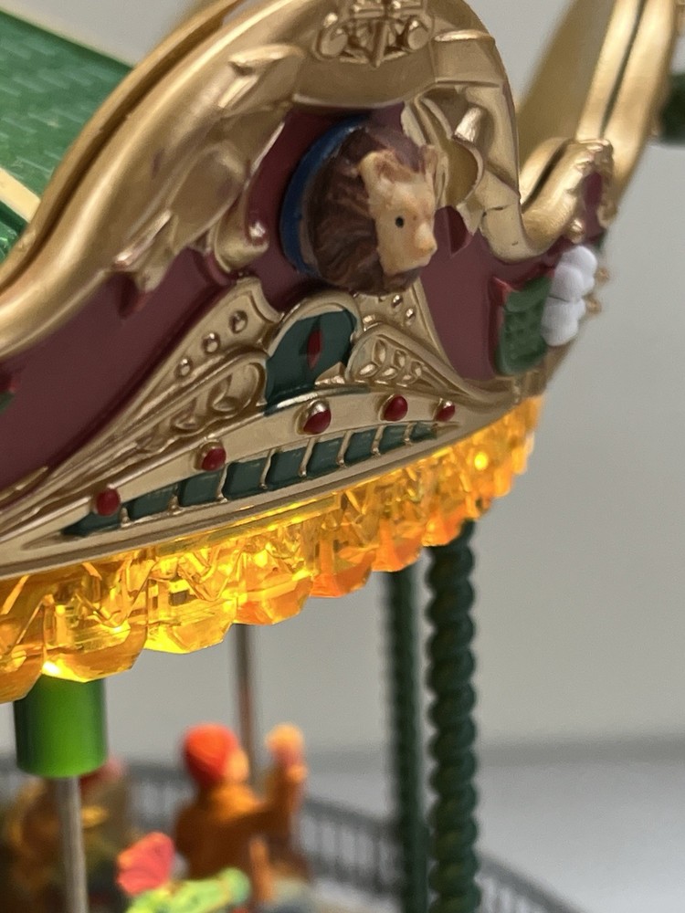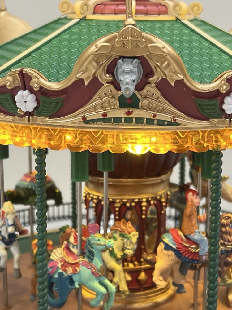 The Lemax Jungle Carousel Animated Action with Lights, Carnival Music, and a Whimsical Carnival Carousel design is a large, beautifully hand-painted Christmas Village display piece. This American-themed illuminated carousel features a 3D effect and comes boxed with a musical feature, making it an ideal addition to any room for adults who enjoy collecting holiday decor. With its bright red and multicolored whimsical design, this 2016 release from Lemax captures the enchantment of carnival rides in a charming and nostalgic way. Absolutely incredible detail and color ! Pristine condition & works perfectly. You can adjust the music from off to loud while all the lights stay on ! Just a beautiful piece! Comes with all original packaging including ac adapter .