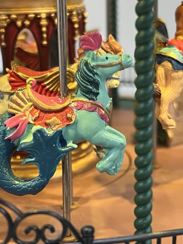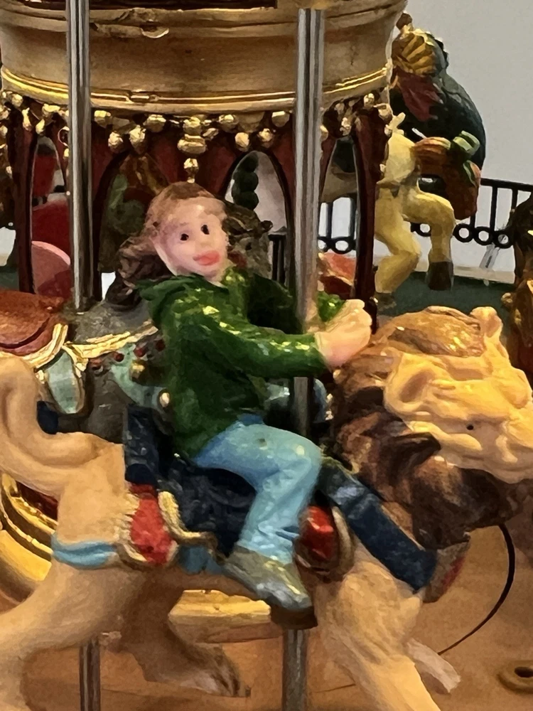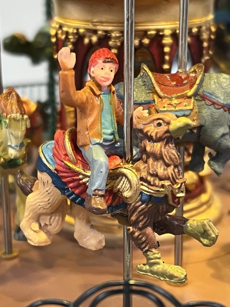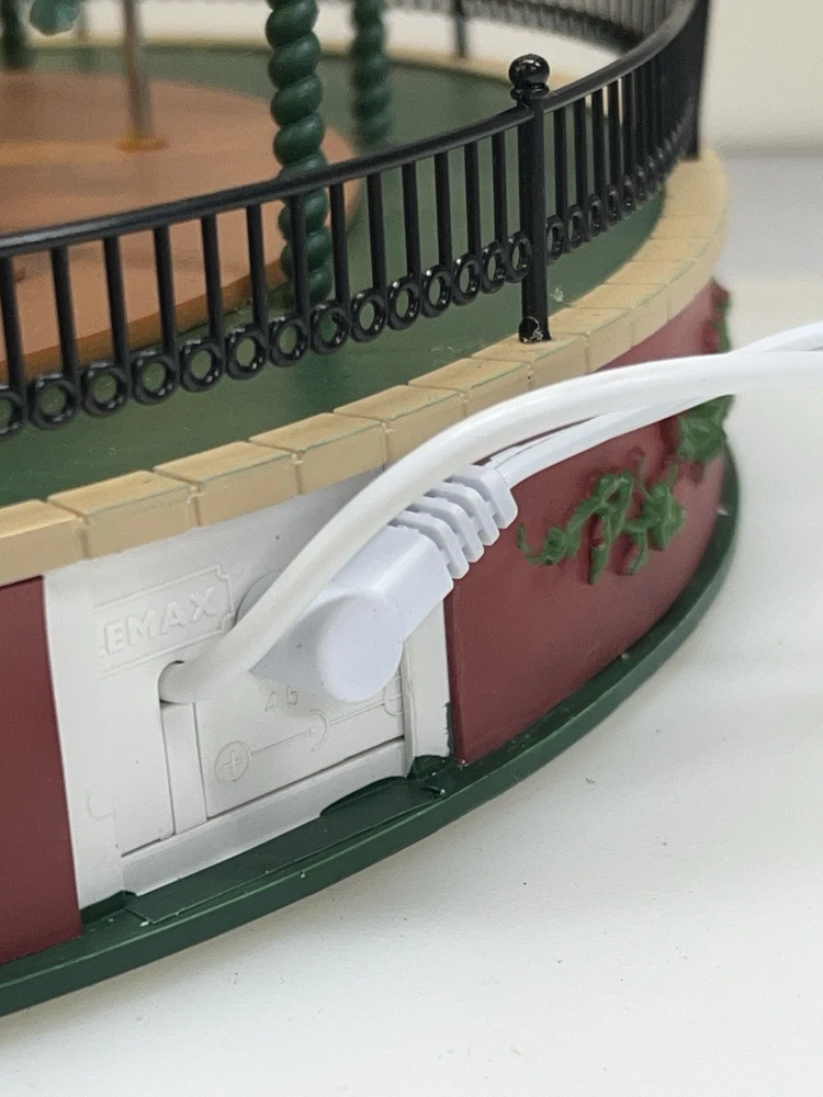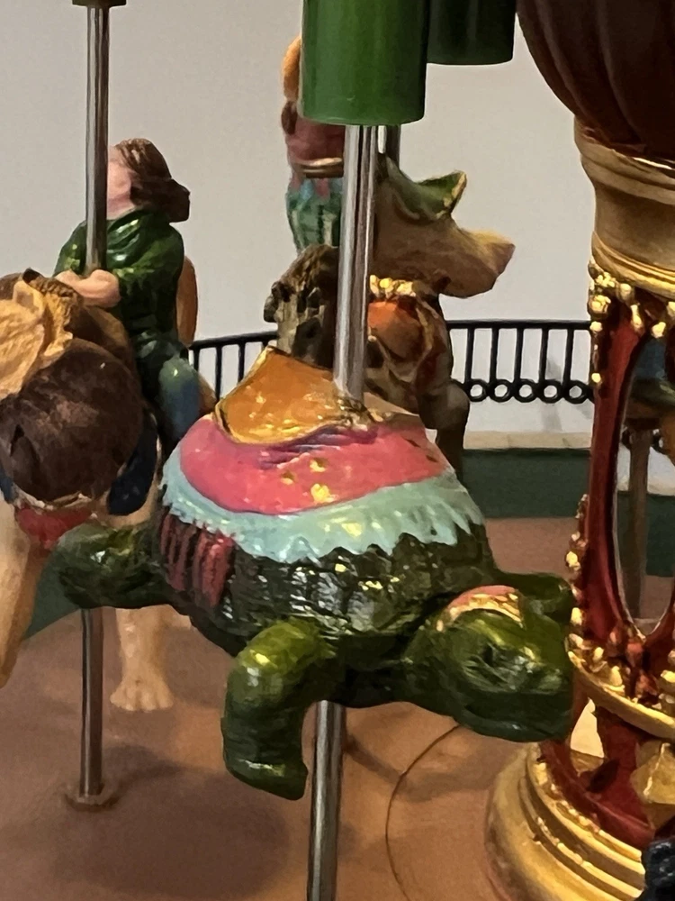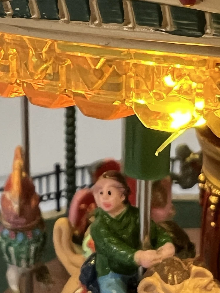 The Lemax Jungle Carousel Animated Action with Lights, Carnival Music, and a Whimsical Carnival Carousel design is a large, beautifully hand-painted Christmas Village display piece. This American-themed illuminated carousel features a 3D effect and comes boxed with a musical feature, making it an ideal addition to any room for adults who enjoy collecting holiday decor. With its bright red and multicolored whimsical design, this 2016 release from Lemax captures the enchantment of carnival rides in a charming and nostalgic way. Absolutely incredible detail and color ! Pristine condition & works perfectly. You can adjust the music from off to loud while all the lights stay on ! Just a beautiful piece! Comes with all original packaging including ac adapter .