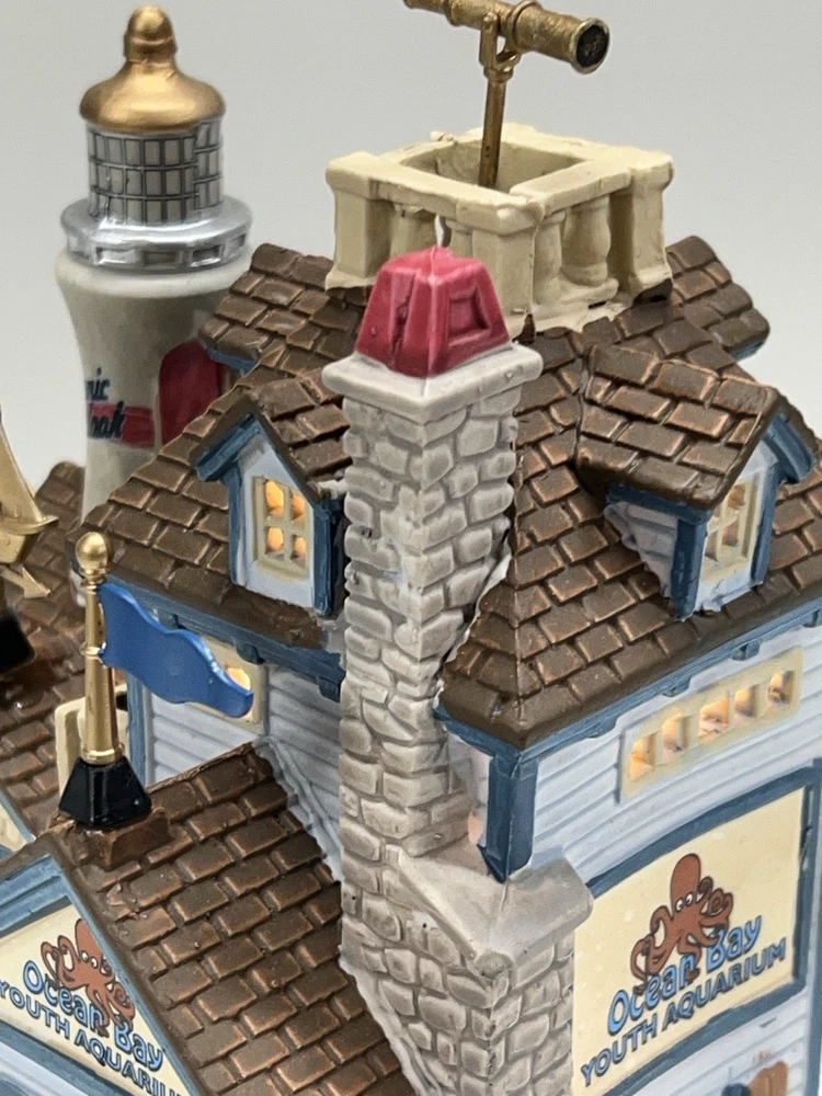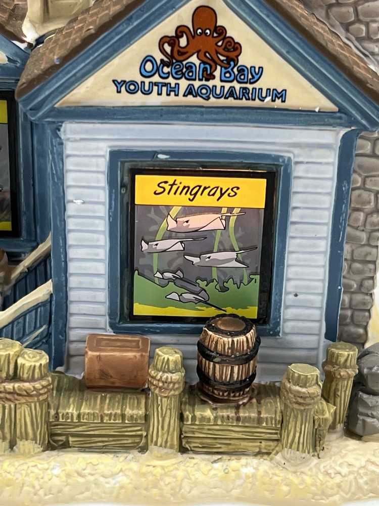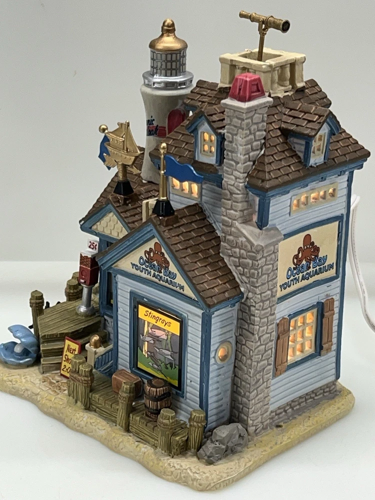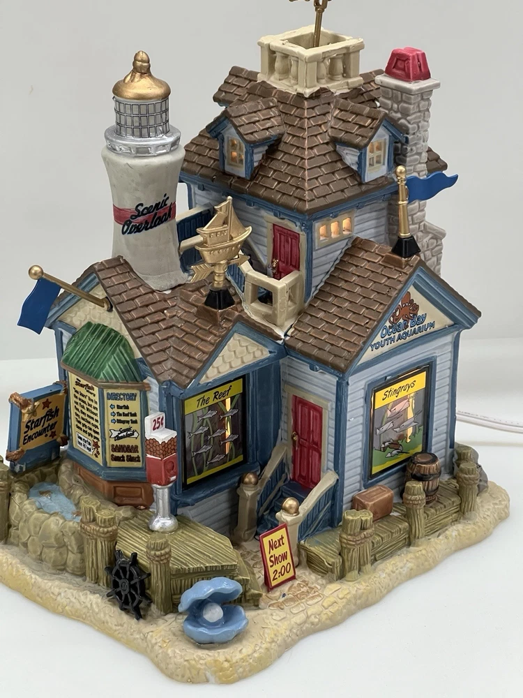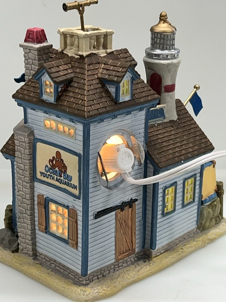 The Lemax "Ocean Bay Youth Aquarium" 2017 is a rare piece with a cord and light, perfect for adding a whimsical touch to your holiday decor. This asymmetrical ceramic and porcelain village display features an illuminated and retired American-style Christmas house in a nautical theme. The medium-sized aquarium piece, measuring 7" in length, 8" in height, and 5" in width, is part of the Ocean Bay Youth Aquarium collection and is sure to delight collectors of holiday villages and houses. Made in China during the 21st century, this original piece is a unique addition to any room during the Christmas season. Excellent condition with original box , cord & light ! Extremely rare item seldom seen!