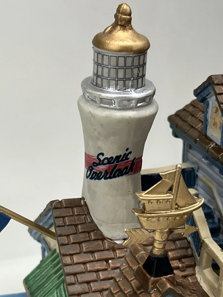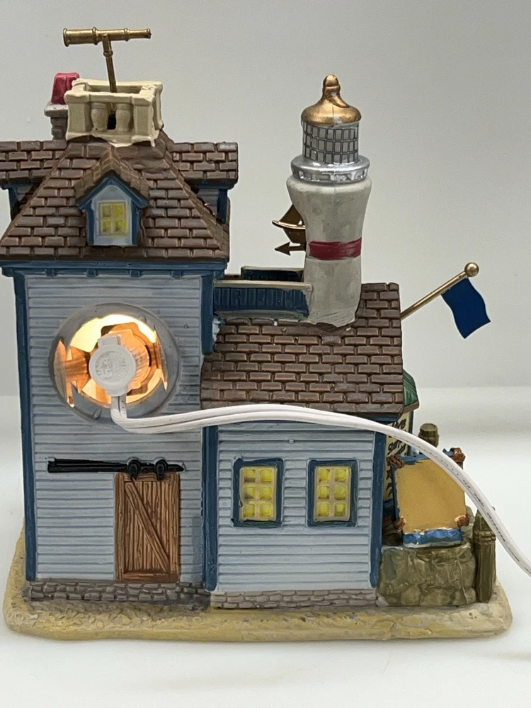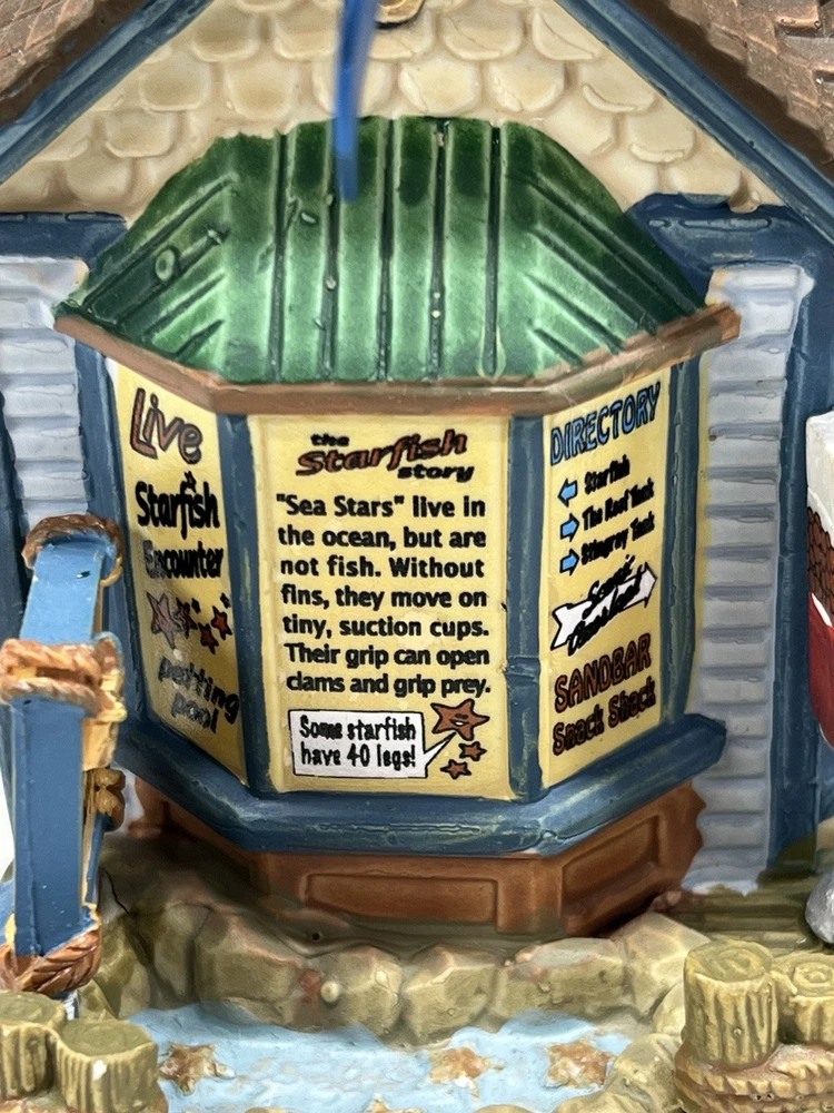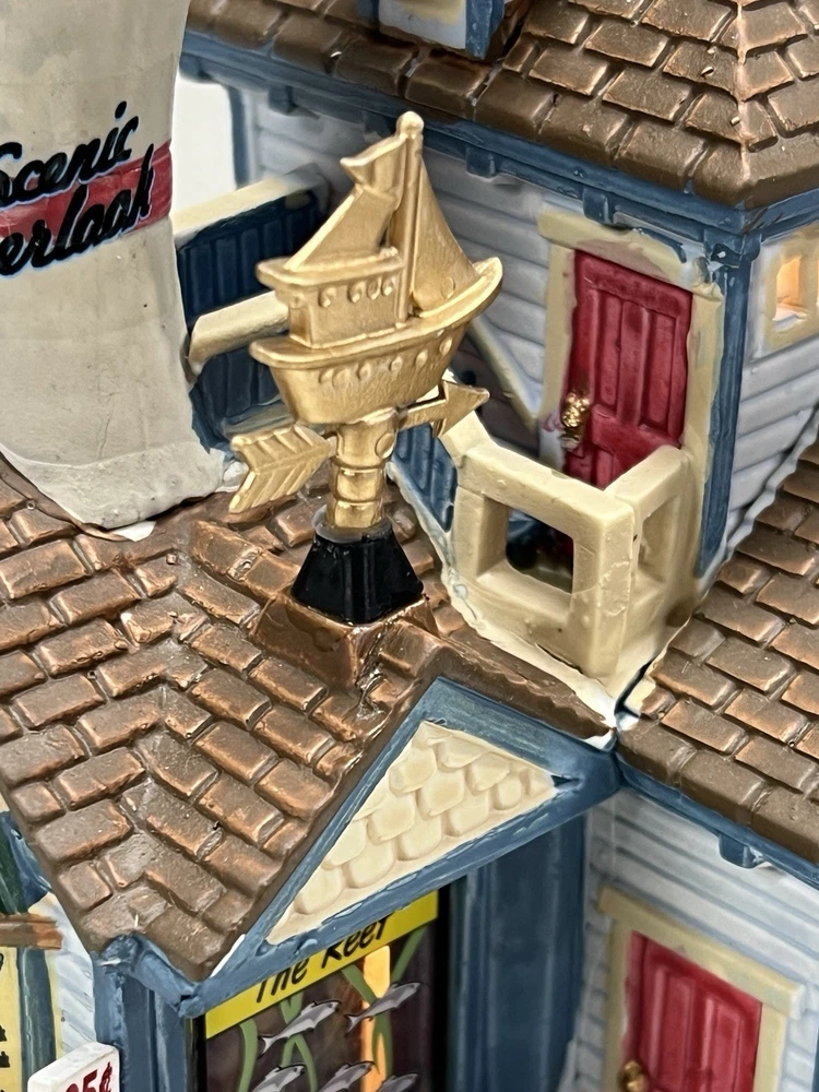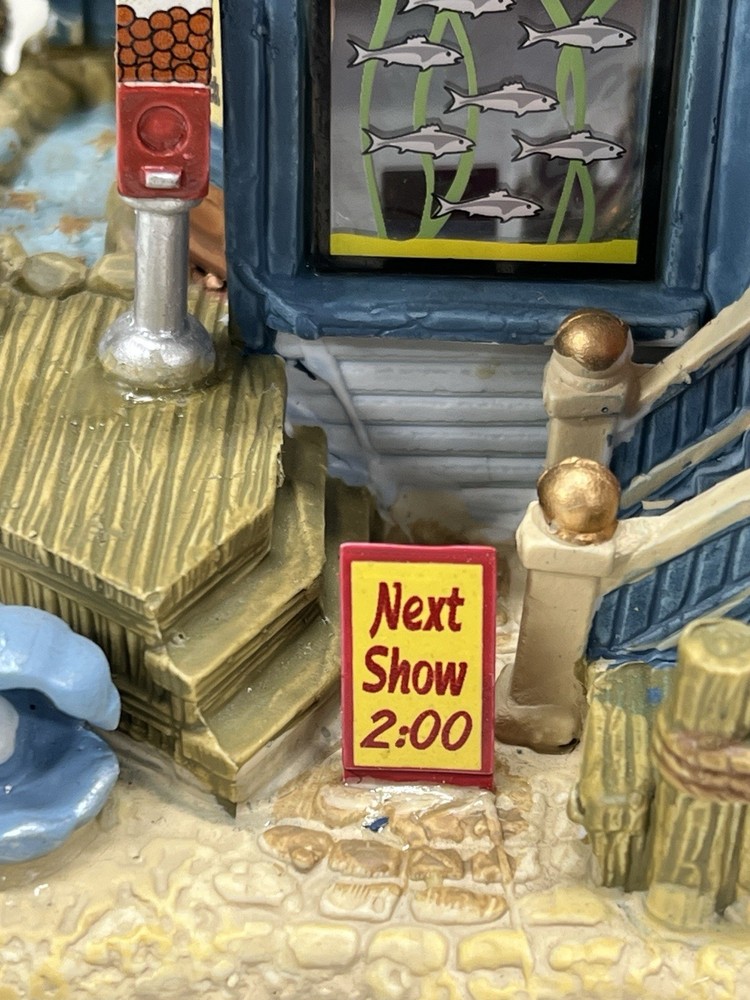 The Lemax "Ocean Bay Youth Aquarium" 2017 is a rare piece with a cord and light, perfect for adding a whimsical touch to your holiday decor. This asymmetrical ceramic and porcelain village display features an illuminated and retired American-style Christmas house in a nautical theme. The medium-sized aquarium piece, measuring 7" in length, 8" in height, and 5" in width, is part of the Ocean Bay Youth Aquarium collection and is sure to delight collectors of holiday villages and houses. Made in China during the 21st century, this original piece is a unique addition to any room during the Christmas season. Excellent condition with original box , cord & light ! Extremely rare item seldom seen!