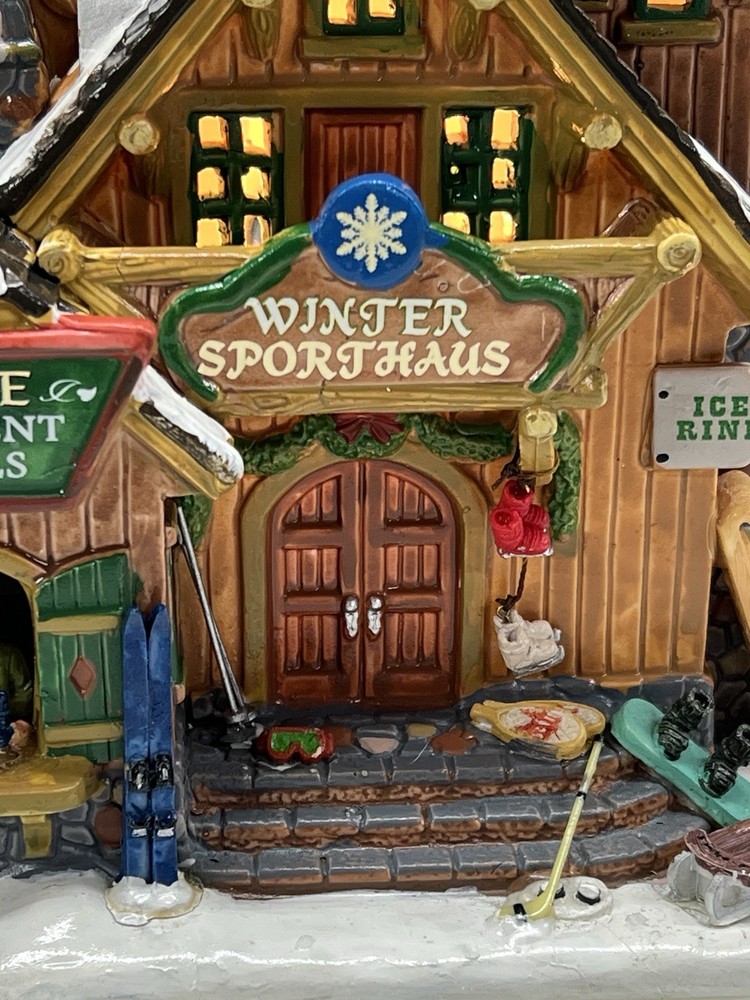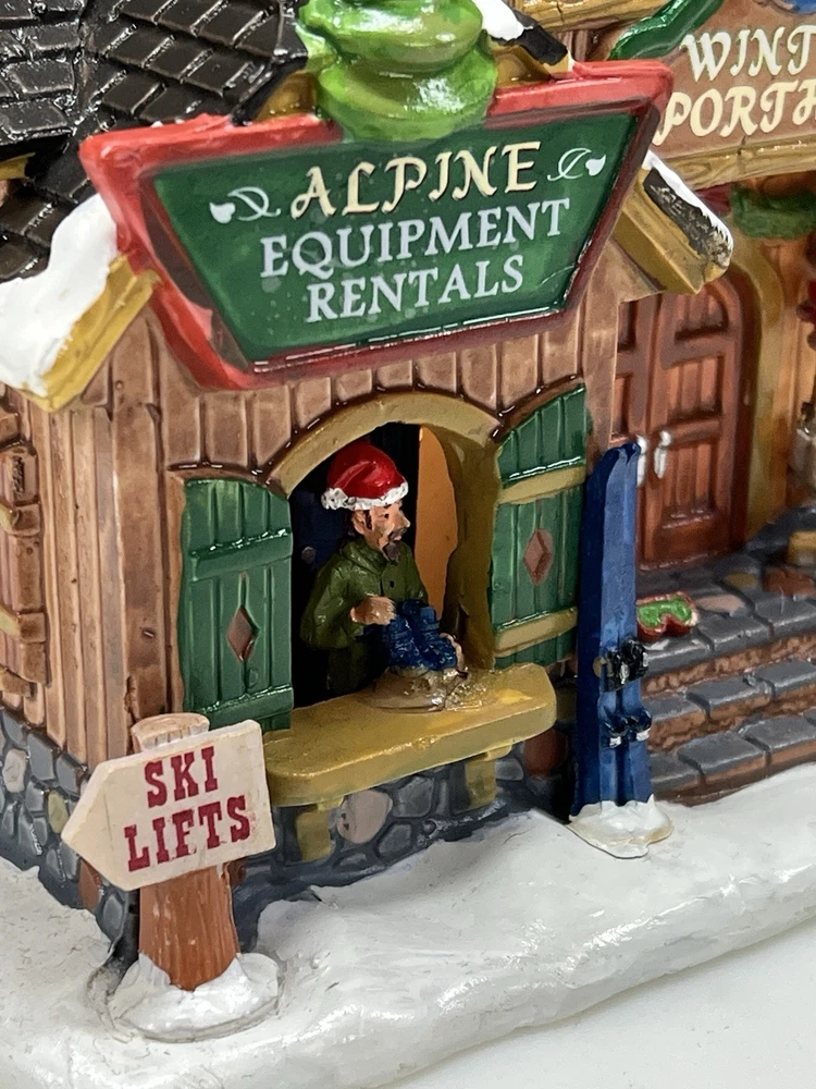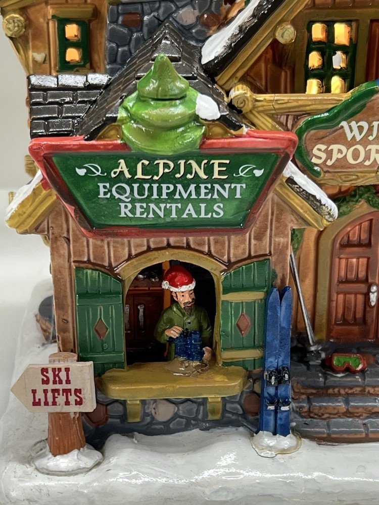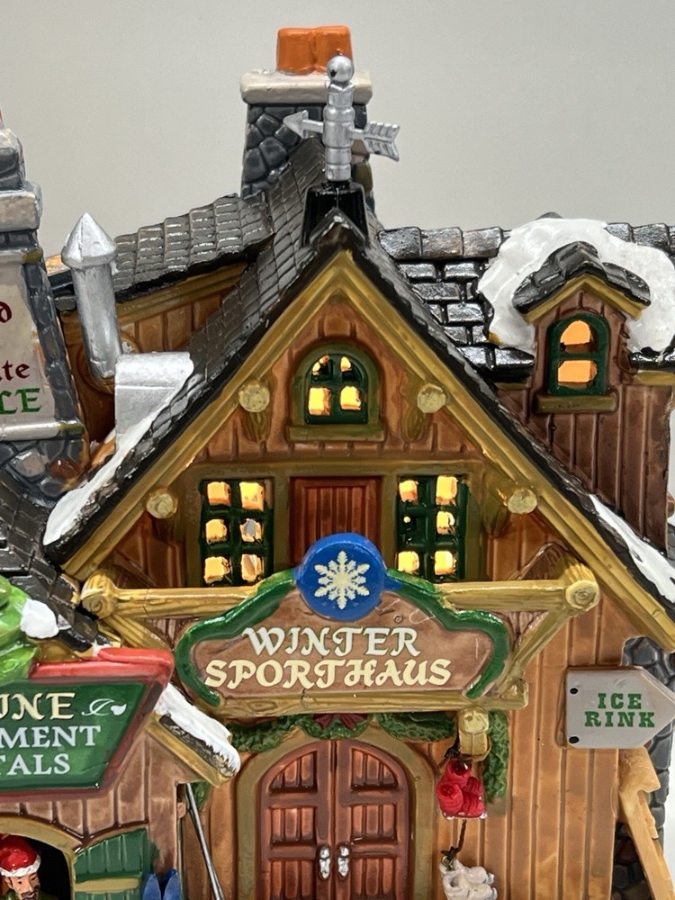The Lemax Winter Sporthaus Alpine Equipment Rental 25369 is a medium-sized, asymmetrical lodge-style building designed for village display. Hand-painted with a whimsical ski lodge pattern, this illuminated Christmas village house features a 3D effect and comes boxed as a rare find from 2012. Perfect for adults, this multicolored porcelain building is part of the Lemax collection and is suitable for any room in the house, adding a touch of seasonal, advertising, novelty, and sports-themed charm. Absolutely perfect pristine condition. Rare item seldom seen for sale . Includes all original packaging including weather vane, cord & light with clean packaging. Beautiful piece !