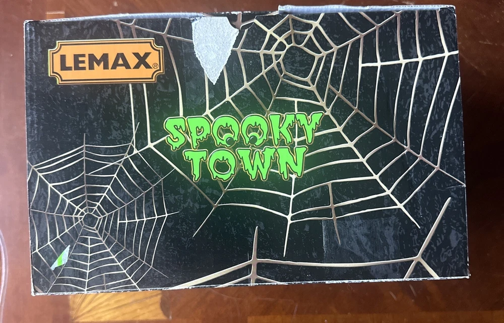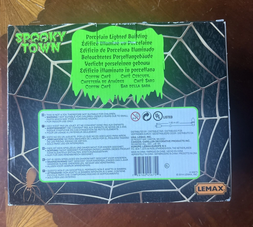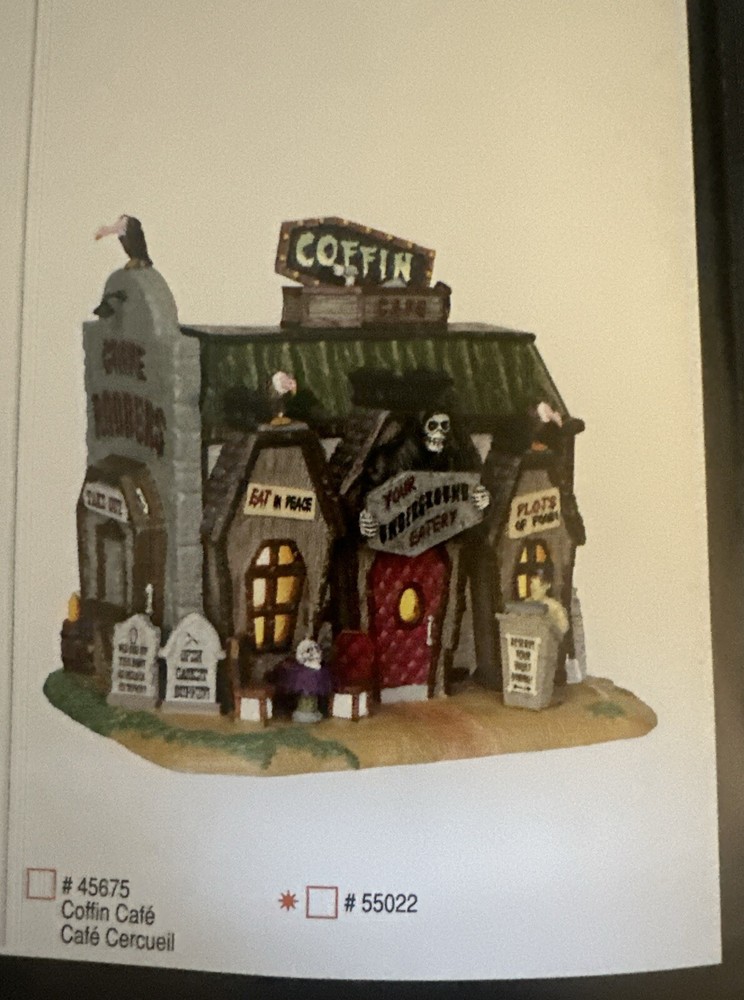 Lemax Spooky Town Coffin Cafe Porcelain Lighted Building #45675 With Light & Box New open box this was purchased at a estate sale Looks like it has never been used haunted cafe is still in plastic wrap and the light bulb in plastic wrap. Please see pictures for details Kindly send me a message if you have any questions. Thank you for looking 🎃 Bin 14