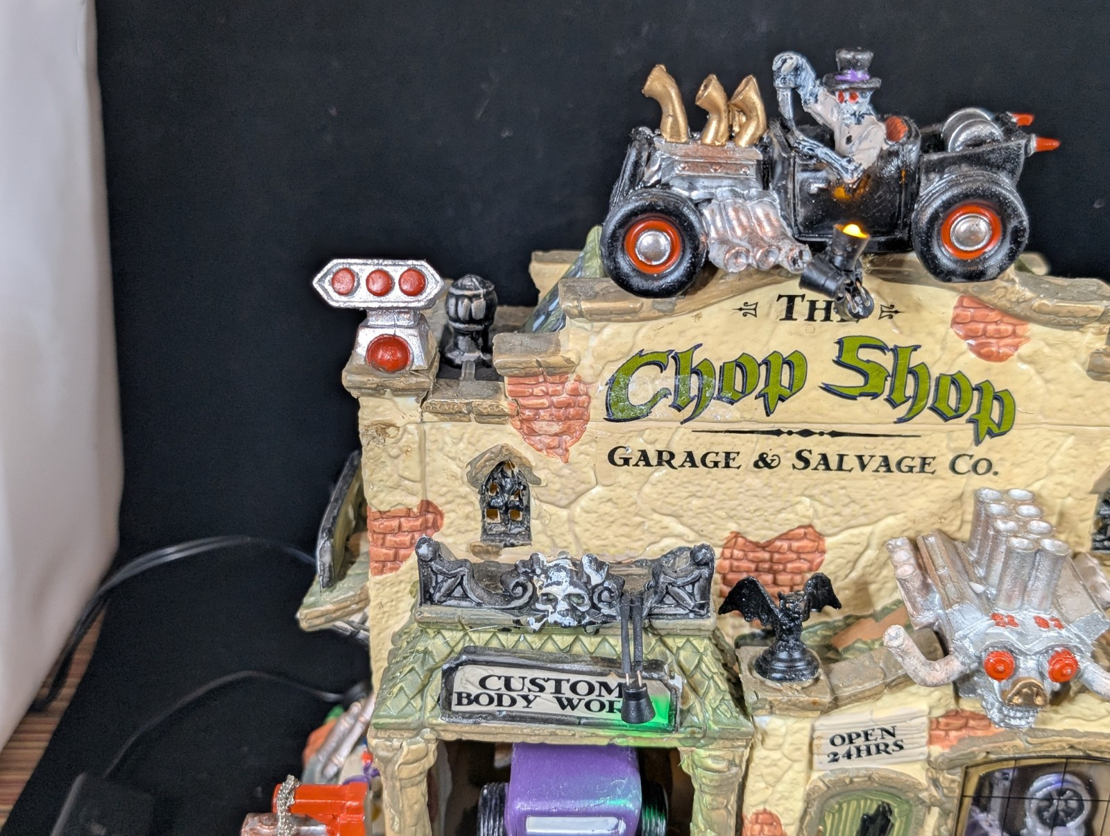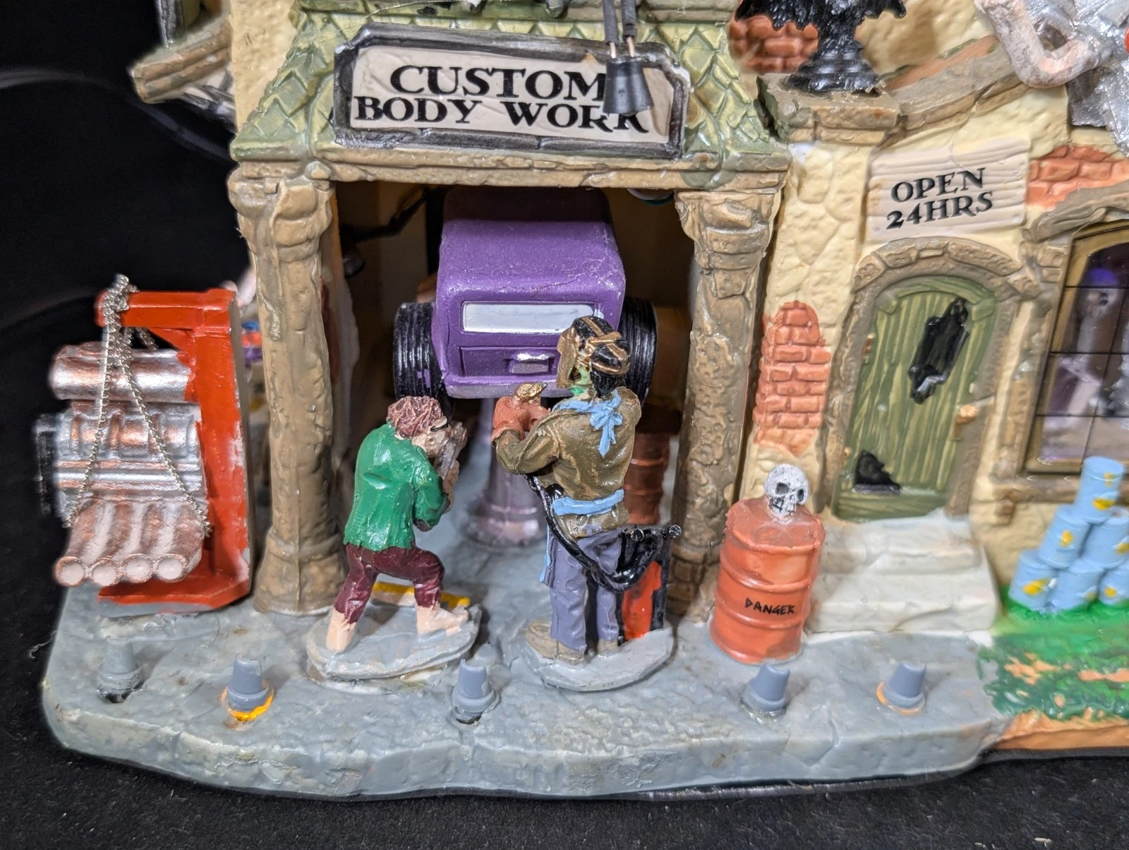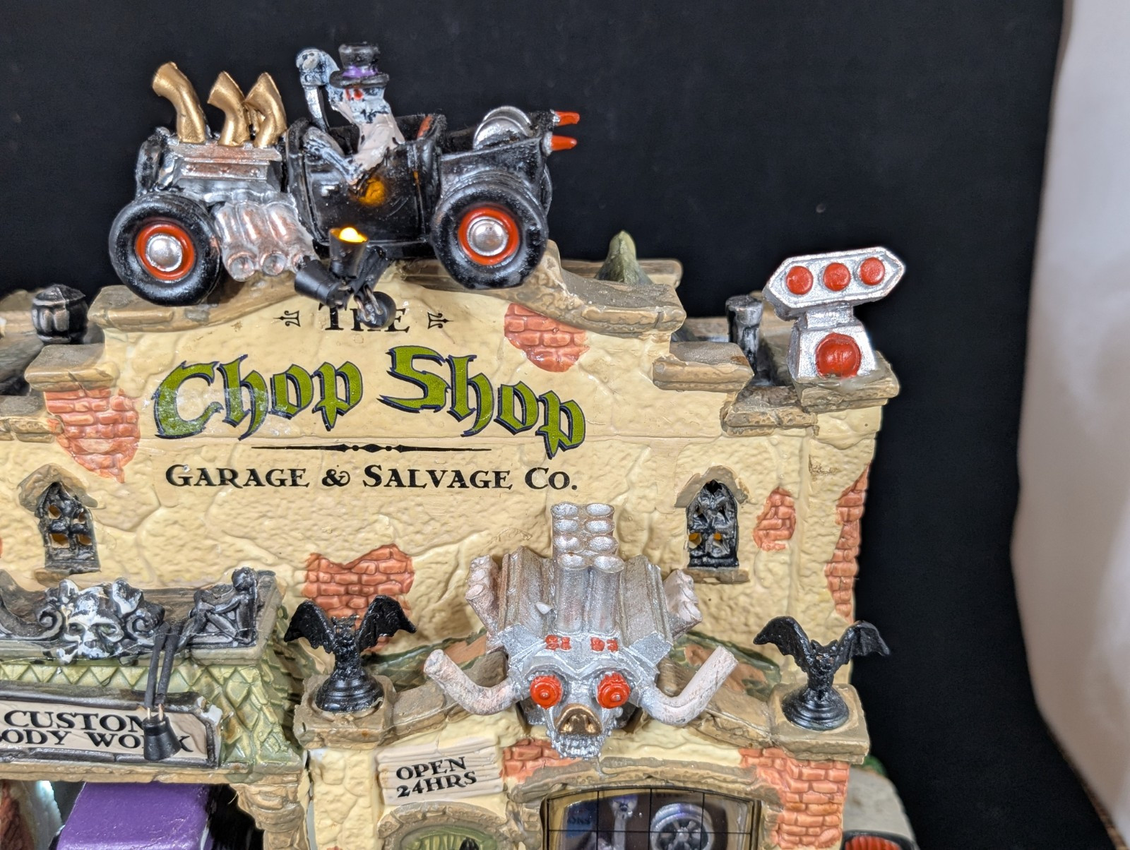 This is a Lemax figurine from the Spooky Village collection for Halloween. It features "The Chop Shop Garage & Salvage Co." with a spooky theme of monsters and skeletons. The figurine is made of porcelain and ceramics, and includes sounds and lights for added spookiness. It does not come in its original packaging. Perfect for decorating any room for Halloween.