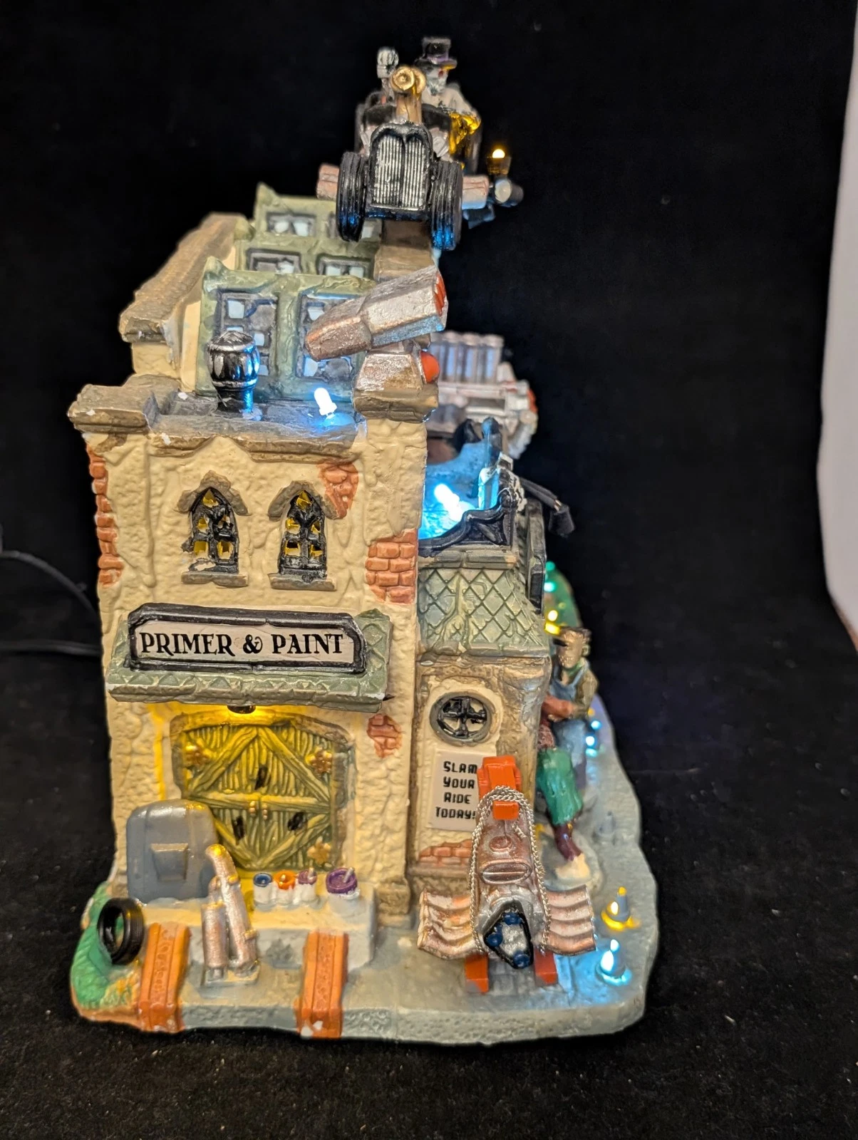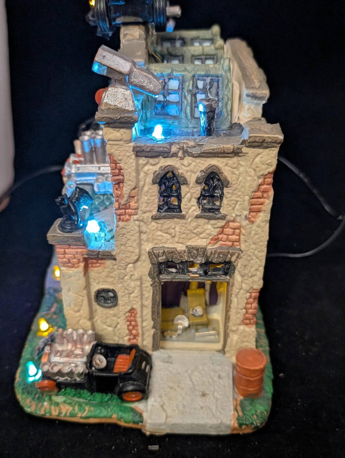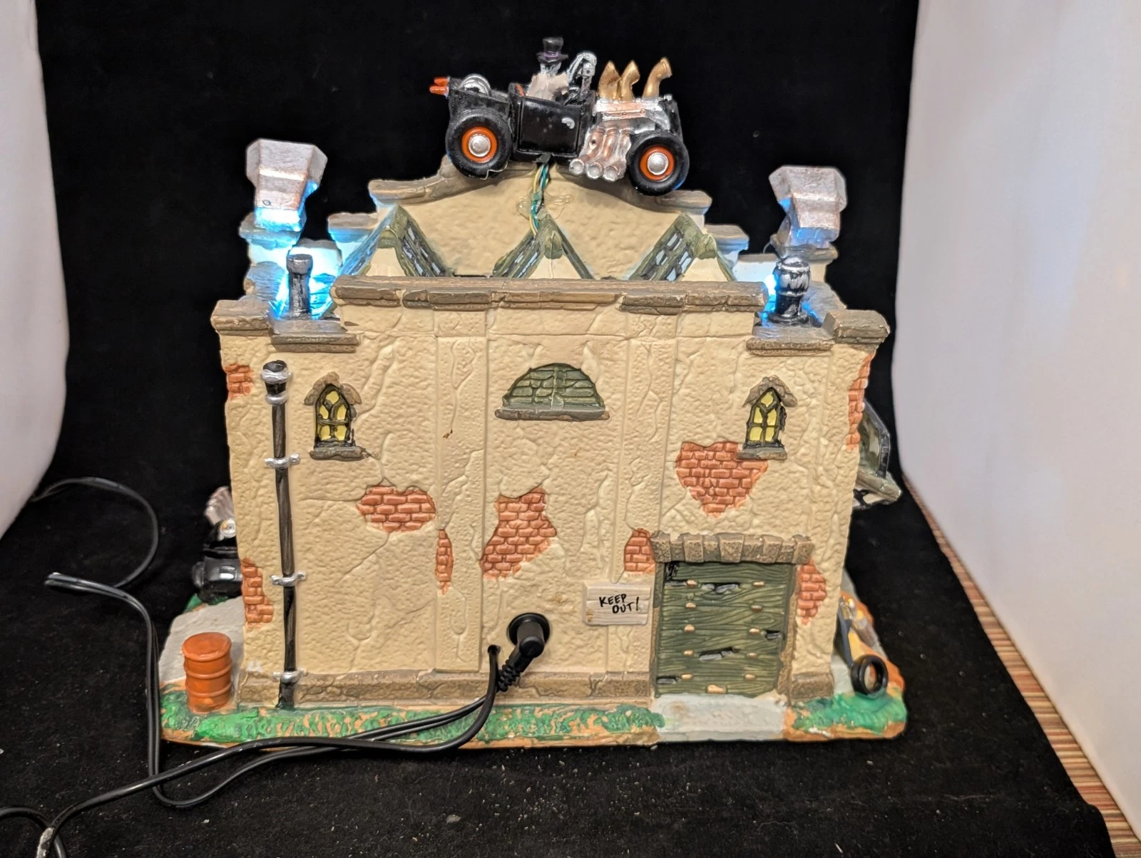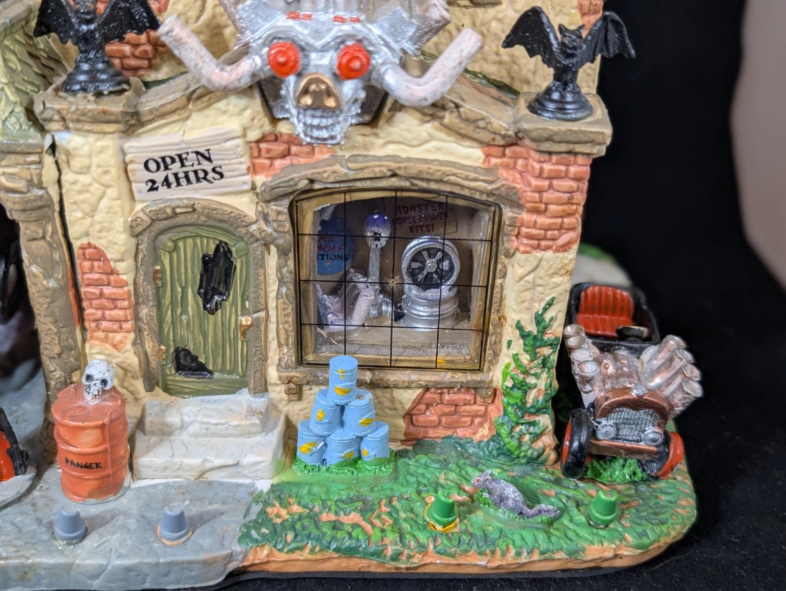 This is a Lemax figurine from the Spooky Village collection for Halloween. It features "The Chop Shop Garage & Salvage Co." with a spooky theme of monsters and skeletons. The figurine is made of porcelain and ceramics, and includes sounds and lights for added spookiness. It does not come in its original packaging. Perfect for decorating any room for Halloween.