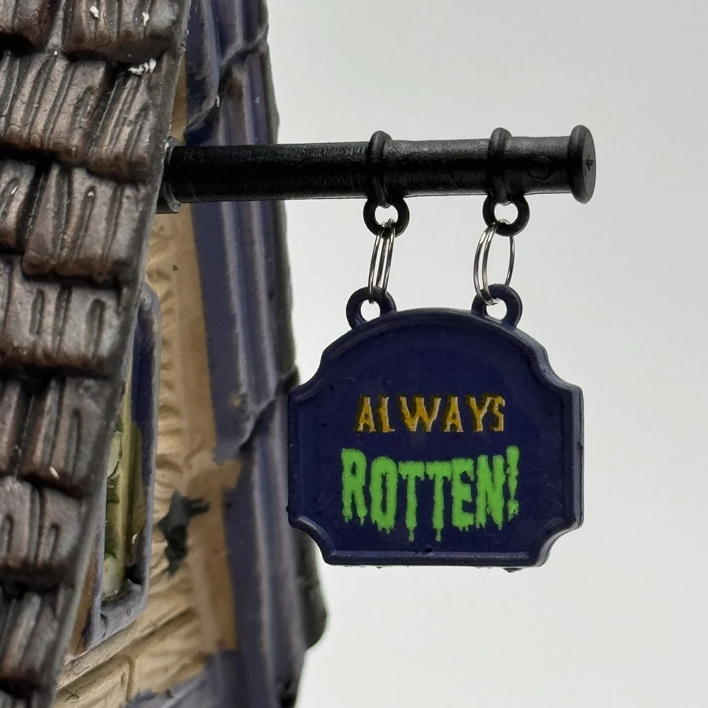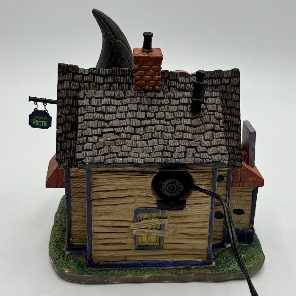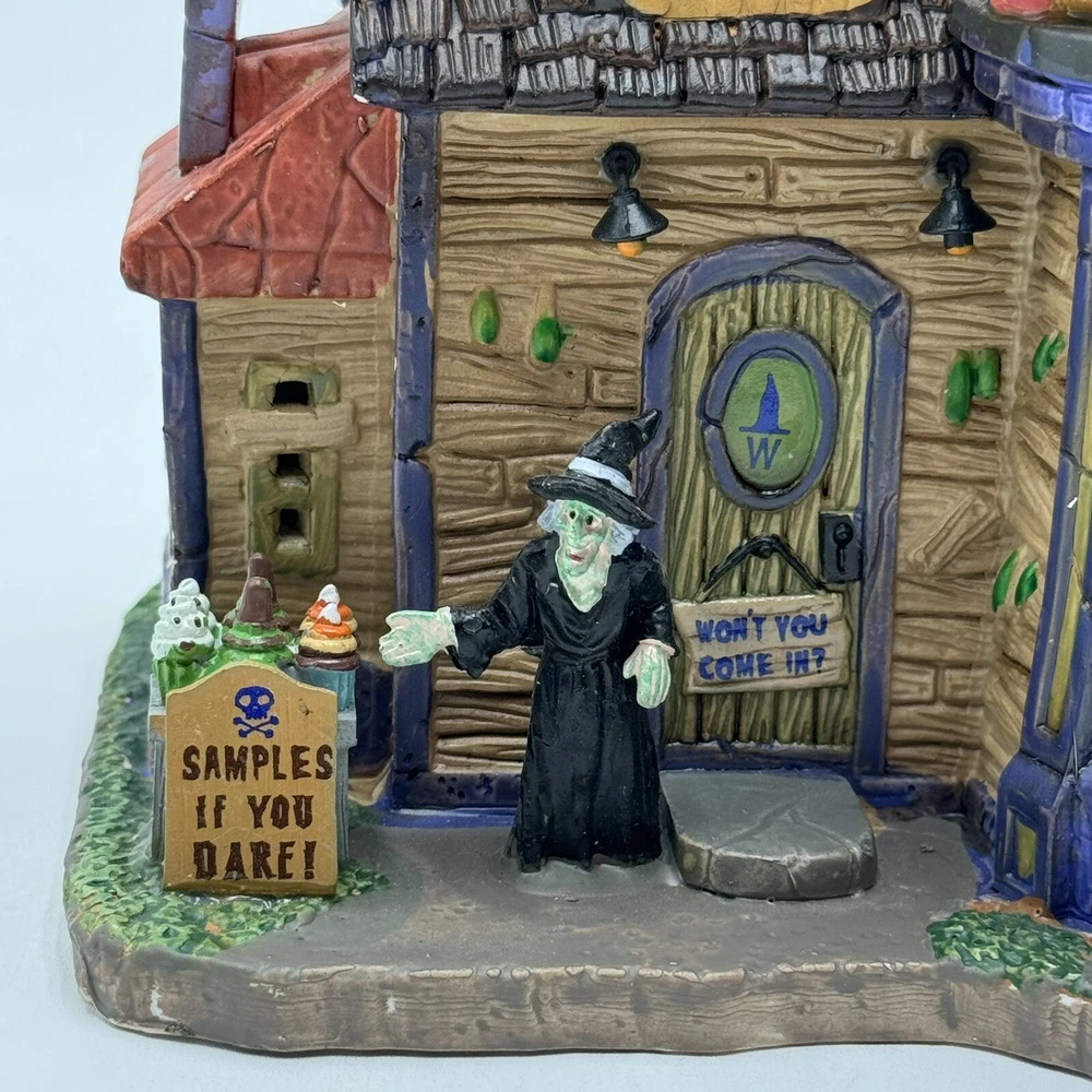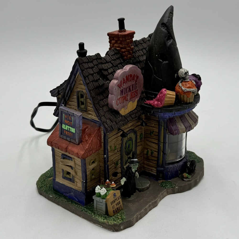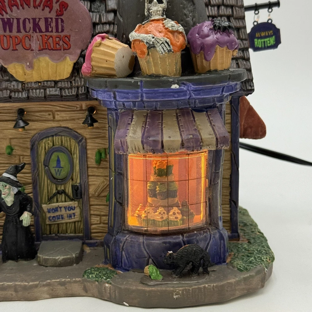 This Spooky Town cupcake set features Wanda's Wicked Cupcakes, perfect for Halloween celebrations. The set includes a box for easy gifting and storage. The multicolor designs and retired features make this a must-have for any Halloween collector. The Lemax brand is known for its quality and attention to detail, making this a great addition to any collection. The set is part of the Spooky Town collection and is perfect for seasonal and holiday decorations. This ceramic Halloween decoration has been glued back together multiple times. The item has also been chipped please look at all the pictures and video.