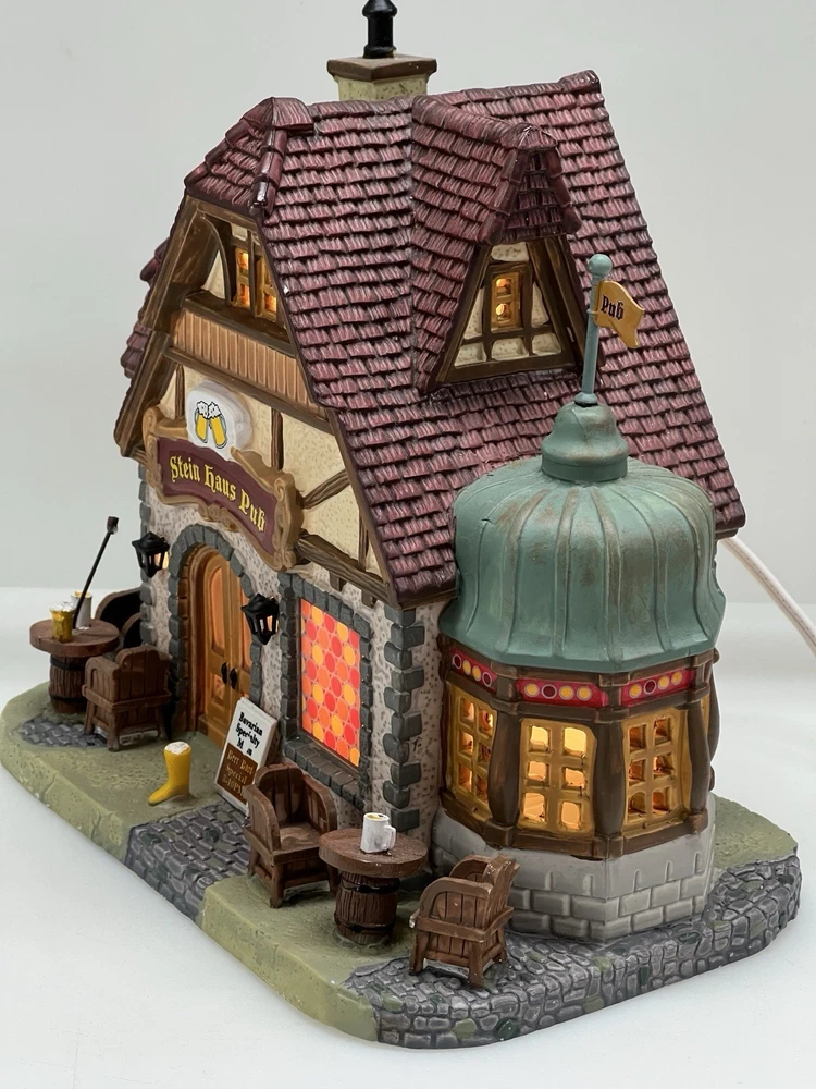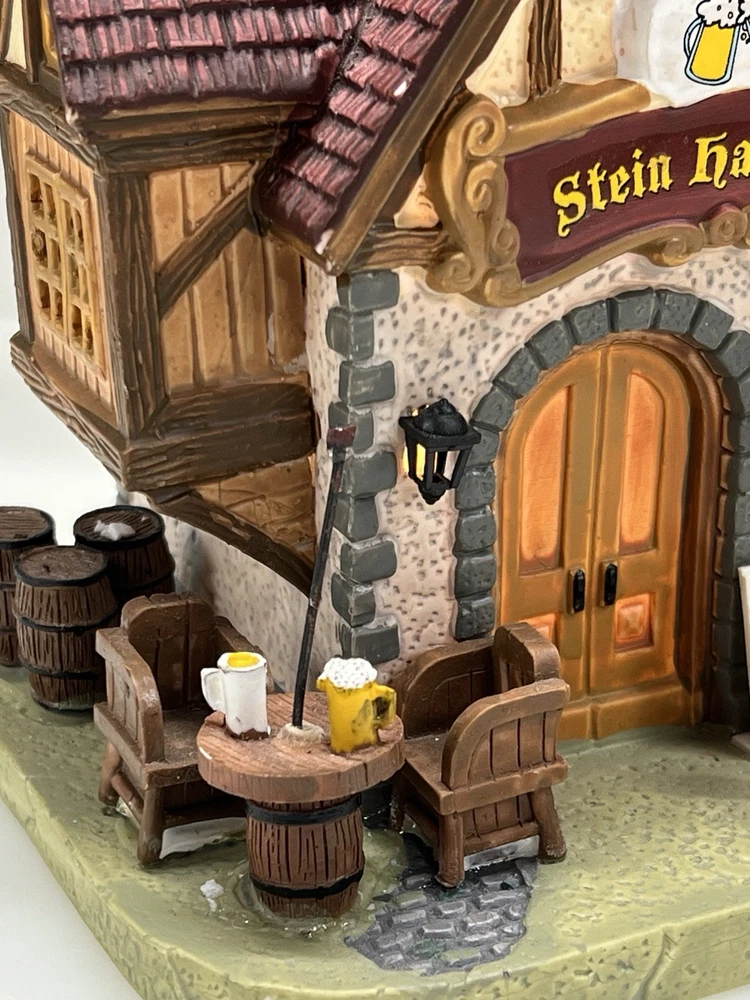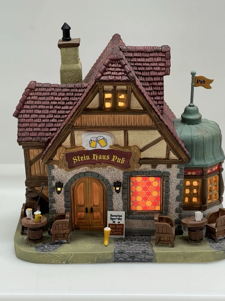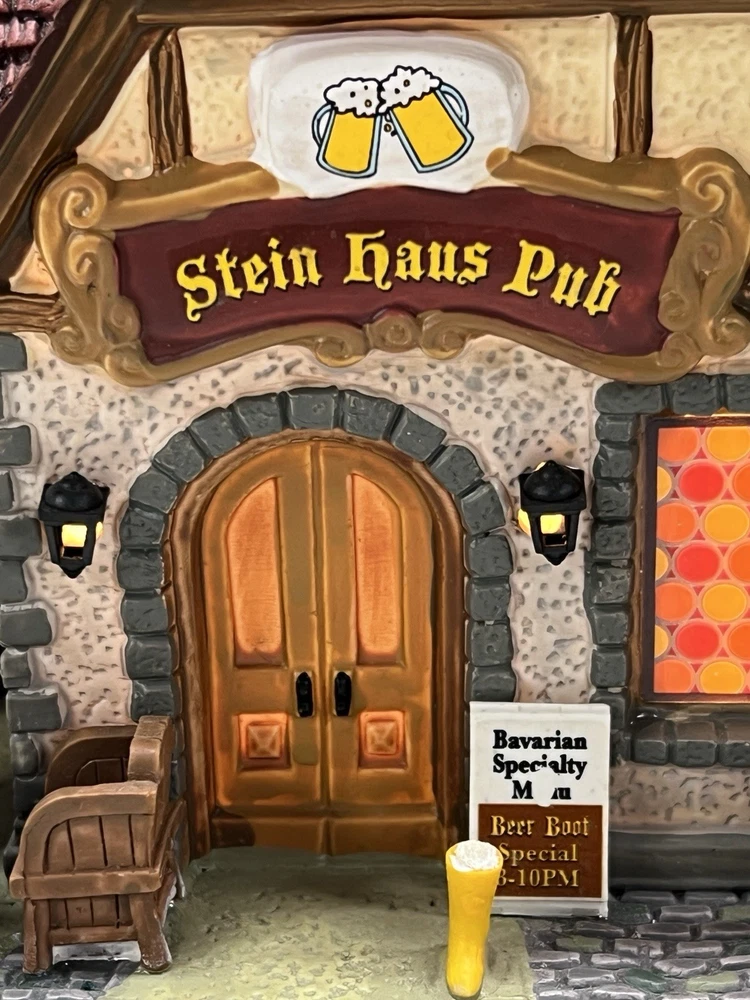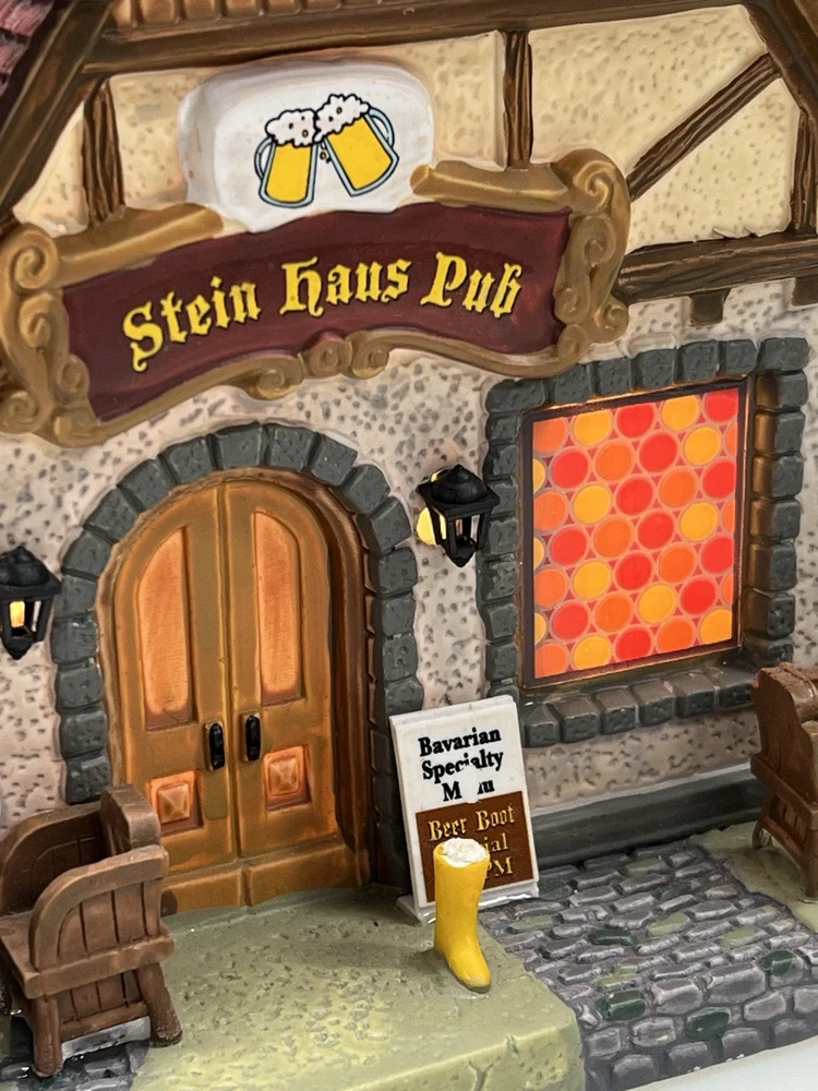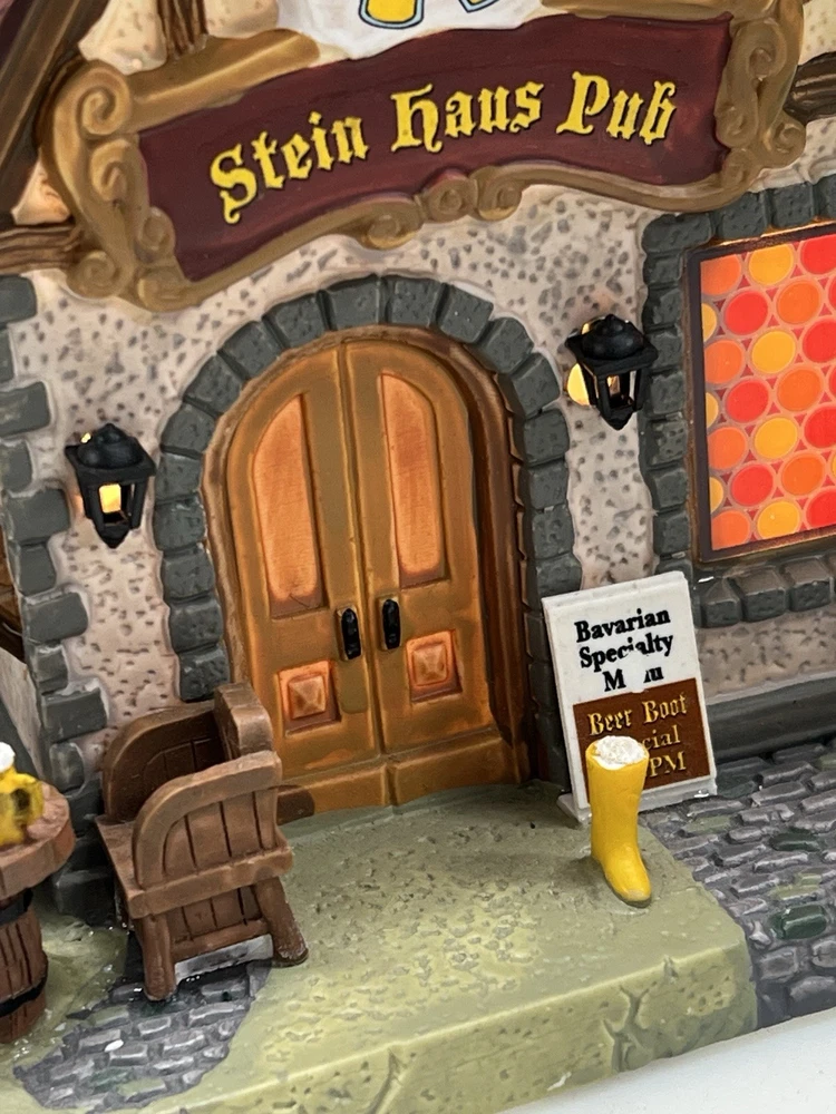 The Lemax Stein Haus Pub from Caddington Village is a medium-sized, hand-painted porcelain building featuring intricate Victorian-era architecture. This lighted Christmas village building is part of the Lemax Caddington Village Holidays & Seasons collection, with a colorful multicolor finish showcasing a beer boot and Bavarian specialty menu. Suitable for village display, this English-style building is perfect for adding a touch of mystery and romance to any room during the holiday season. With easy care instructions and a unique design, this collectible item is a must-have for Christmas decorations. Beautiful piece unfortunately missing umbrella over outside table . Comes with all original packaging including cord & light