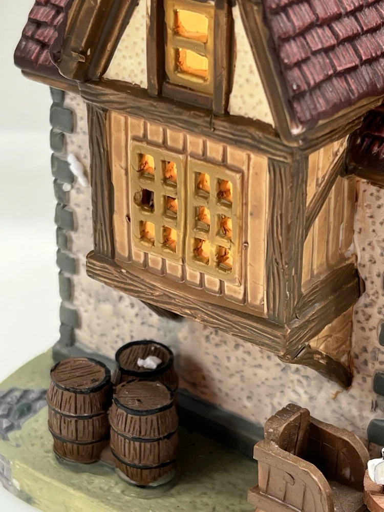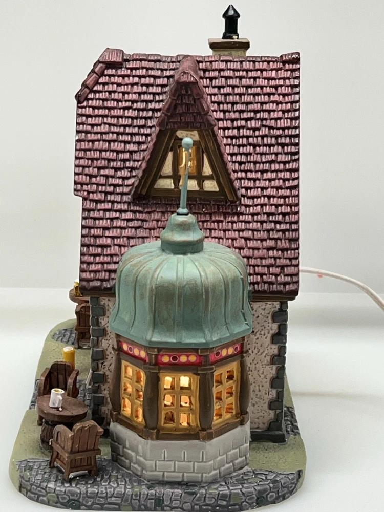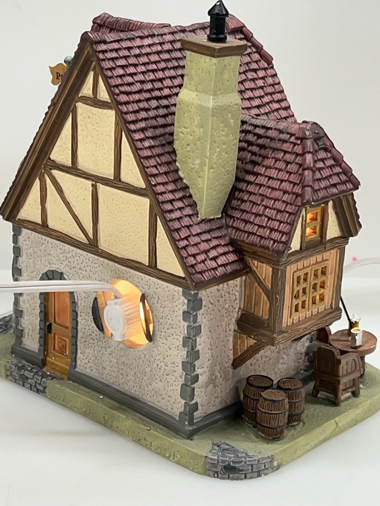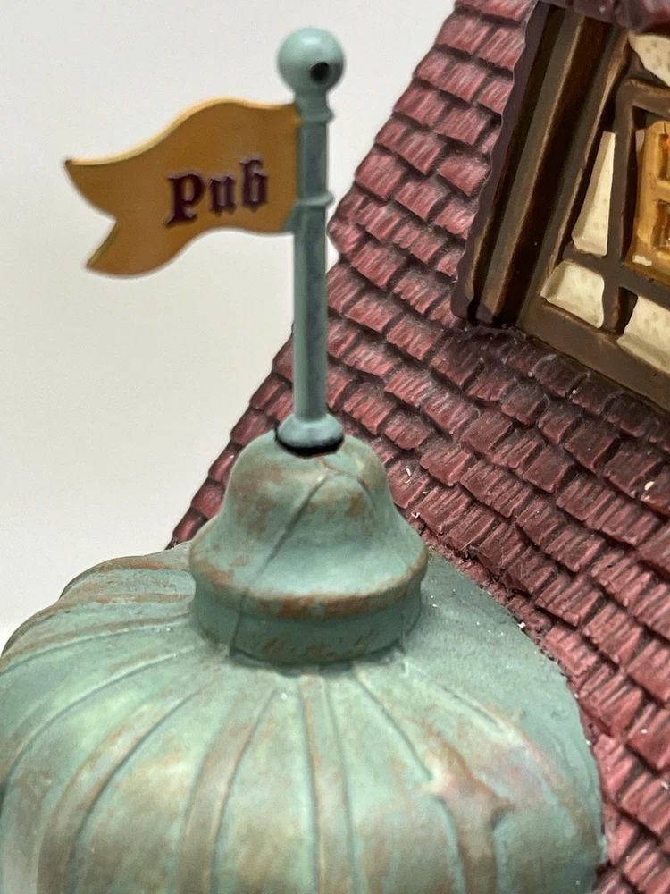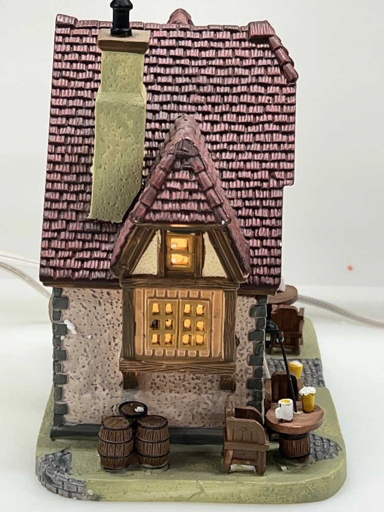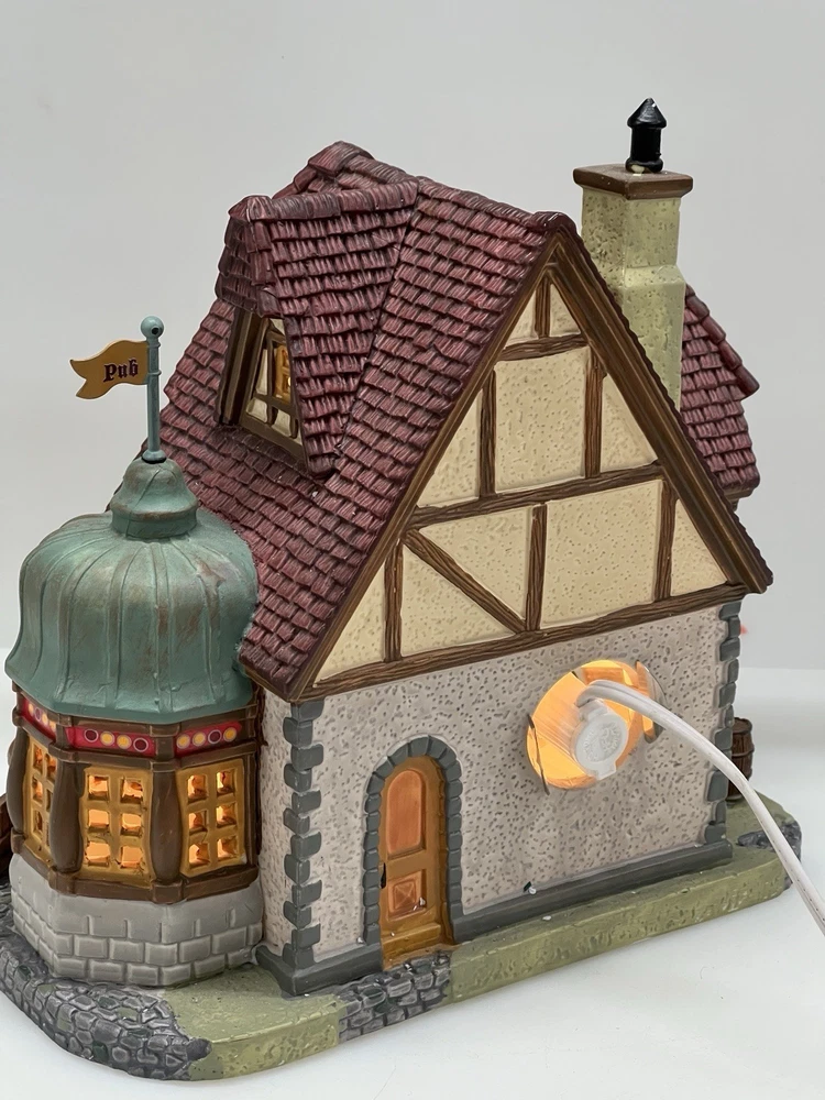 The Lemax Stein Haus Pub from Caddington Village is a medium-sized, hand-painted porcelain building featuring intricate Victorian-era architecture. This lighted Christmas village building is part of the Lemax Caddington Village Holidays & Seasons collection, with a colorful multicolor finish showcasing a beer boot and Bavarian specialty menu. Suitable for village display, this English-style building is perfect for adding a touch of mystery and romance to any room during the holiday season. With easy care instructions and a unique design, this collectible item is a must-have for Christmas decorations. Beautiful piece unfortunately missing umbrella over outside table . Comes with all original packaging including cord & light
