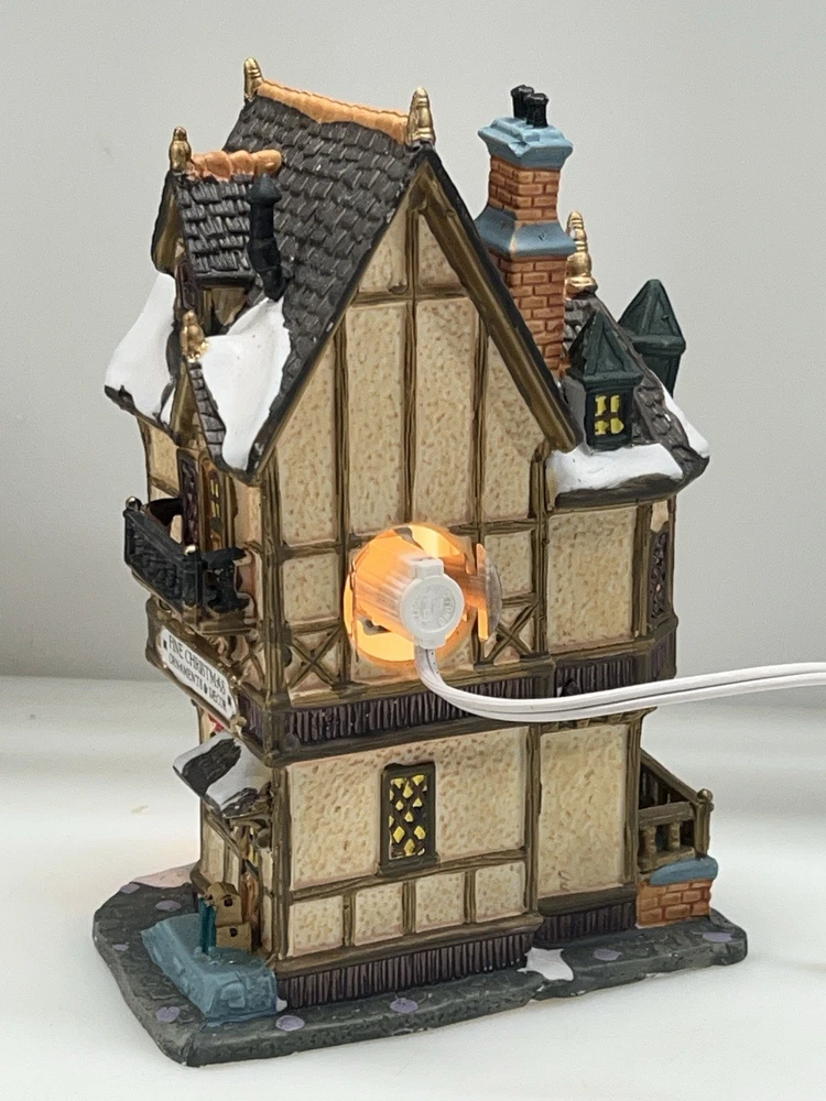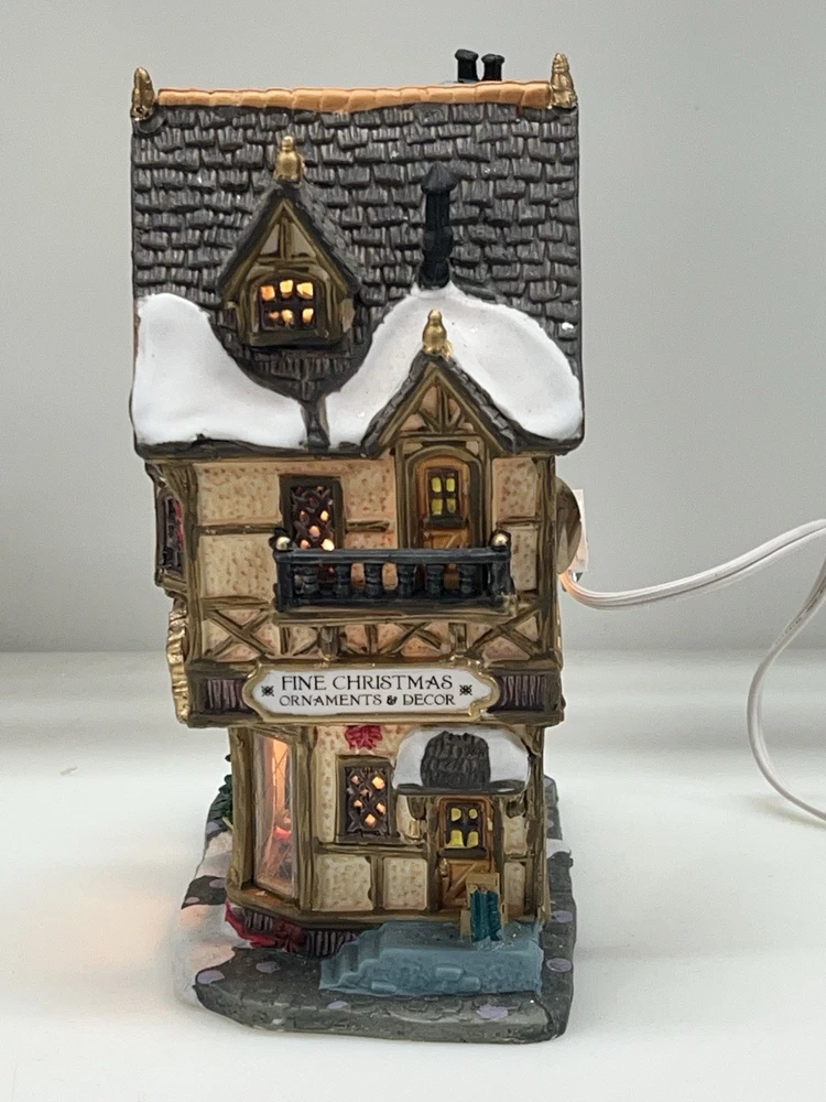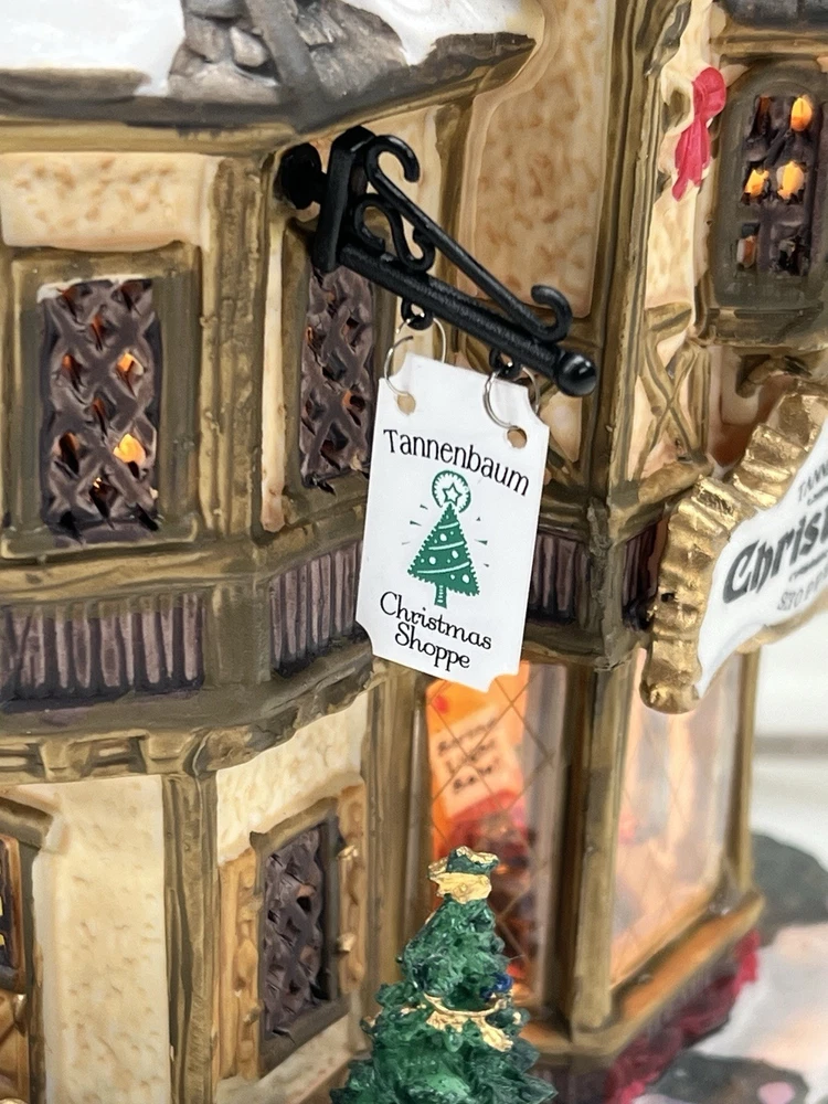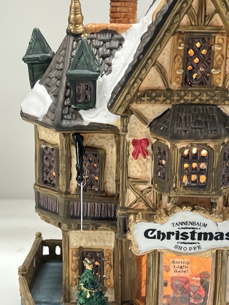 This is a rare and sought-after Lemax Christmas Village piece from the Carillon Decorative Products collection. The Tannenbaum Christmas Shoppe, manufactured in 2003, is a beautiful and intricate porcelain asymmetrical building with a whimsical pattern and multicolor finish. It measures 6 inches in length, 8-1/2 inches in height, and 4 inches in width and comes boxed with a light for easy display in any room. This piece is perfect for collectors of Christmas Shoppe-themed items and those looking to add a touch of Victorian style to their holiday decor. Absolutely incredible detail, design & color ! Perfect pristine condition! Includes all original packaging including cord & light !