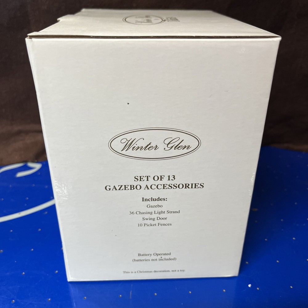 The Lemax Winter Glen by Dillard's Christmas "Set of 13 Gazebo Accessories" is a collection of ceramic and porcelain gazebo accessories designed for a Christmas village display. This set includes 13 pieces that are perfect for adding a festive touch to your holiday decor, with a winter theme and a focus on lighted Christmas trees. Made by the renowned brand Lemax, these accessories are sure to enhance the charm and whimsy of your seasonal display.