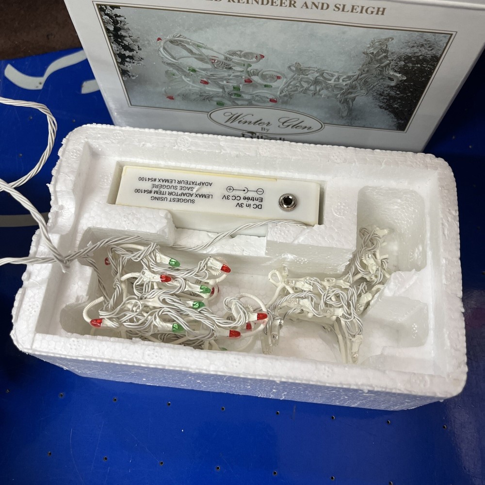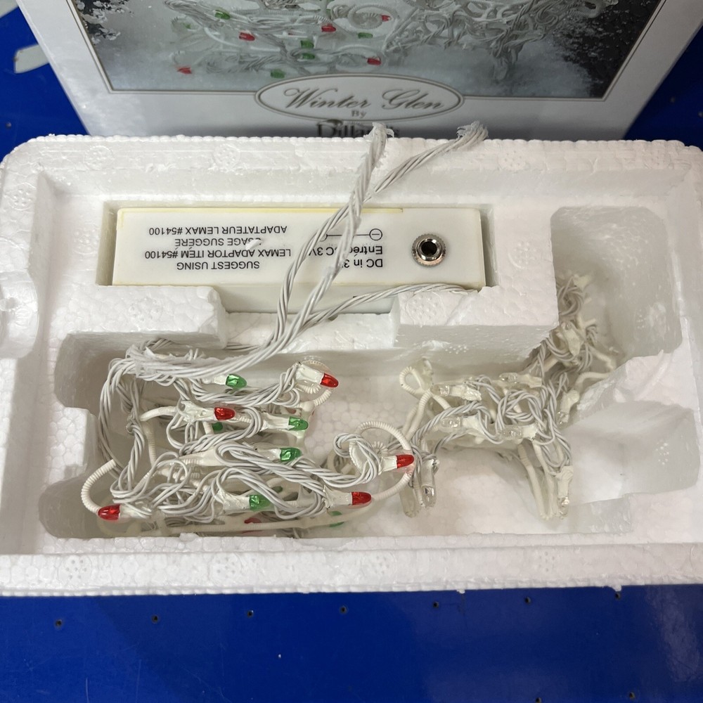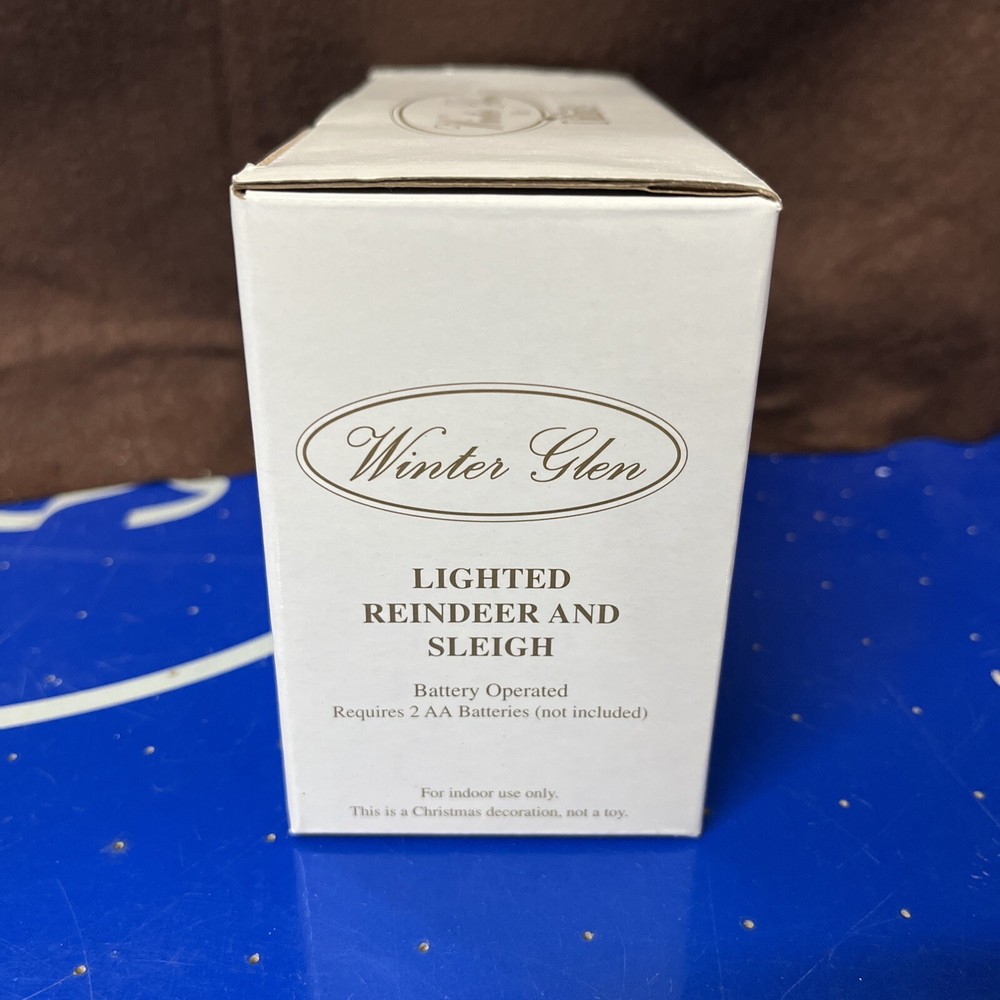 The Lemax Winter Glen by Dillard's Lighted Reindeer and Sleigh is a charming ceramic and porcelain Christmas village piece from the Winter Glen collection. This multicolor rectangle-shaped decoration depicts a festive scene perfect for the holiday season, with a traditional American style and seasonal theme. Manufactured in 2003, this original piece comes complete with its original box, making it a sought-after collectible for adults who appreciate holiday decor.
