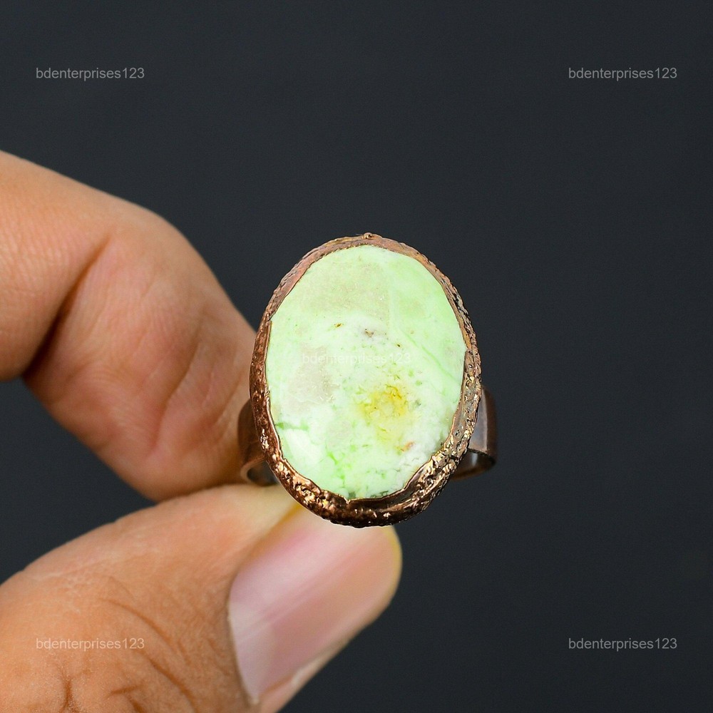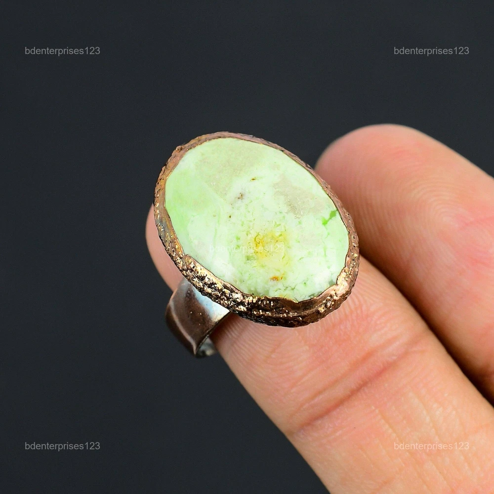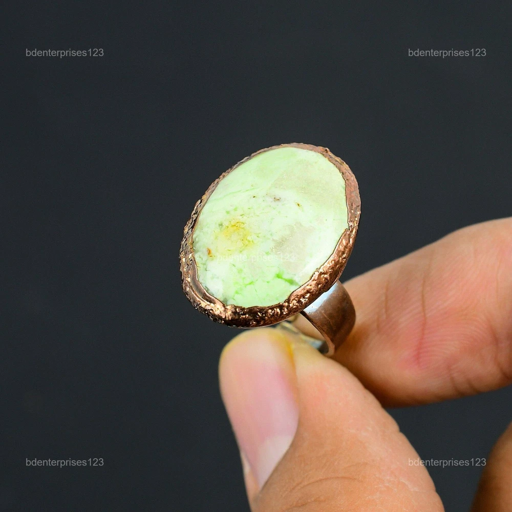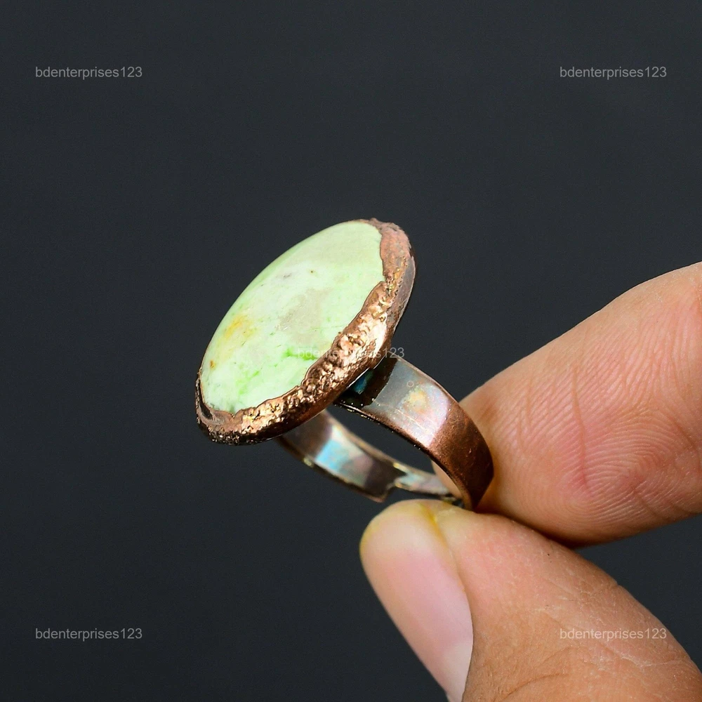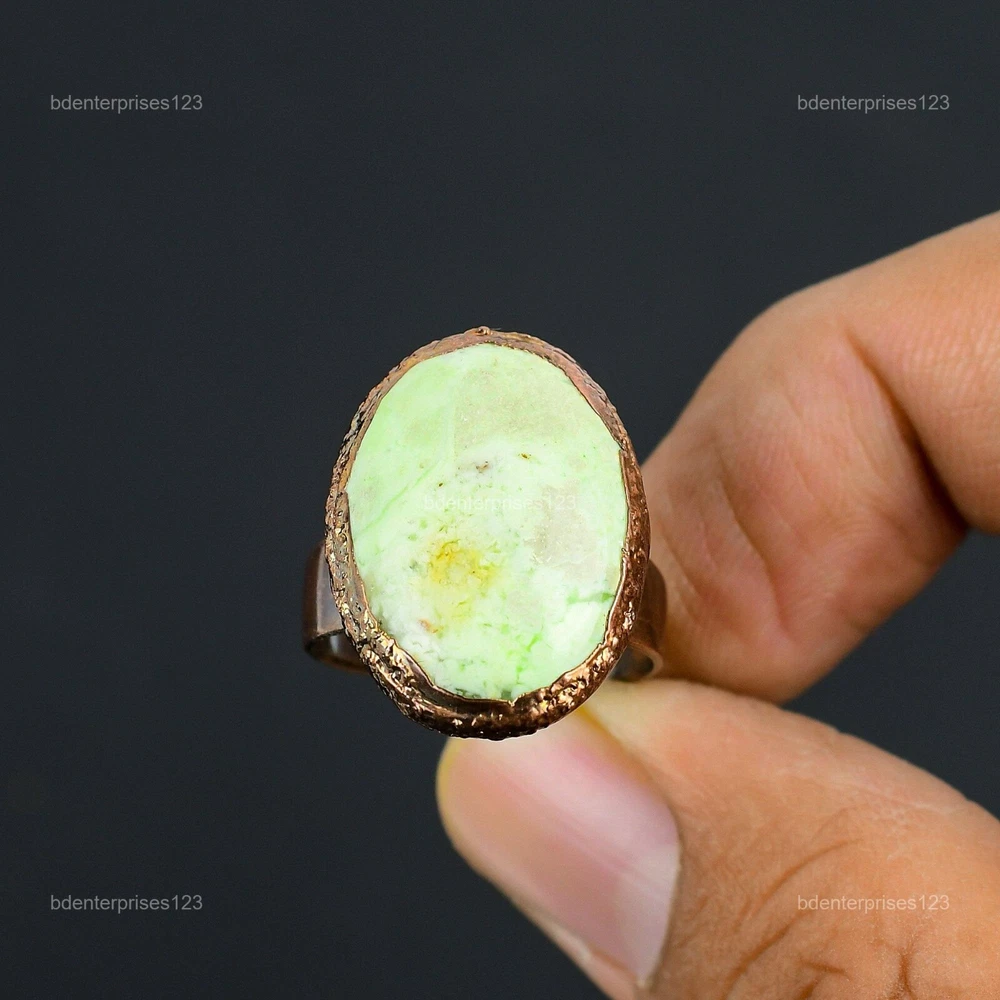 Welcome to bdenterprises123 Mothers day Sale Lemon Chrysoprase Stone Copper New Stackable Electroformed Ring Handmade Ring, Wire Wrapped Ring, Wire Wrapped Jewelry, Copper Pendant, Copper Wire Ring, Wrapped Jewelry, Wire Wrap Ring, Wire Wrap Jewelry SKU : HZR-74 Gemstone : Lemon Chrysoprase Stone Shape : Oval Metal Purity : Unknown Copper Ring Size : Adjustable US Adjustable : Yes Copper has been used for jewelry making for thousands of years, dating back to ancient civilizations such as the Egyptians, Romans, and Aztecs. Copper was valued for its beauty, versatility, and durability, and was often used to make everything from jewelry and coins to cookware and tools. In addition to its historical significance, copper jewelry also offers several benefits. Copper is a natural conductor of heat and electricity, which makes it ideal for energy healing and therapeutic purposes. Wearing copper jewelry is believed to have various health benefits, such as improving circulation, reducing inflammation, and boosting the immune system. Some people also believe that copper jewelry has the ability to balance energy and improve mood. For Mother's Day Gift For Father's Day Gift For Promise For Valentine's Day For Halloween Party For Christmas Day Gift For New Year Party For Mom For Her If you can't find the information you need or need some advice for your design? Feel free to contact us. We are fast to reply :) All our work is made by hand with Love and Care in our workshop Thank you so much for visiting and hope you enjoy shopping with us bdenterprises123 is committed to delivering the best quality sterling silver jewelry to customers. As a handmade jewelry manufacturer, we offer an extensive selection of copper gemstone jewelry that showcases the brilliance of our craftsmanship. We are an experienced handmade jewelry supplier with expertise in embellishing gemstones to suit every style. We offer you the liberty to create your jewelry ensemble with sparkling, earthy, and pure gemstones. Our Talented artisans masterfully handcraft each piece of jewelry you see here. Our pieces are made with genuine gemstones. The one-of-a-kind piece you see here is the same exact piece you will receive.