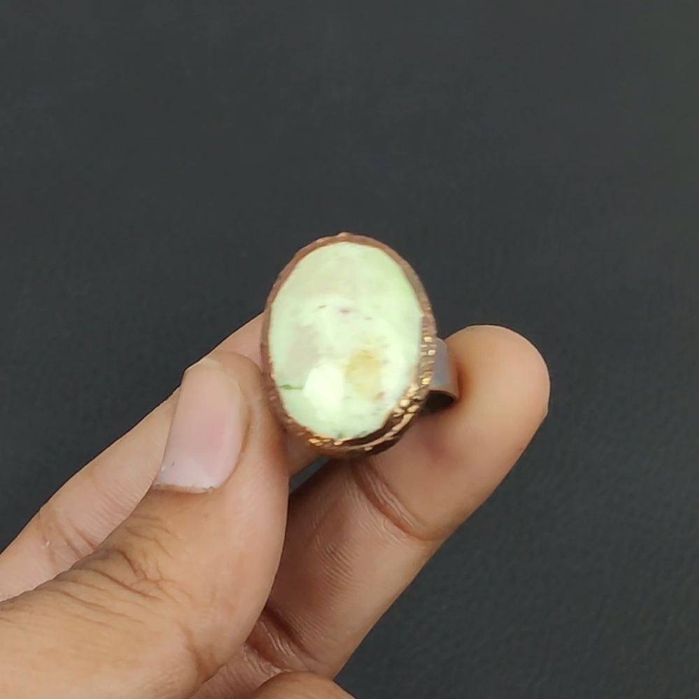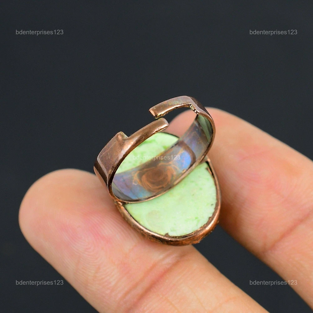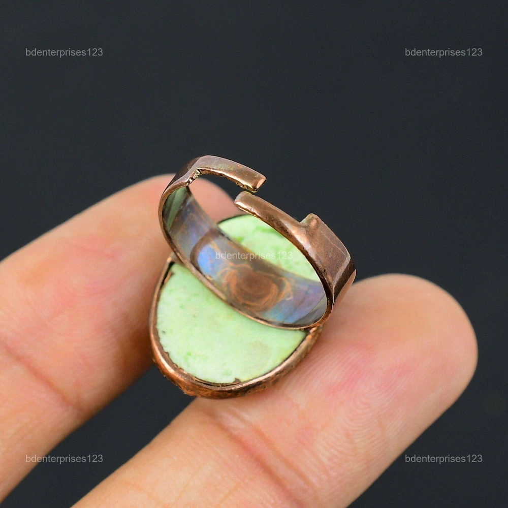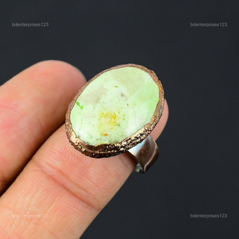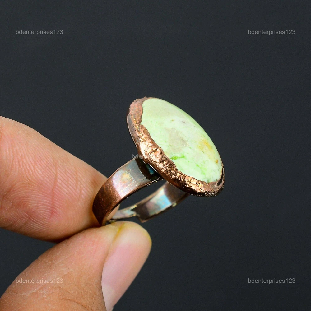Welcome to bdenterprises123 Mothers day Sale Lemon Chrysoprase Stone Copper New Stackable Electroformed Ring Handmade Ring, Wire Wrapped Ring, Wire Wrapped Jewelry, Copper Pendant, Copper Wire Ring, Wrapped Jewelry, Wire Wrap Ring, Wire Wrap Jewelry SKU : HZR-74 Gemstone : Lemon Chrysoprase Stone Shape : Oval Metal Purity : Unknown Copper Ring Size : Adjustable US Adjustable : Yes Copper has been used for jewelry making for thousands of years, dating back to ancient civilizations such as the Egyptians, Romans, and Aztecs. Copper was valued for its beauty, versatility, and durability, and was often used to make everything from jewelry and coins to cookware and tools. In addition to its historical significance, copper jewelry also offers several benefits. Copper is a natural conductor of heat and electricity, which makes it ideal for energy healing and therapeutic purposes. Wearing copper jewelry is believed to have various health benefits, such as improving circulation, reducing inflammation, and boosting the immune system. Some people also believe that copper jewelry has the ability to balance energy and improve mood. For Mother's Day Gift For Father's Day Gift For Promise For Valentine's Day For Halloween Party For Christmas Day Gift For New Year Party For Mom For Her If you can't find the information you need or need some advice for your design? Feel free to contact us. We are fast to reply :) All our work is made by hand with Love and Care in our workshop Thank you so much for visiting and hope you enjoy shopping with us bdenterprises123 is committed to delivering the best quality sterling silver jewelry to customers. As a handmade jewelry manufacturer, we offer an extensive selection of copper gemstone jewelry that showcases the brilliance of our craftsmanship. We are an experienced handmade jewelry supplier with expertise in embellishing gemstones to suit every style. We offer you the liberty to create your jewelry ensemble with sparkling, earthy, and pure gemstones. Our Talented artisans masterfully handcraft each piece of jewelry you see here. Our pieces are made with genuine gemstones. The one-of-a-kind piece you see here is the same exact piece you will receive.