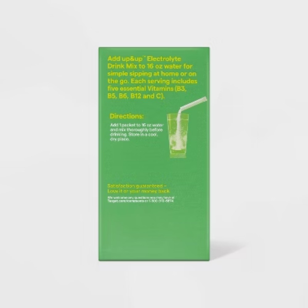 Description Keep yourself hydrated at home or on the go with the Lemon Lime Flavored Electrolyte Drink Mix from up&up™. This electrolyte drink mix comes in a lemon lime flavor with other natural flavors to enhance its taste. Gluten-free and vegan, these 30 drink mix packets are an excellent source of vitamins B3, B5, B6, B12 and vitamin C. up&up™: We believe making smart choices for the people, places, and pets in your life should be easy and affordable. And, having quality you can trust should be a given. That’s why you can count on our promise – caring for your everyday in every way. Satisfaction guaranteed – Love it or your money back. highlights Packaging may vary. Same trusted quality 30pk lemon lime electrolyte drink mix Excellent source of vitamins B3, B5, B6, B12 and vitamin C With electrolytes to support hydration Gluten free and vegan Non-GMO Project Verified