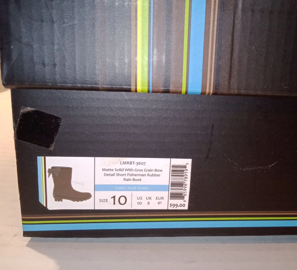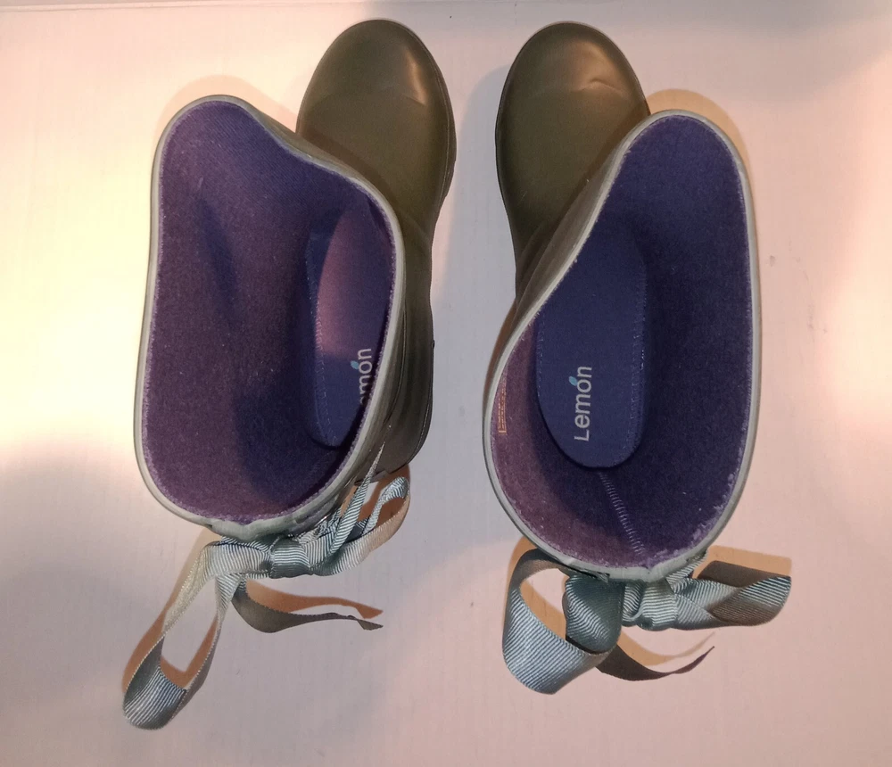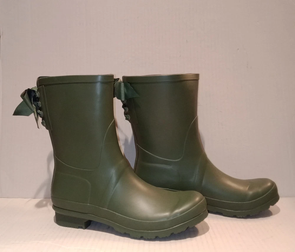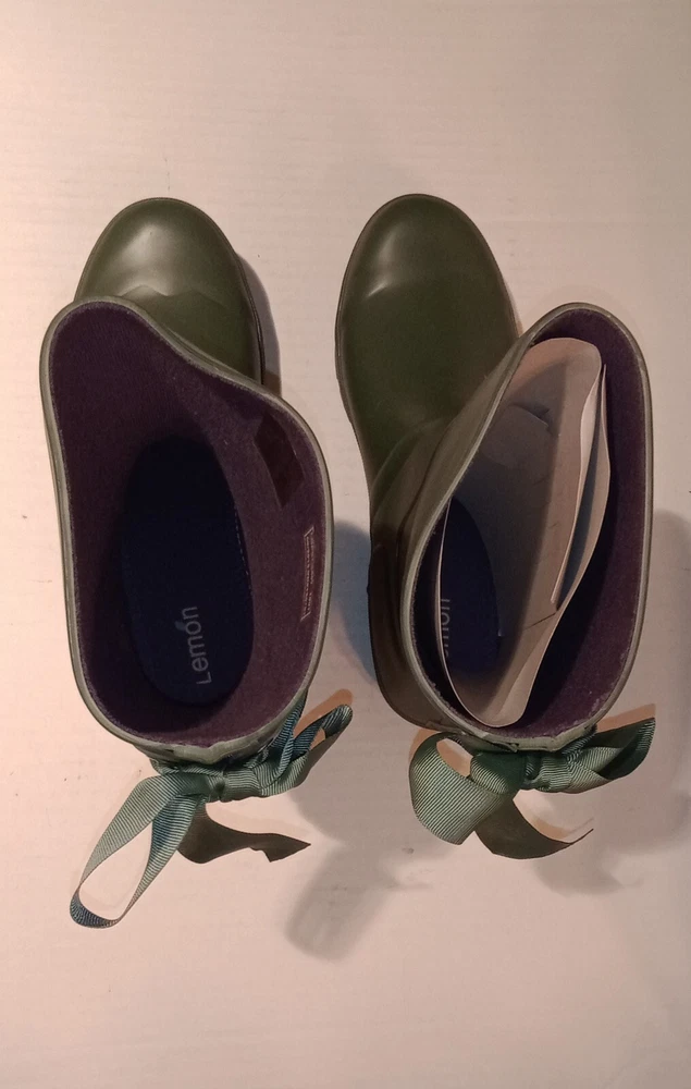 Lemon Lace-Up Rubber Rain Boots, LMBRT-3607, Duck Green Women's Size 10 $99 NIB. Stylish fisherman design with a feminine gros grain ribbon lace-up in the back. Utilitarian. Pull-On construction. The ribbon is only decorative. They don't open at the back. Excellent condition, never worn, just stored in the box with no major flaws, damage, etc noted. Zoom in. See pics. Smoke free,pet free household.... Please see my other quality items including designer handbags, designer shoes, designer, vintage, semi-precious jewelry, Swiss watches, apparel, and home goods, etc. Thanks for looking.