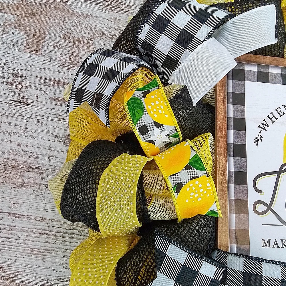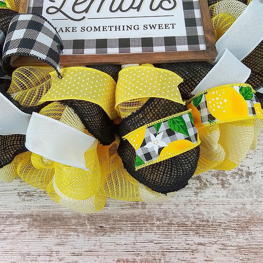 This lemon wreath will make a wonderful addition to your summer decor or a thoughtful gift for that special birthday. Use it for your own beach wreath, a summer wreath, a pool wreath or lake house decor! Thank you so much for visiting my shop and for considering pieces that allow my passion to make your home even more beautiful. Please message me with any questions before purchasing. This wreath measures approximately 24 inches round and approximately 5" deep. This ready to ship wreath is made with yellow and jute mesh and accented with several coordinating ribbons to showcase the wooden lemon sign in the center (that is removable). Want something more custom or have questions? Send me a message...the backbone of my business is custom creations! Purchase with confidence in a seller with excellent reviews and over 15,000 sales between all selling venues. Indoor and outdoor pieces but my wreaths do appreciate a little shelter from the elements to stay in pristine condition.
