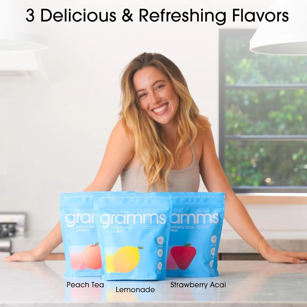 Clear Protein Powder, Lemonade | 20g Grass-Fed Whey Isolate, Bulk Description Features: Designed for Women, by Women: Created by two female founders, gramms women's protein powder makes it easy to meet your 100g daily protein goal. This whey protein powder for women supports muscle recovery, satiety, and energy without the bloating or heaviness of traditional shakes. Clean, Simple Ingredients: Made with simple, non-gmo ingredients, our whey isolate protein powder is triple-filtered to remove carbs, fat, and lactose. With zero sugar, no artificial additives, and no fillers, gramms is a clear whey isolate protein option that delivers pure, high-quality protein without unnecessary extras. Effortless Mixing & Smooth Taste: No more thick, milky shakes! Our protein juice powder dissolves into a refreshing, light drink with no chalky texture. Simply shake with room-temperature water, let it settle, and enjoy a clear protein water mix that’s smooth, delicious, and easy to sip anytime. Gentle on Digestion: Unlike traditional shakes, our clear whey isolate protein powder is lactose-free, fast-absorbing, and free from gut-disrupting fillers.Whether you need a clear protein powder for women, an easy-to-digest protein water powder, or a fruity protein powder, we support your gut without bloating. Ultra-Lean Nutrition: With 20g of protein and only 80 calories per serving, this is one of the most efficient iso whey protein powder options. Its 4:1 calorie-to-protein ratio supports lean muscle and boosts fullness, helping you curb cravings and avoid energy crashes throughout the day. A Women-Owned Brand with a Mission – As women, we discovered that protein is key to energy, lean muscle support, and balanced cravings—but women aren't always taught this early in life. That's why we created gramms: a clear protein powder for water that’s clean, crave-worthy, and effortless to fit into a daily routine. Product Details: Package Dimensions : 9.09 x 8.43 x 2.44 inches; 1.01 Pounds Manufacturer : gramms Country of Origin : USA Brand: GRAMMS Flavor: Lemonade Item Weight: 457 Grams Unit Count: 16.12 Ounce Number of Items: 1 Handling We will ship all orders within 1 business day of payment. Delivery We Do Not Ship Outside of the Continental US. Return Policy All items qualify for returns within 30 days of receipt. Buyer is responsible for return shipping on any item that is not damaged. Feedback We take our reputation seriously, we buy and sell online, so we understand the value of trust. If you are unsatisfied with your order, please contact us and we will work with you to resolve it to your satisfaction.