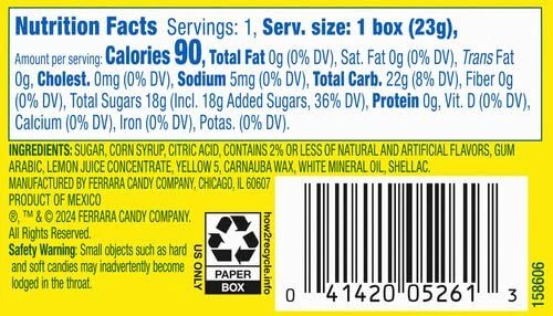Product Description Get ready to pucker up with Lemonhead Hard Lemon Candy in a pack of 24 treat-size boxes! These iconic candies have been a favorite since the 1960s, delivering a tangy and sweet lemon flavor in every bite. Each box contains 0.8 ounces of candy, making them the perfect size for snacking on-the-go, sharing with friends, or adding to gift bags. The small size also makes them ideal for portion control and enjoying a guilt-free treat. The hard candy texture ensures long-lasting flavor and a satisfying crunch. Whether you're a die-hard Lemonhead fan or simply looking for a tasty treat, Lemonhead Hard Lemon Candy in treat-size boxes is the perfect choice. So why wait? Add them to your cart today and experience the tangy, sweet goodness for yourself!