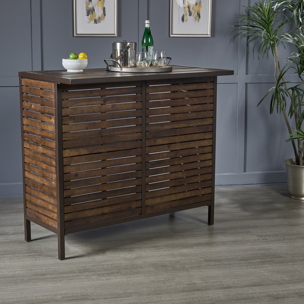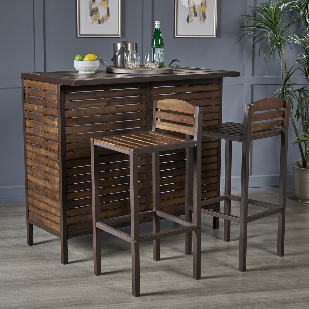This Acacia Bar Set is great for hosting all types of events. This bar set is perfect for all of your hosting dreams, and even comes with the table and chairs sold separately to accommodate all of your seating and hosting needs.Includes: One (1) table and two (2) chairsMaterial: PE Wicker, powder coated ironColor: Dark Brown + Rustic MetalAssembly required: YesTable dimensions: 18 inches high x 16 inches wide x 16 inches deepChair dimensions: 35.50 inches high x 22 inches wide x 22.50 inches deep Free Shipping Over $49.99* Details Leni 3-Piece Acacia Wood Bar Set by Christopher Knight Home Product Description: This Acacia Bar Set is great for hosting all types of events. This bar set is perfect for all of your hosting dreams, and even comes with the table and chairs sold separately to accommodate all of your seating and hosting needs. IncludesOne (1) table and two (2) chairs MaterialPE Wicker, powder coated iron ColorDark Brown + Rustic Metal Assembly requiredYes Table dimensions18 inches high x 16 inches wide x 16 inches deep Chair dimensions35.50 inches high x 22 inches wide x 22.50 inches deep