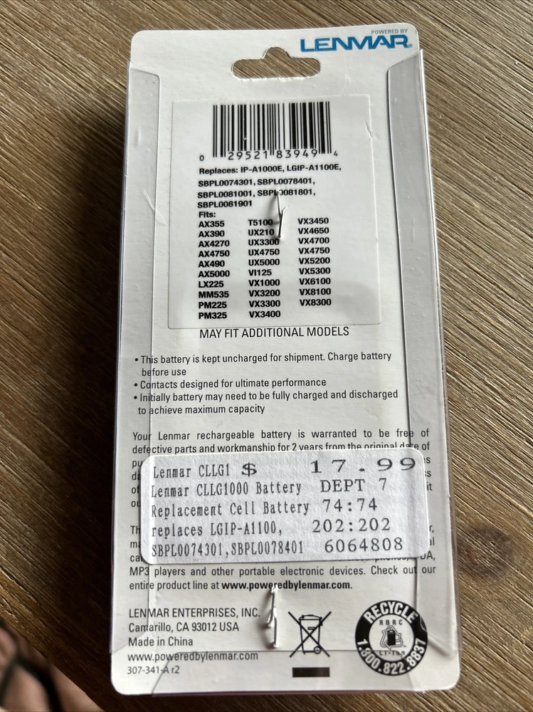 Lenmar CLLG1000 Cell Phone Battery Lithium Ion 3.7V 900mAh New Sealed