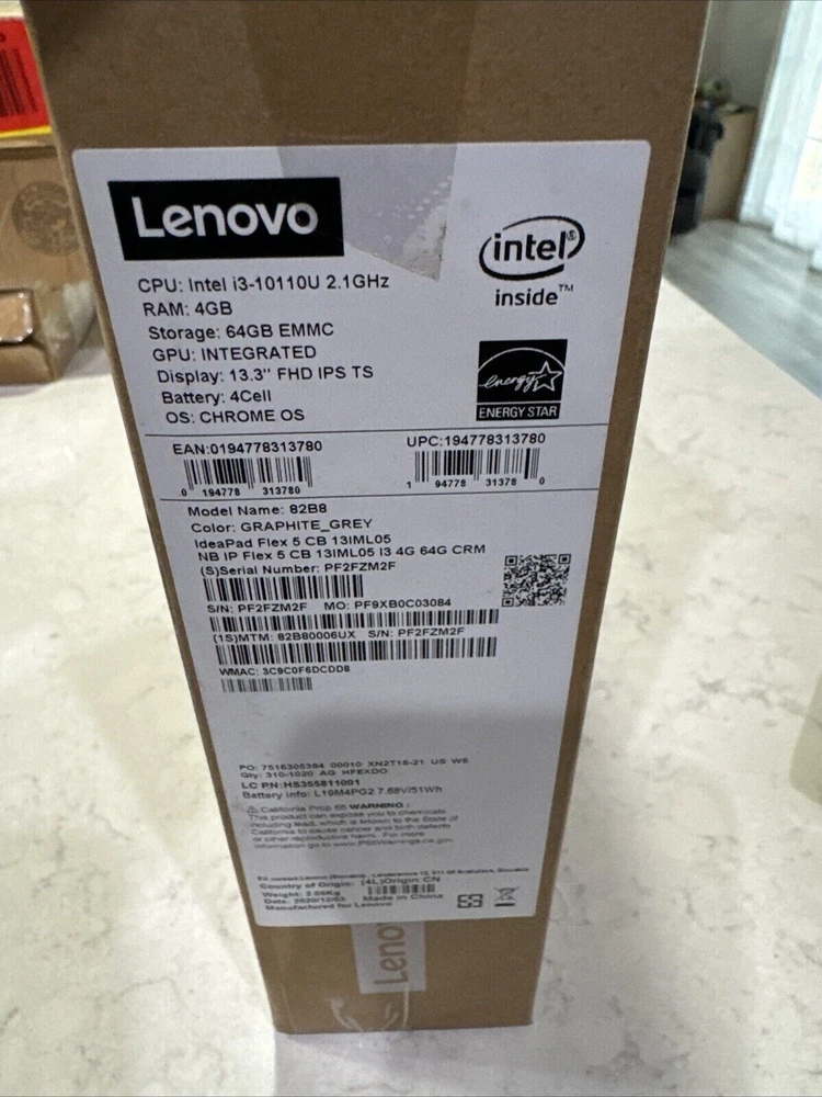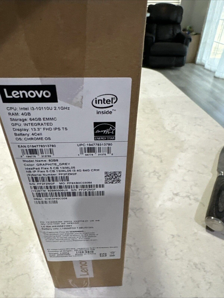Lenovo Chromebook Flex 5 13" - 4GB RAM, 64GB SSD - Touchscreen 2-in-1 Upgrade your productivity with the Lenovo Chromebook Flex 5 ! This 13.3" Full HD touchscreen convertible laptop offers the flexibility of a tablet and the power of a laptop. With 4GB RAM and 64GB SSD , it’s perfect for browsing, streaming, and light work. The Intel Core i3 processor ensures smooth performance, while Chrome OS keeps things fast and secure. Ideal for students, professionals, or casual users! Great condition & fast shipping! Convertible 2-in-1 Design Full HD Touchscreen Lightweight & Portable Includes Laptop and Charger Buy now before it's gone!